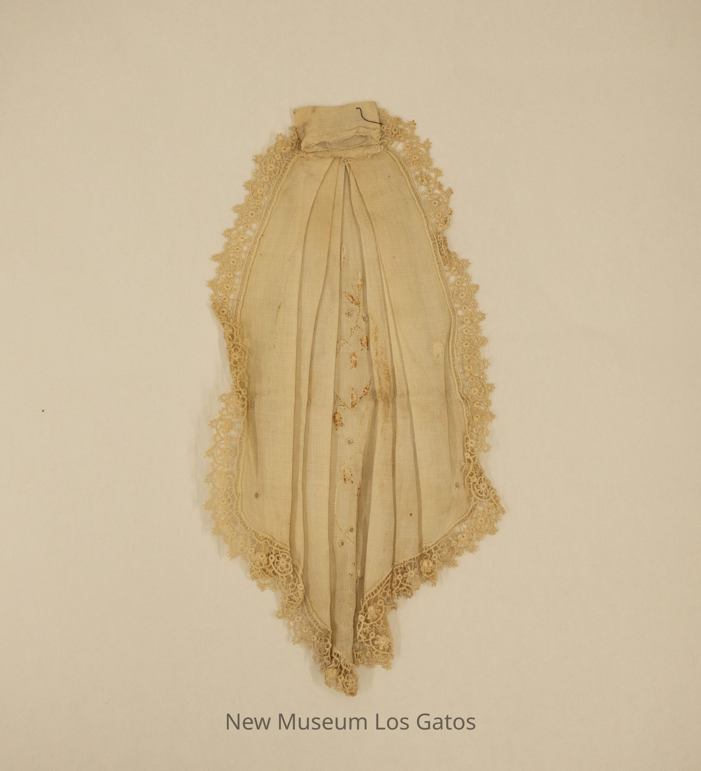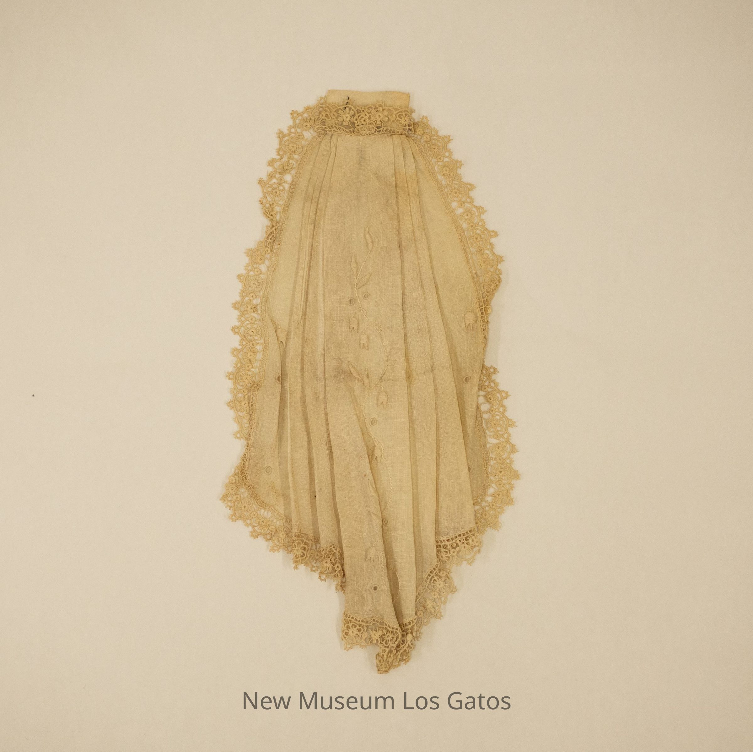 An off-white, linen dickey. The dickey has floral embroidery in the center, and lace trim around all edges. The dickey has three vertical pleats on both sides of the center embroidery.Collection