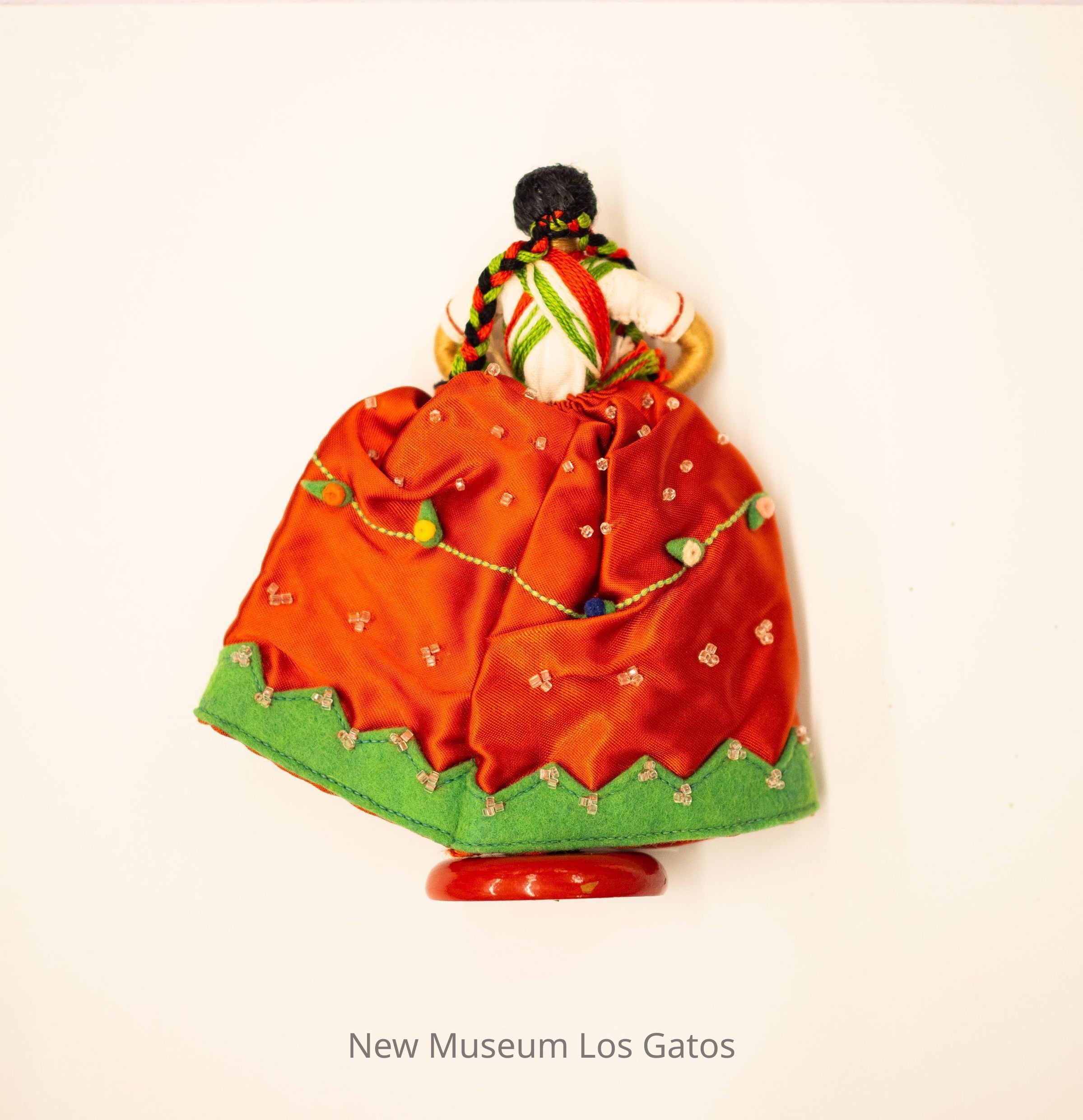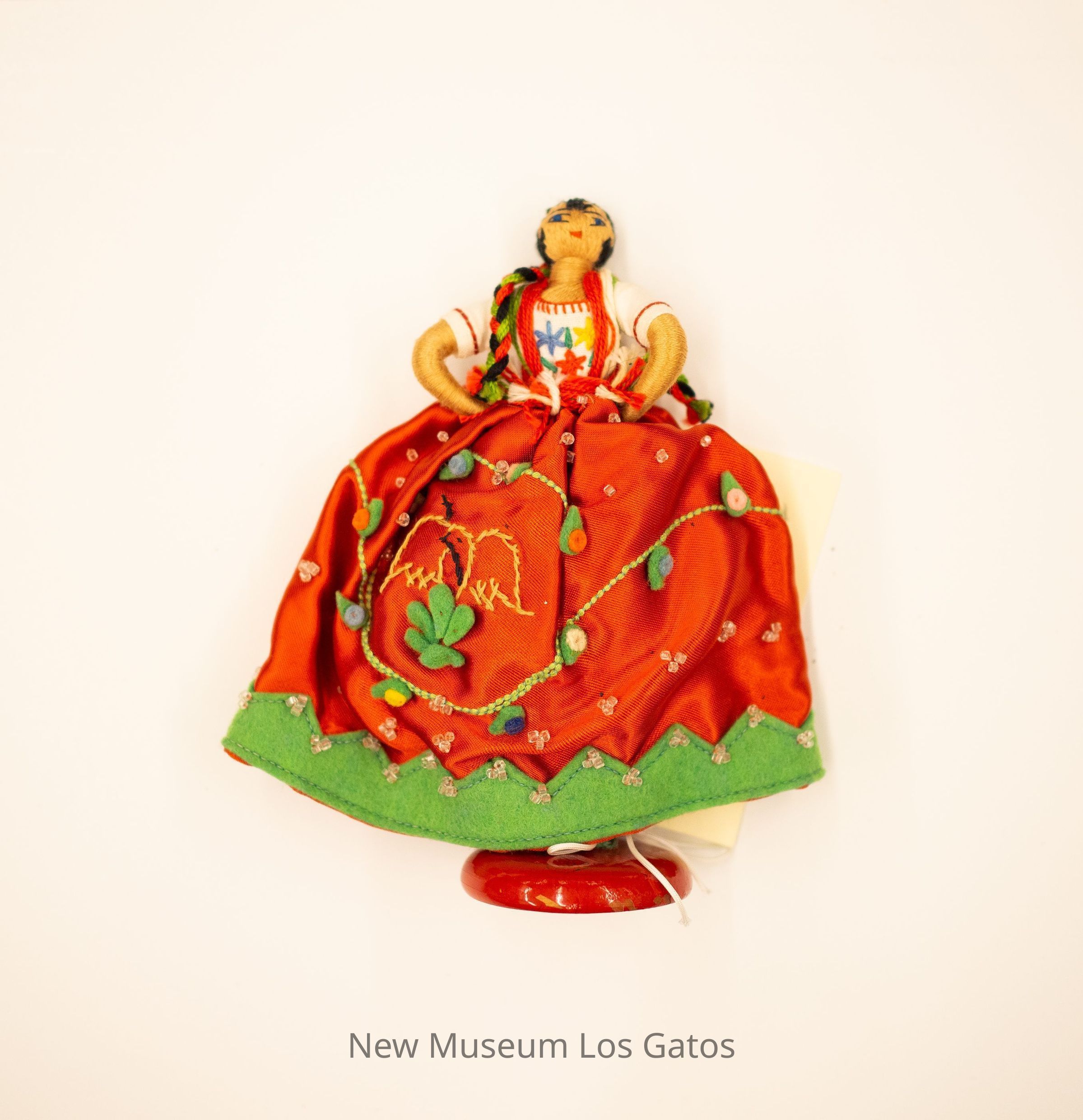A female Mexican doll. The doll is made of bound thin tan yarn or embroidery floss and fabric dress. The dress is red, embroidered with flowers, vines, and birds on the front, beaded throughout, and has a strip of green felt lining the hemline. The doll's hair is long and black yarn, woven in with red and green yarn. The bodice of the dress is white, with red, green, yellow, and blue flowers. The doll is attached to a red wooden base. The doll's petticoat is packed with tissue paper to fill out shape. The doll's eyes are blue and lips are red.Collection