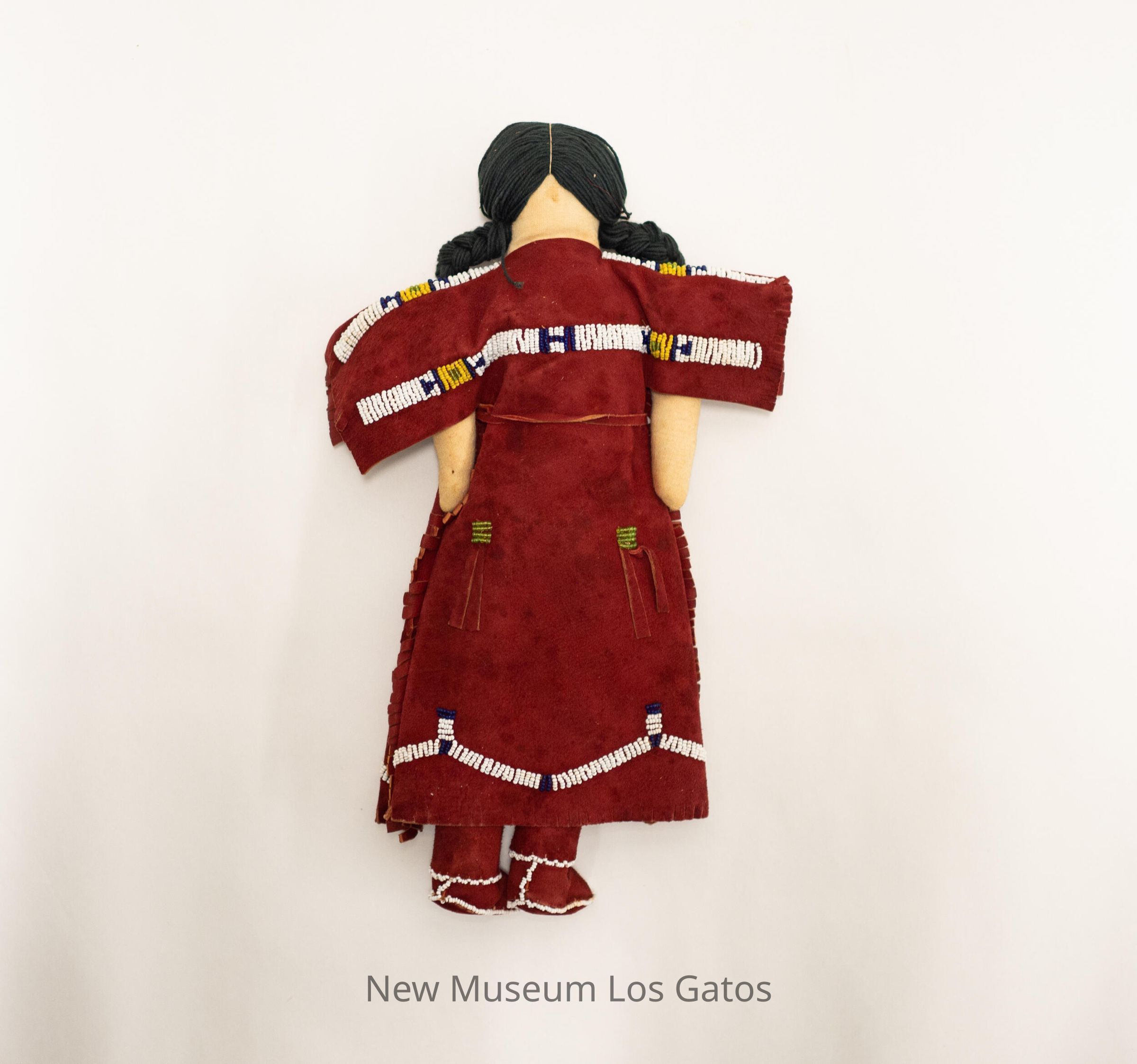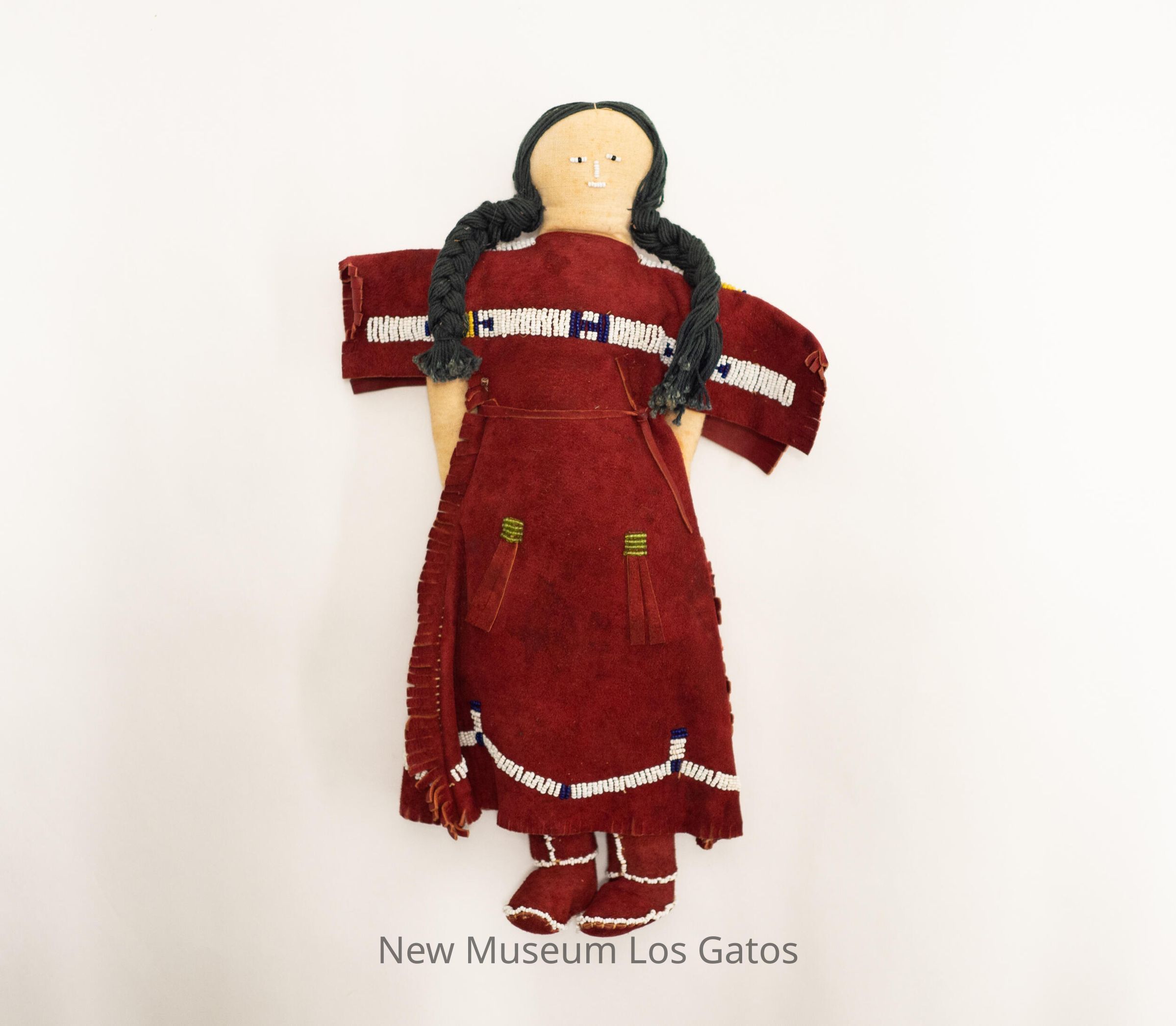 A large, Indigenous female doll. The doll is wearing a red dress and red boots, with white beaded detailing along the boots, and white, green, yellow, and blue beaded detailing along the bottom of the dress and the top of the dress. The dress also has fringe along the sides of the dress and edges of the sleeves. The doll's hair is made out of black braided yarn, and has a face comprised of beads.Collection