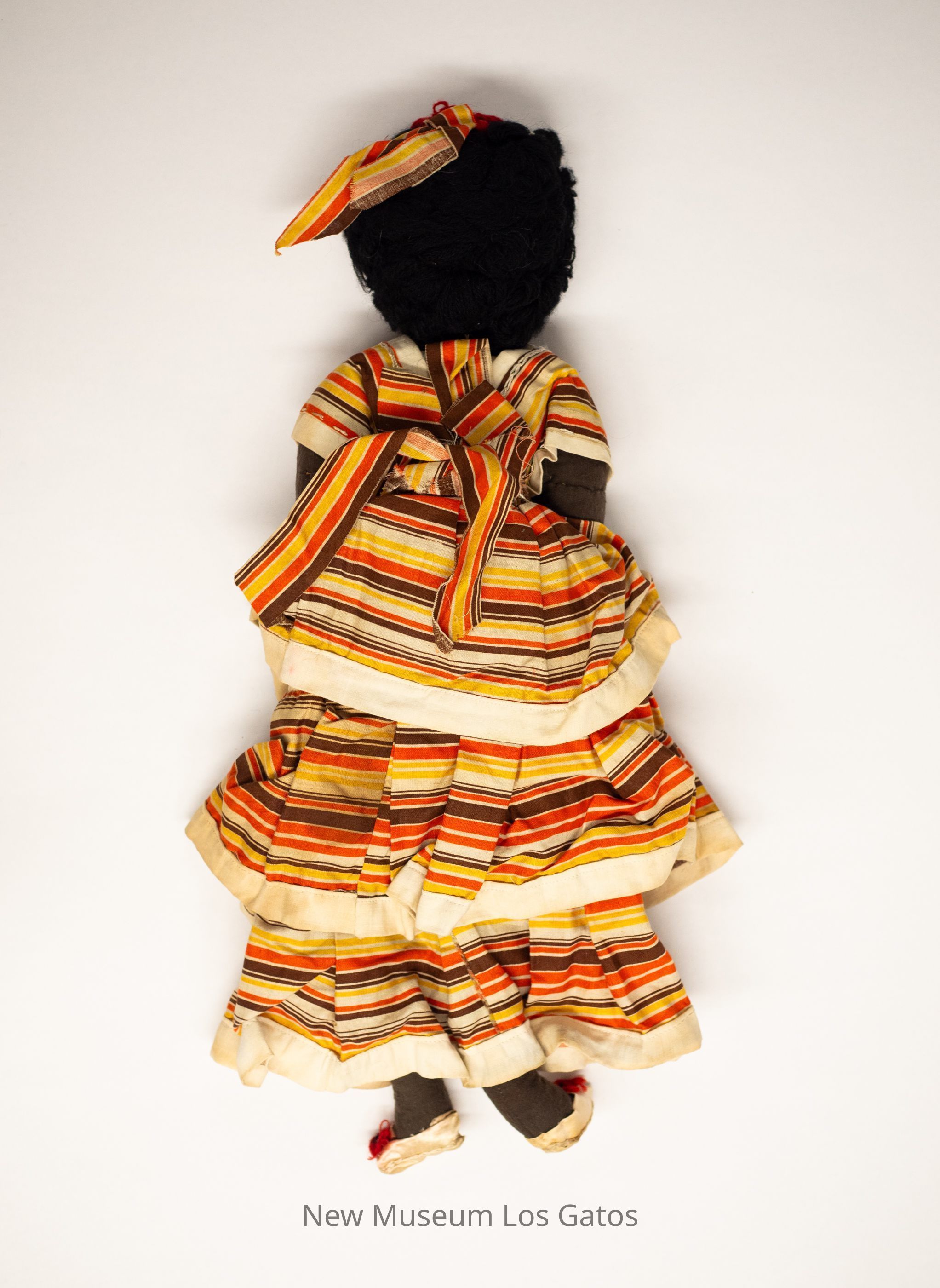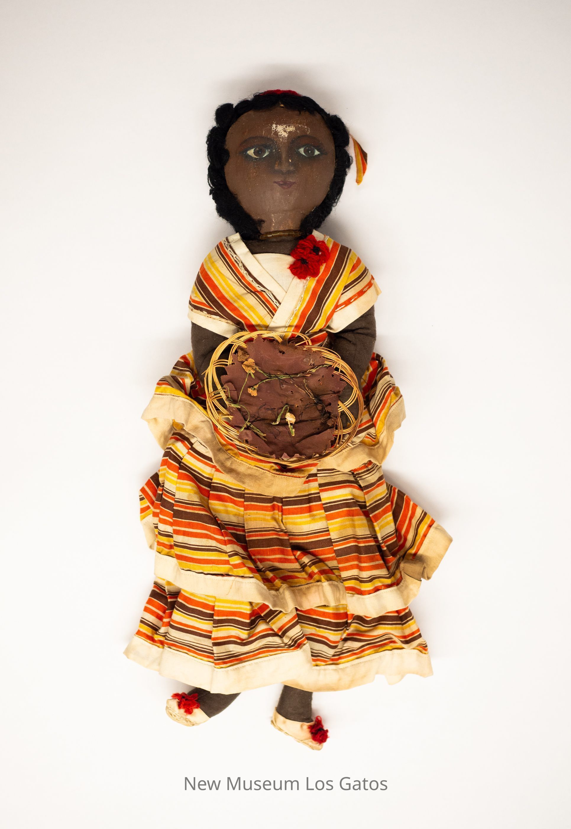 A large, fabric female doll. The doll is wearing white shoes with red bows, as well as a multi-tiered white, brown, orange, and yellow striped dress. There is a bow in the back of the dress, made out of the same pattern and fabric. There are also two red flowers with black centers near the left shoulder. The doll is wearing a brown beaded necklace, and a red decoration with striped tails in her black hair. She is holding a woven basket with brown fabric and pink and green flowers with both hands, in front of her body. Her facial features are painted on.Collection
