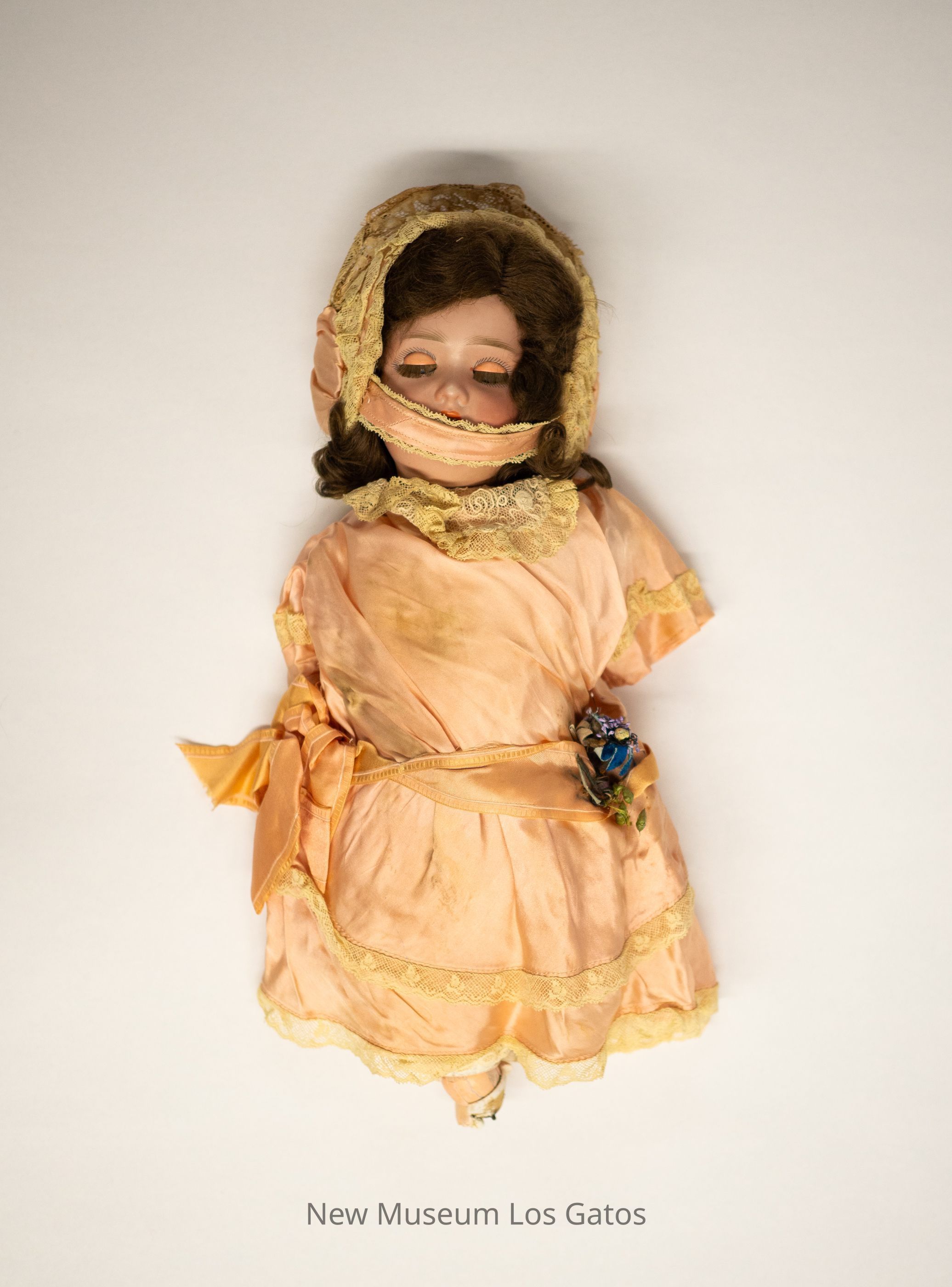 A large, bisque female doll. The doll is wearing white shoes and a pink, multi-tiered dress with white lace accents. There is a pink sash around the doll's waist, with a large pink bow on one end and a blue and purple flower on the other end. The doll has brown curly hair, underneath a pink bonnet with lace detailing. The doll's eyes open and close as the doll is raised and lowered. The doll's limbs have become completely separated from its body, and some have disjoined even further.Collection