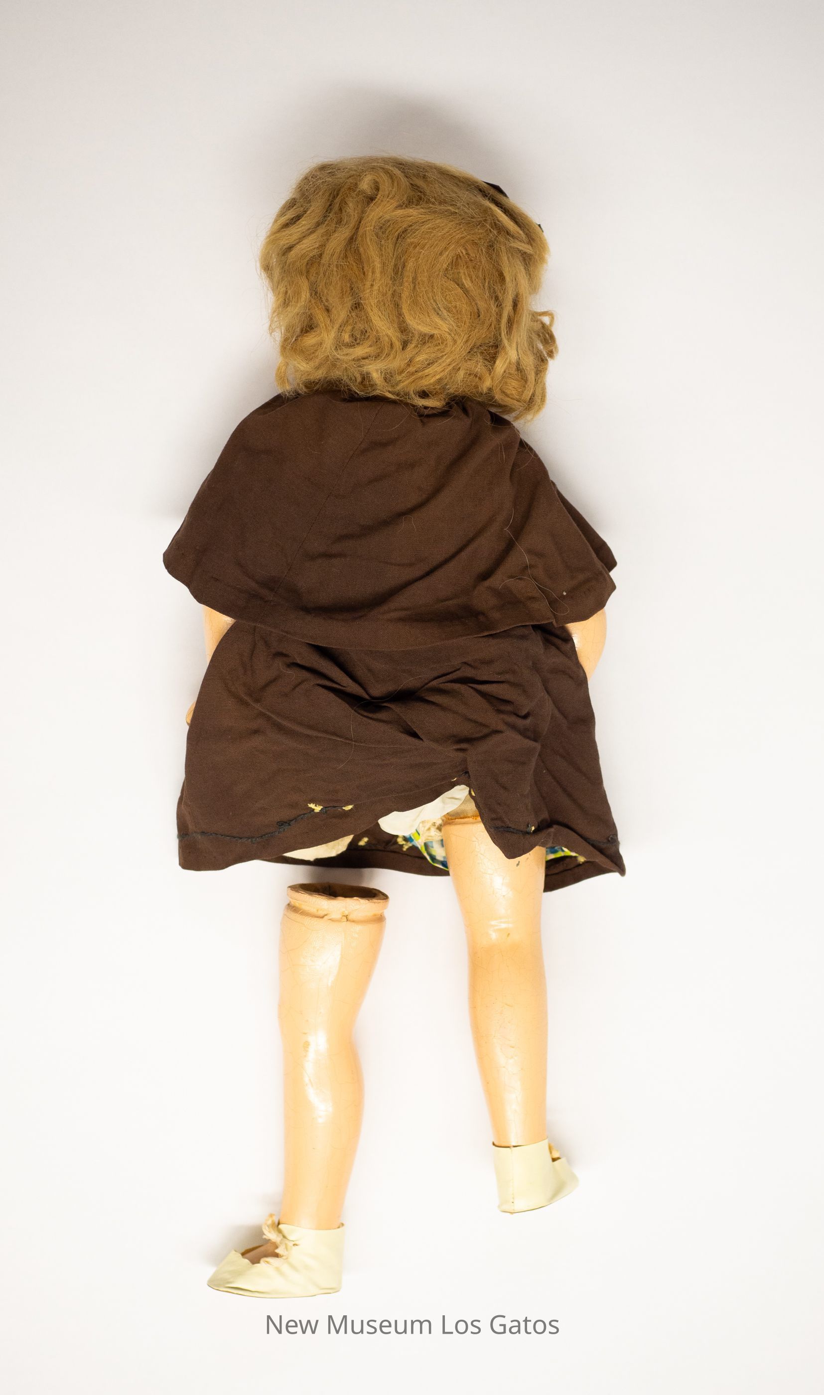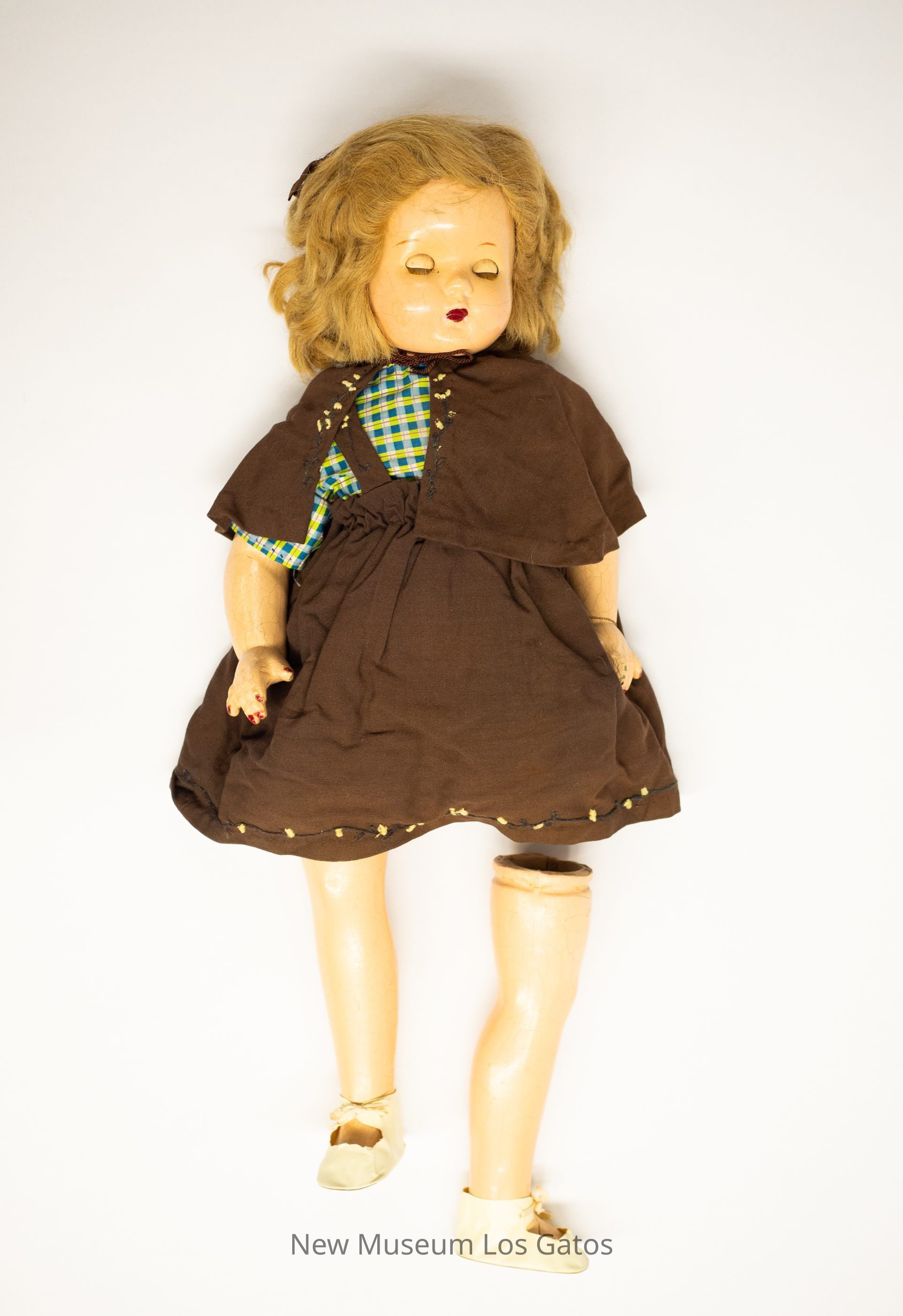 A large, composite female doll. The doll is wearing white shoes and a brown overalls-style dress with a brown capelet, over a green and blue plaid shirt. The hem and straps of the dress, as well as the edges of the capelet feature olive and yellow decorative embroidery. She has light brown hair, with a brown bow in her hair. The doll's eyes open and close as the doll is raised and lowered. The doll's left leg has become separated from its body.Collection