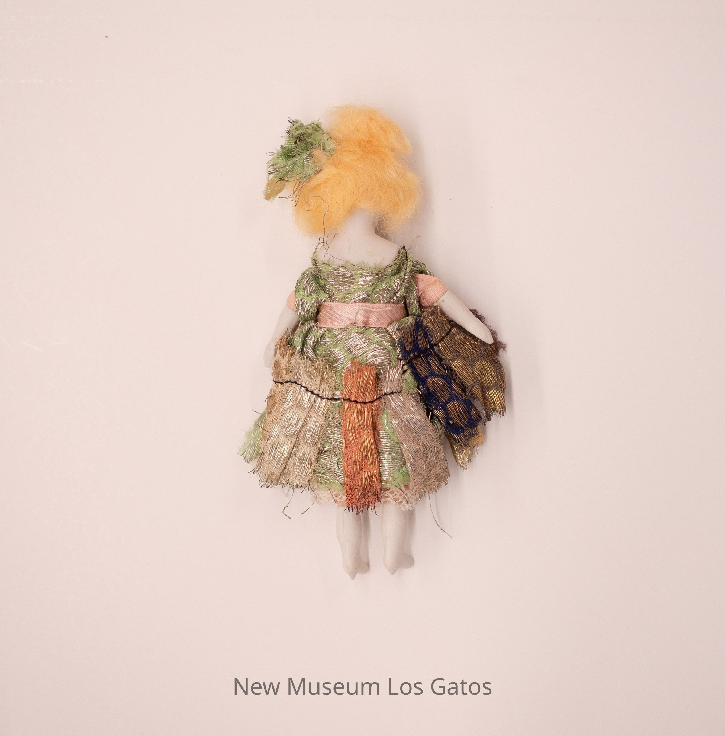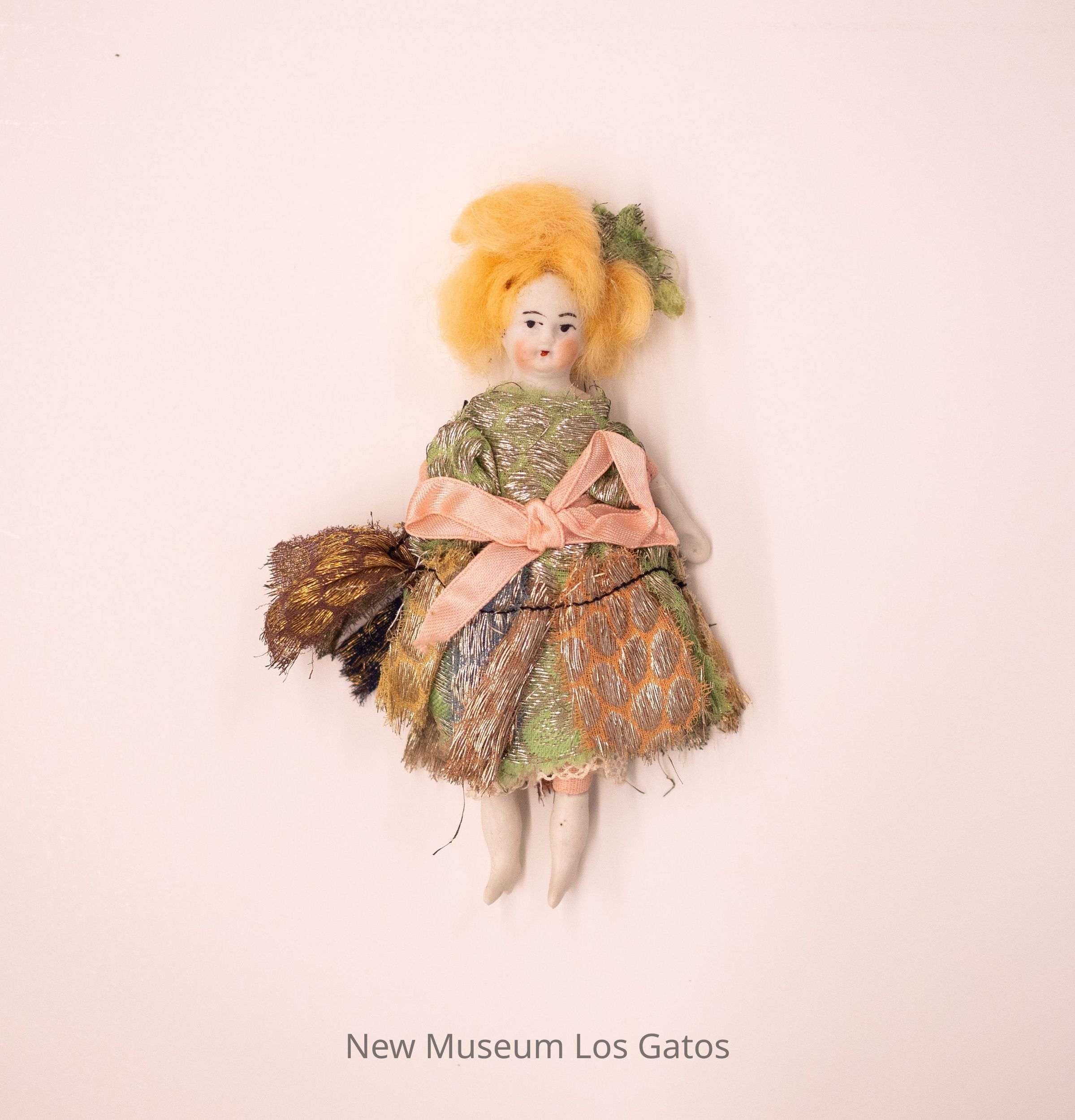 A small female porcelain and fabric doll. The doll has blonde hair, and is wearing a green dress with brown, pink, blue, and yellow strips on the skirt and a large pink bow on the front. The doll has a green fabric decoration in her hair. The dress has golden thread decorations throughout. The dolls eyes are black, the cheeks and lips are pink.Collection