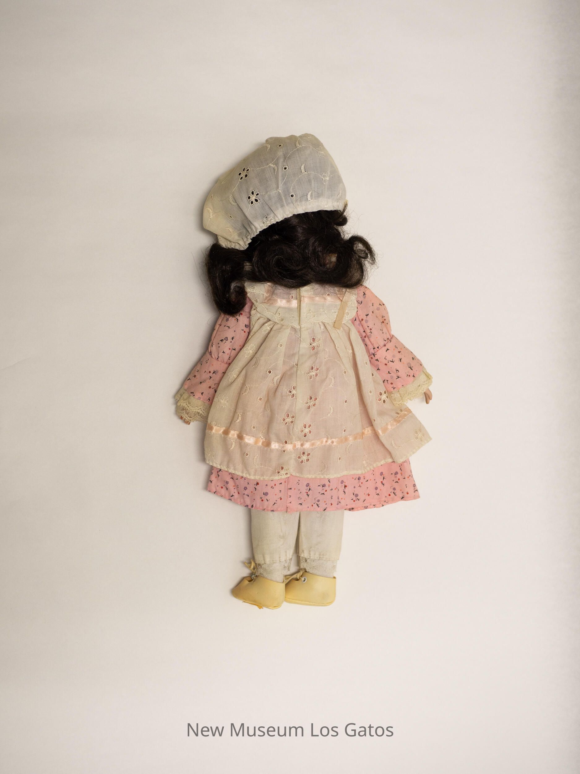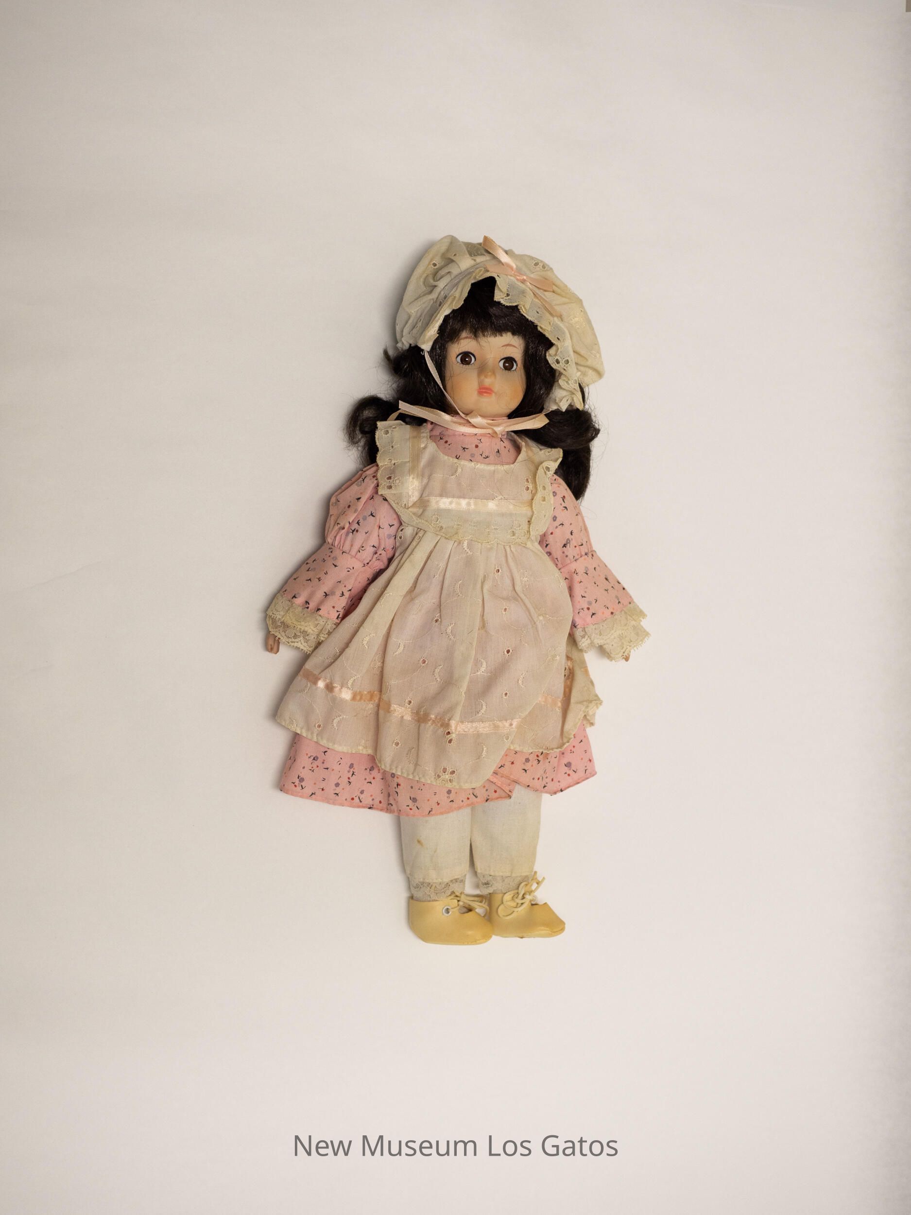 Large female doll wearing a pink dress with a small flower pattern, and lace on the edge of the sleeves. She also is wearing a white apron, a white bonnet with a pink bow, white underpants, white socks, and tan leather shoes. She has brown hair, painted on brown eyes, and pink lips.Collection