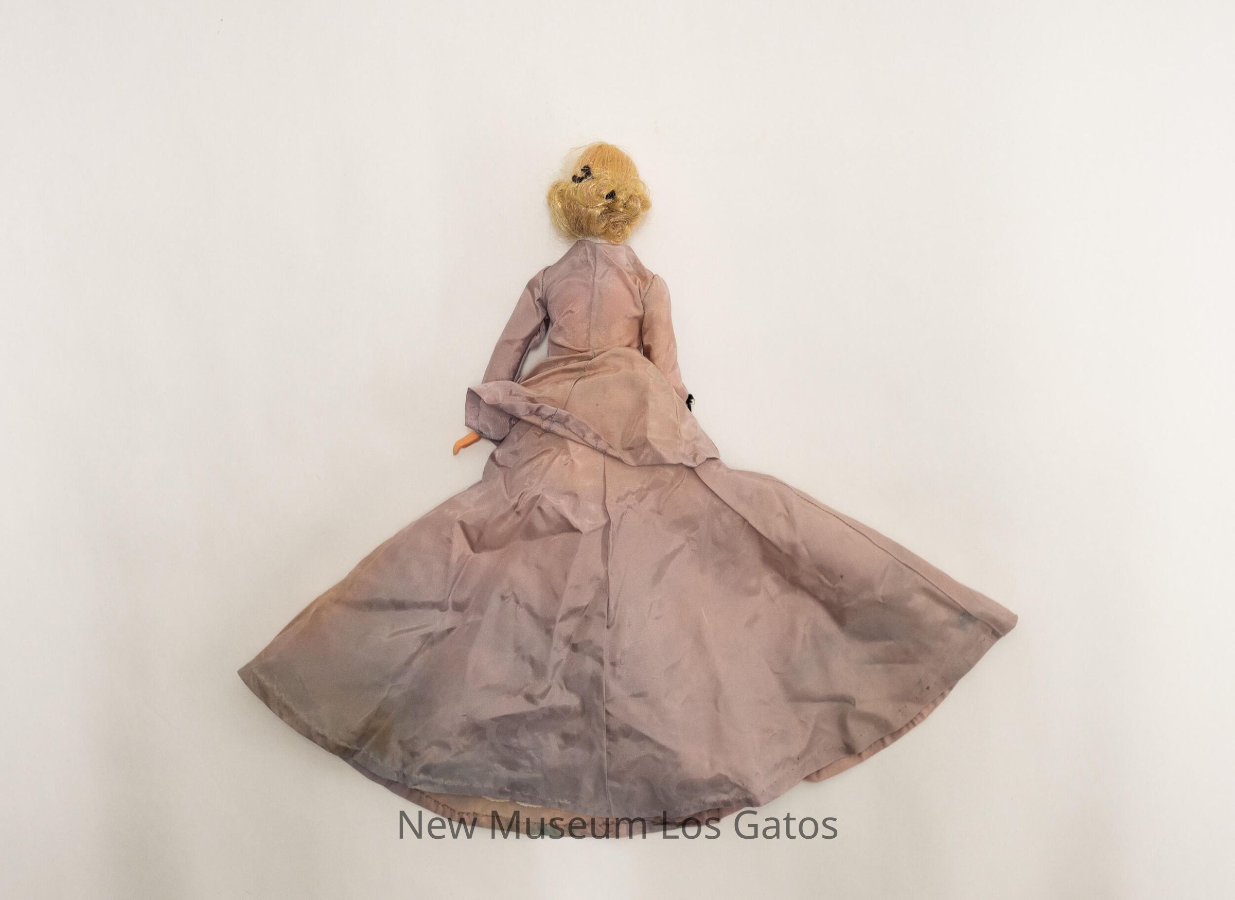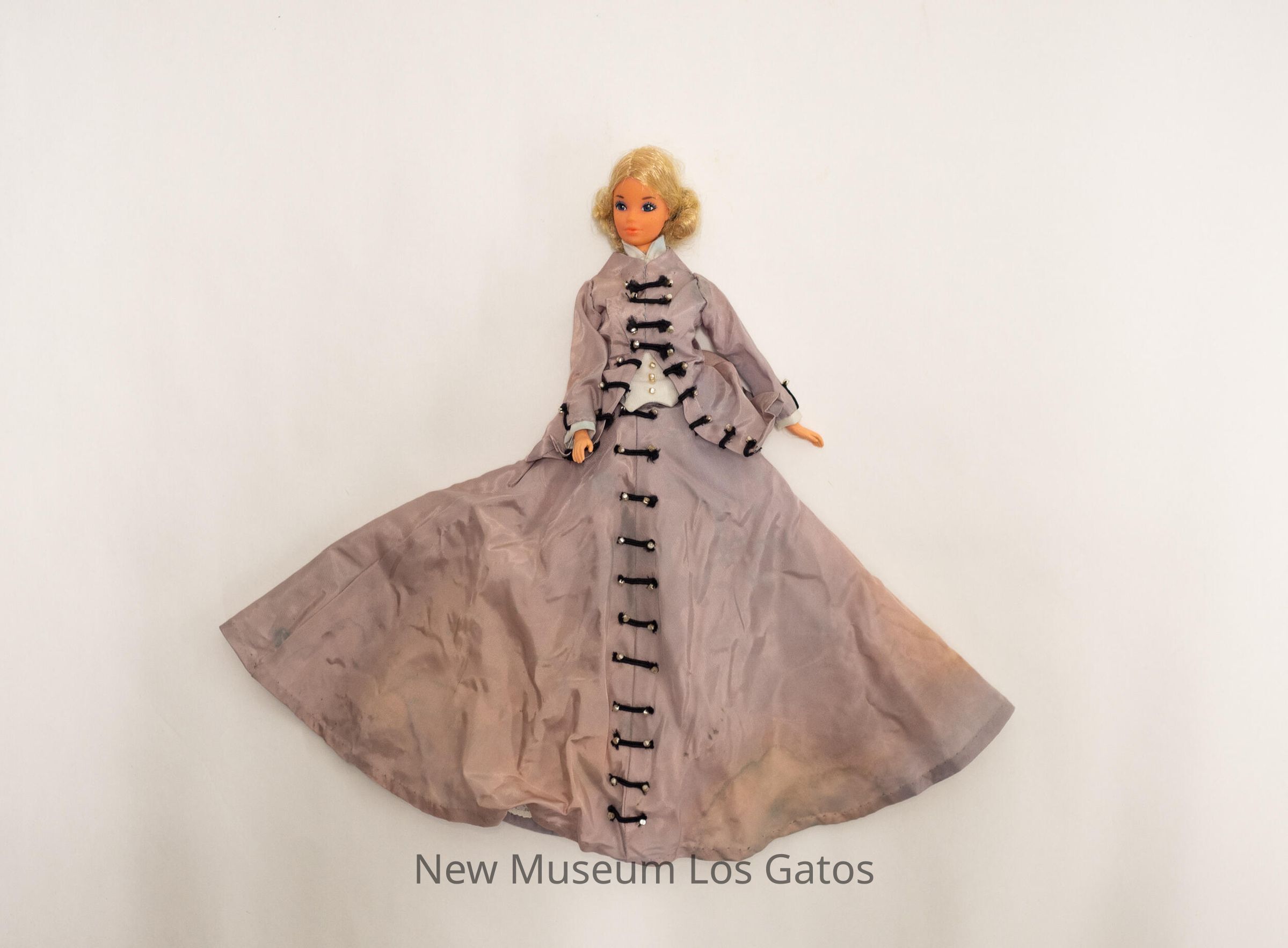 A female doll, with blonde hair and rubber/plastic pink skin, wearing a gray dress. The skirt portion of the dress has small black fabric stripes down the center, with white opalescent beads at both ends of the fabric. The dress jacket has similar detailing down the center, but opens up at the bottom to reveal a white shirt with opalescent beads down the center.Collection
