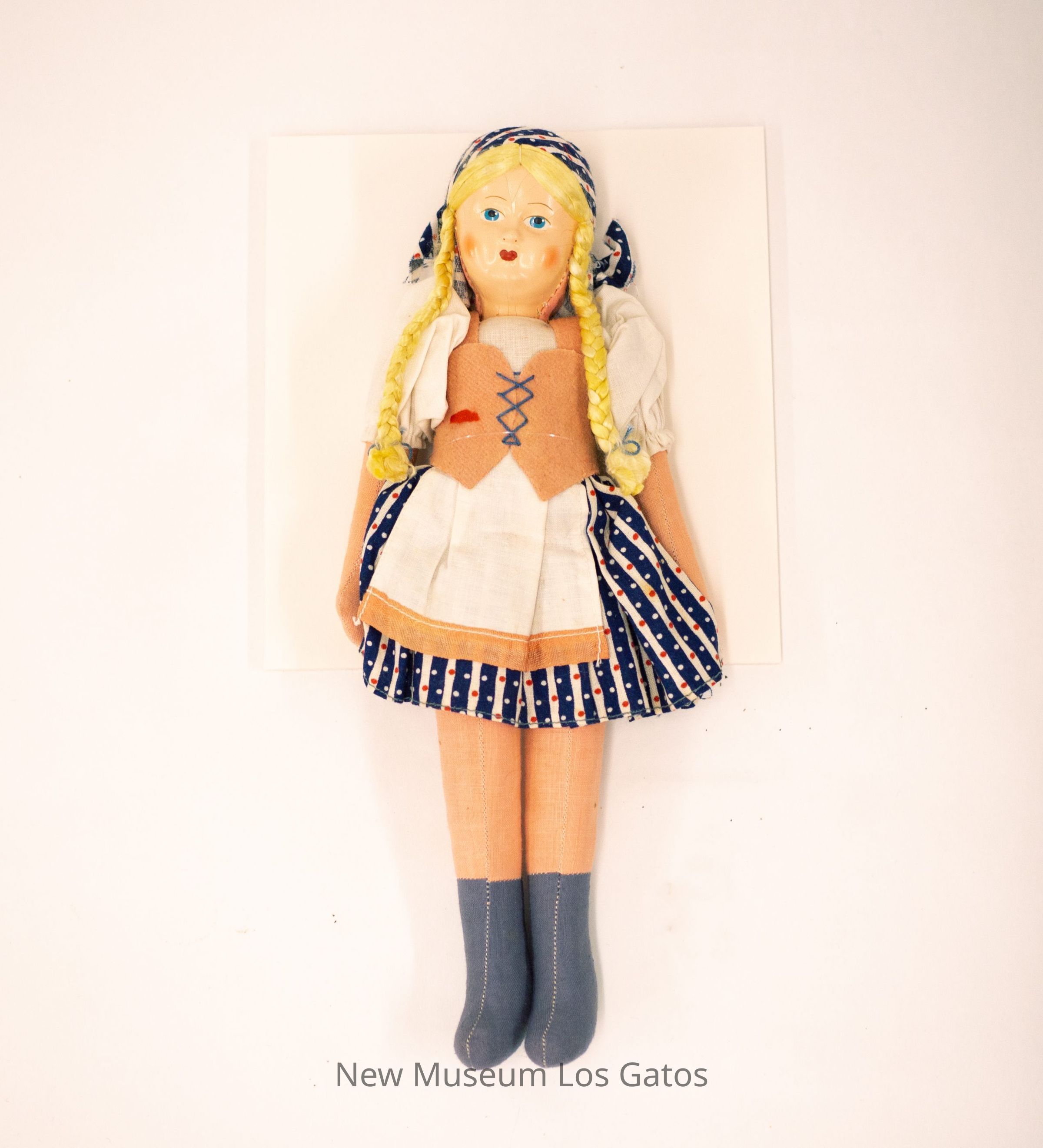 A fabric female doll in Scandinavian style dress. The doll has long blonde hair in two braids, and is wearing a blue and white striped with red polka-dot headscarf, a white dress with pink felt vest, a blue and white striped skirt with red polka-dots and a pink and white apron. The doll's face is lacquered to be firm and glossy, while the rest of the doll is untreated fabric. Her lips are red, eyes are blue, and cheeks are blushed.Collection