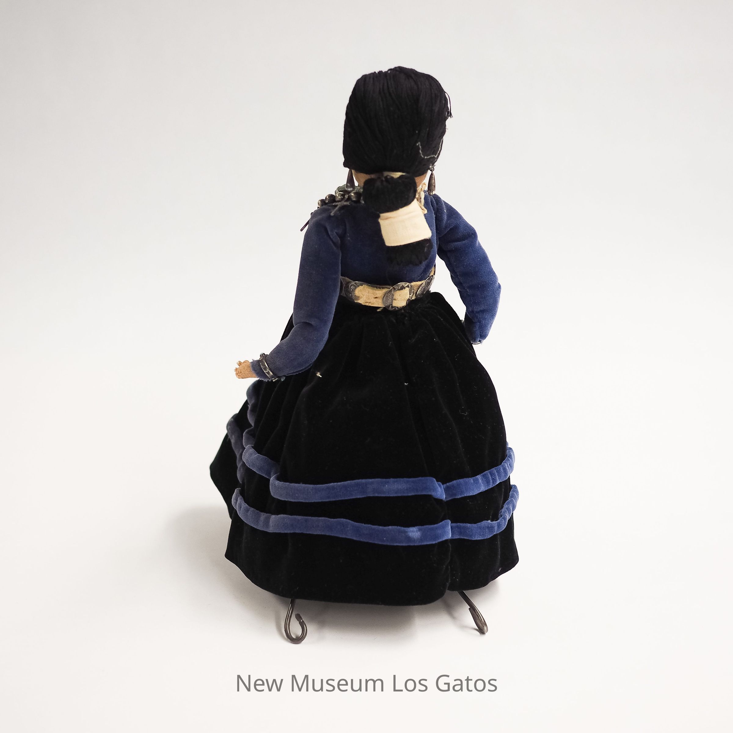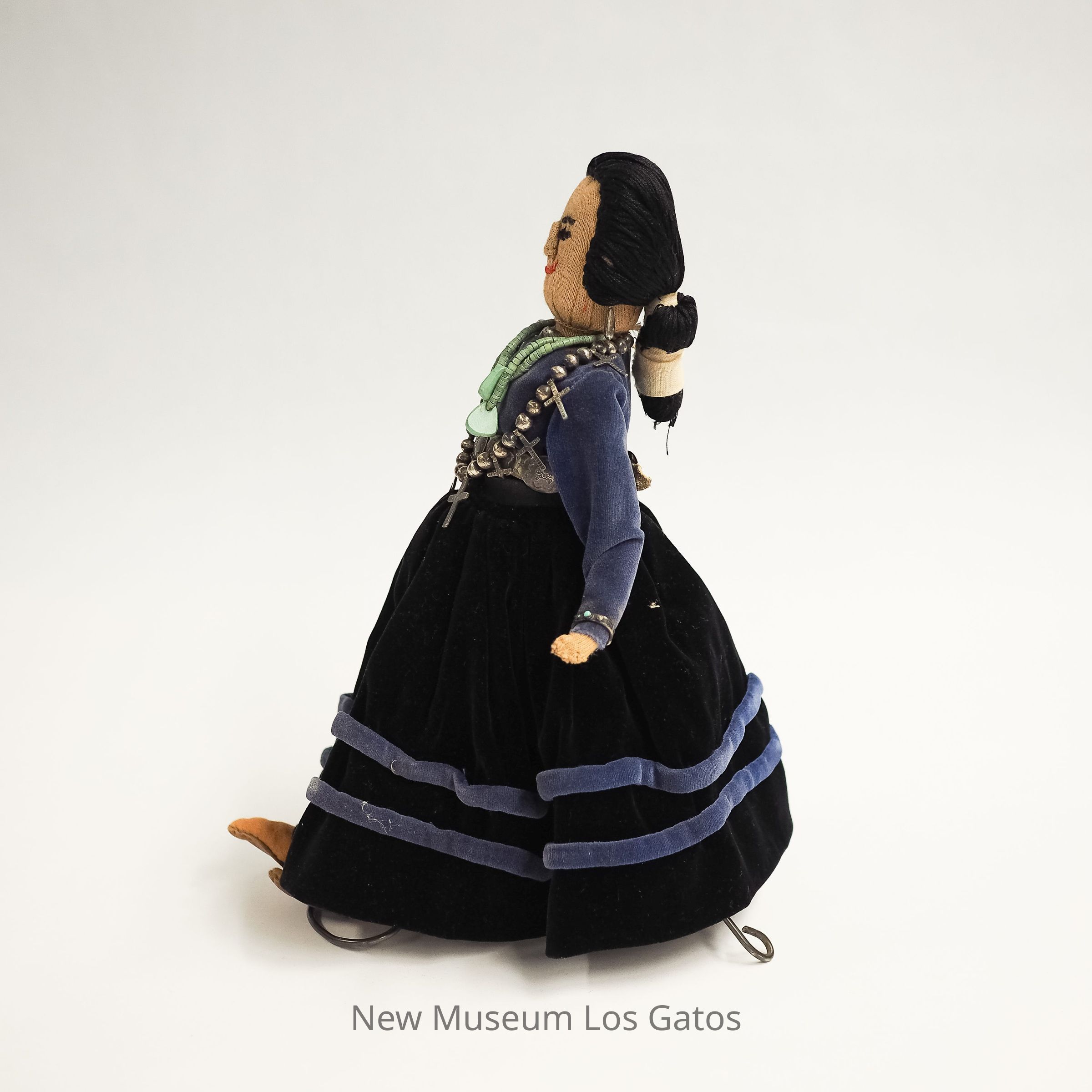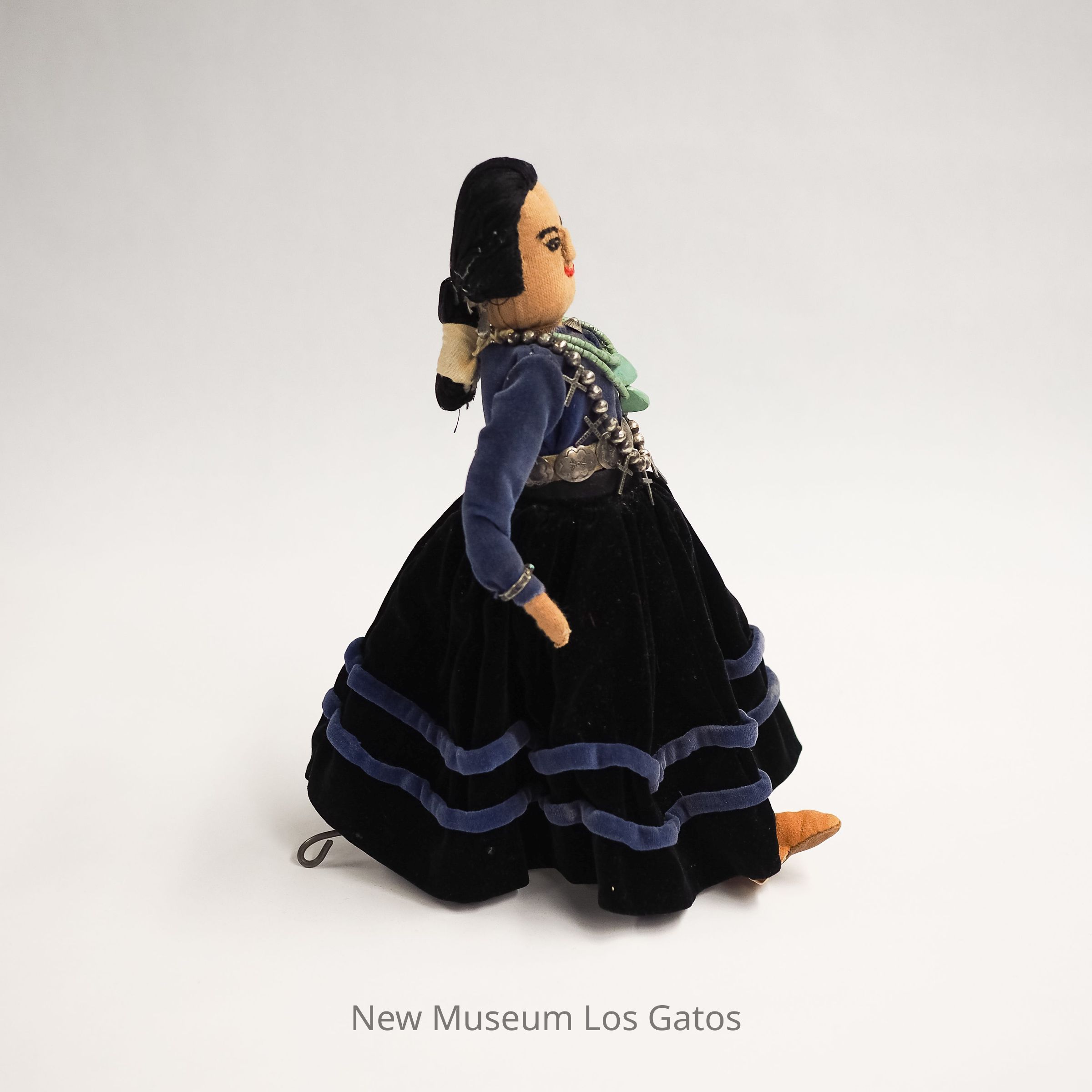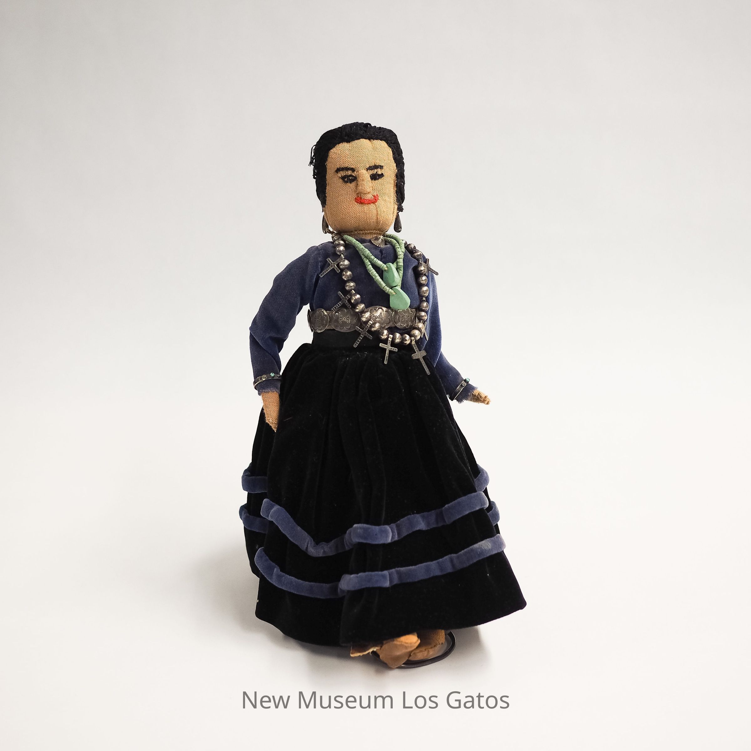 A female doll with an embroidered face in a blue velvet dress, with silver and turquoise jewelry.Collection