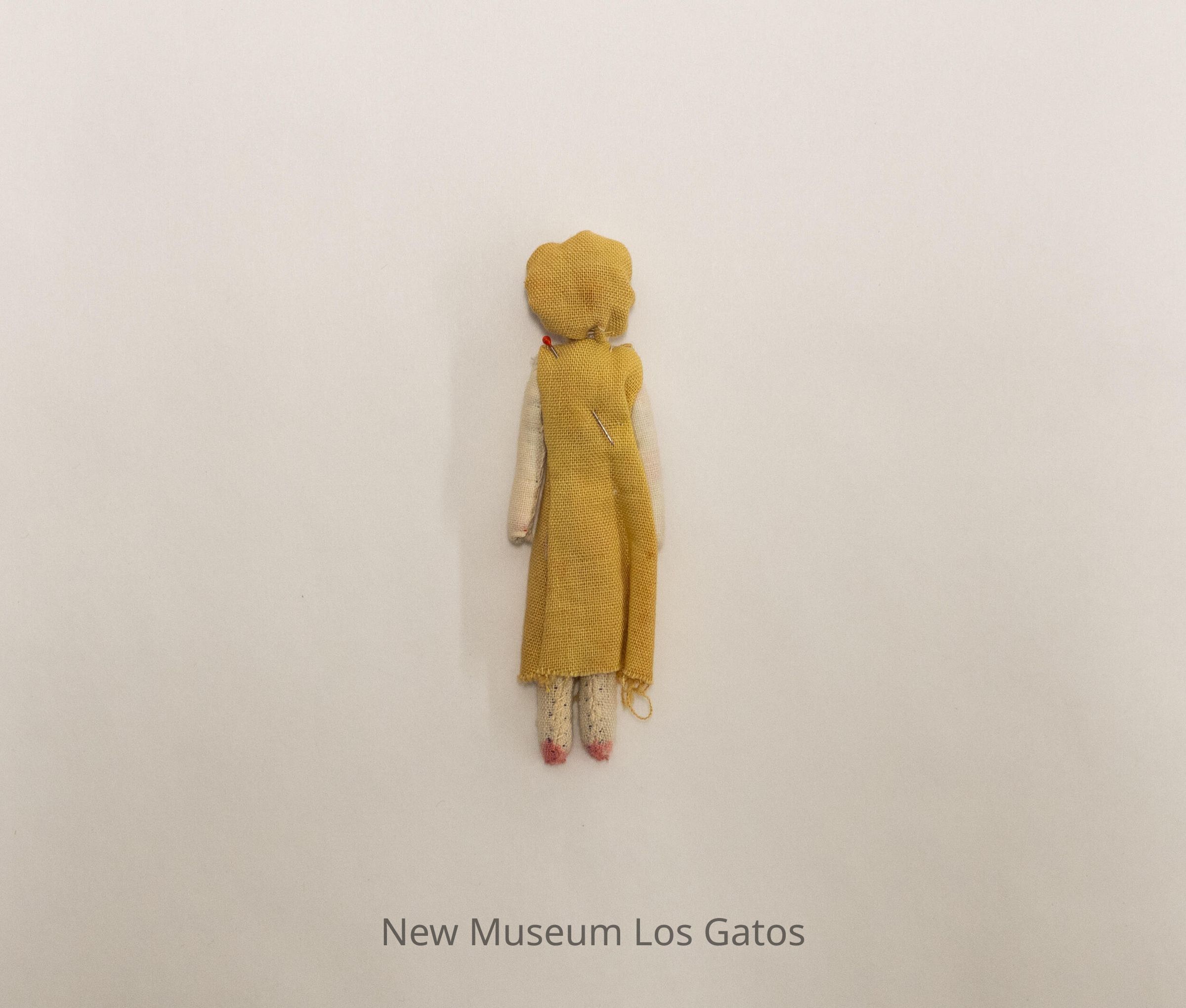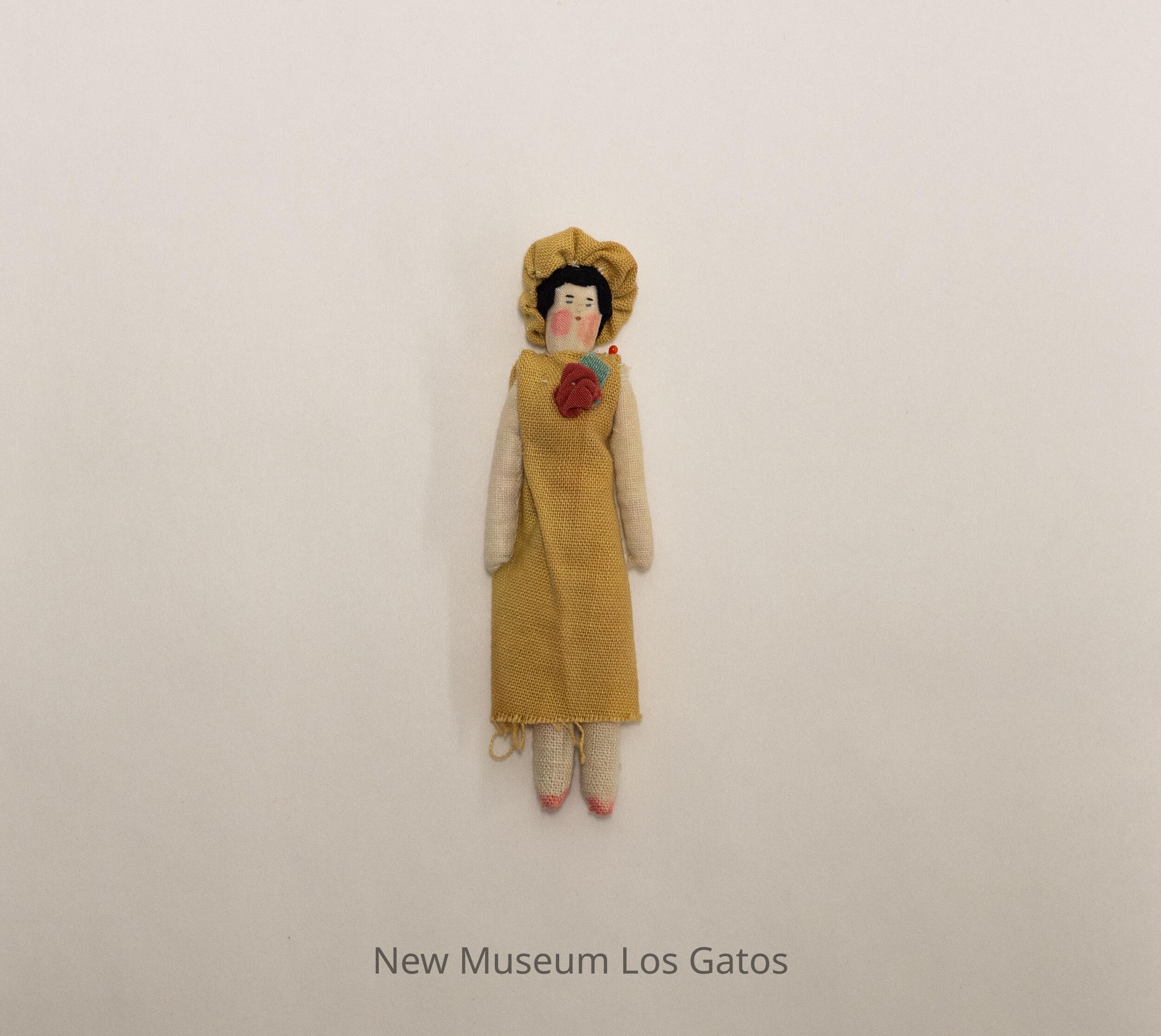 A small female doll, with pink shoes, a long mustard-yellow dress with a red flower and green leaf, and a matching mustard-yellow hat. There is a pin through the back of the doll/dress.Collection