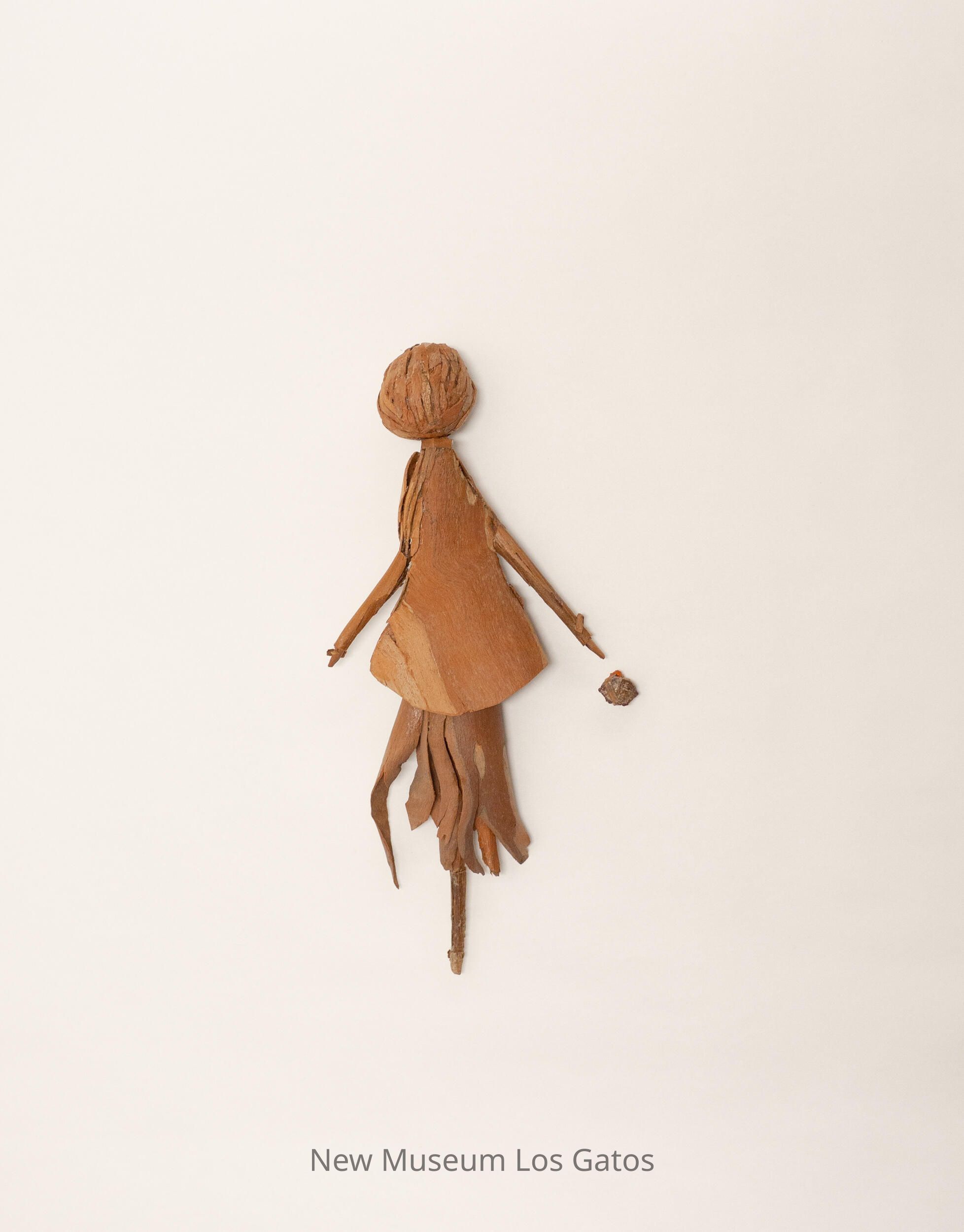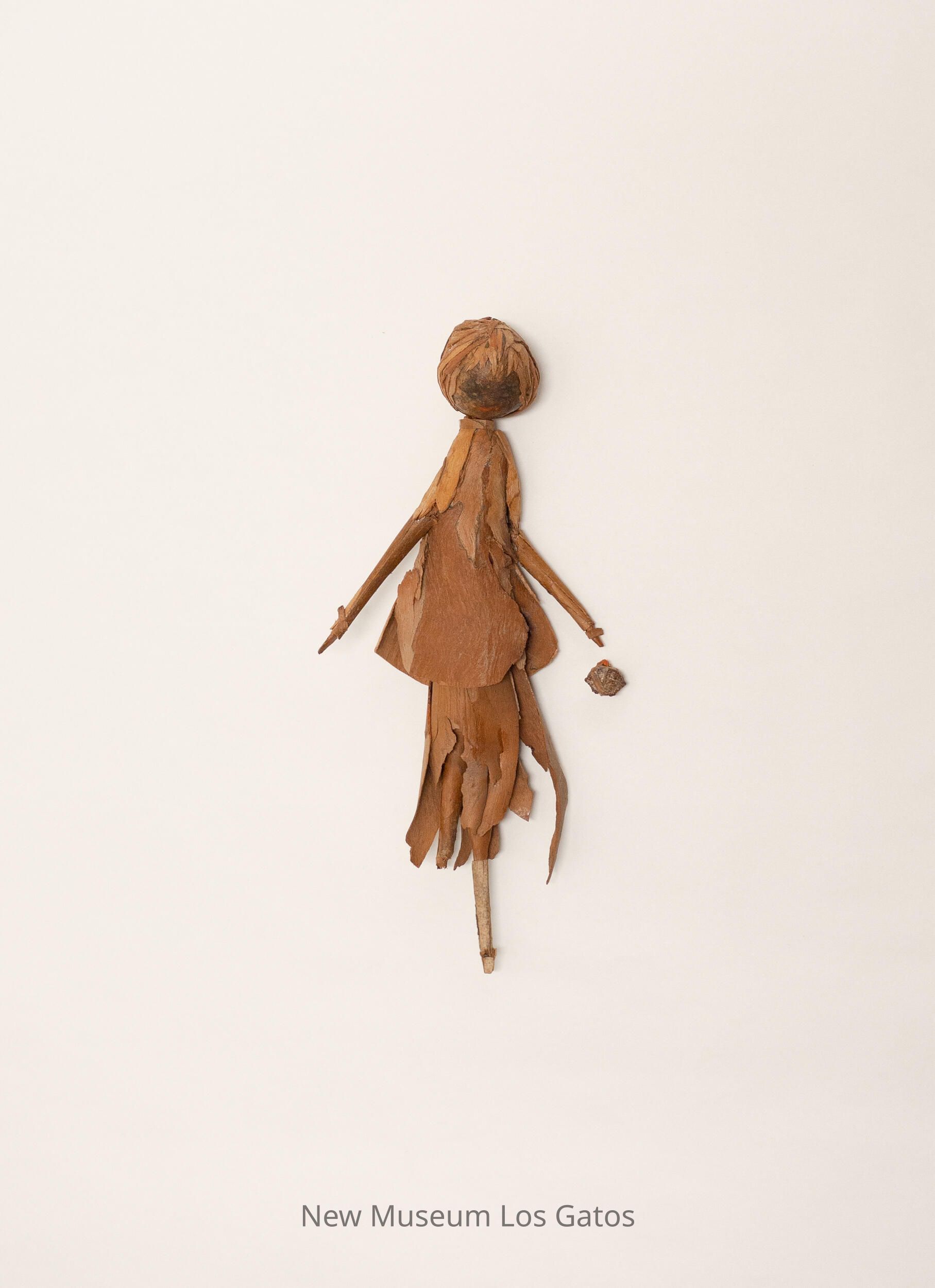 Female doll made out of Eucalyptus bark and other natural materials. Doll has one leg, centered to the body. She has a skirt, and a long tunic-style top. Face is painted on, but faded. Accompanying basket with some orange paint/coloring on the top, was previously attached.Collection