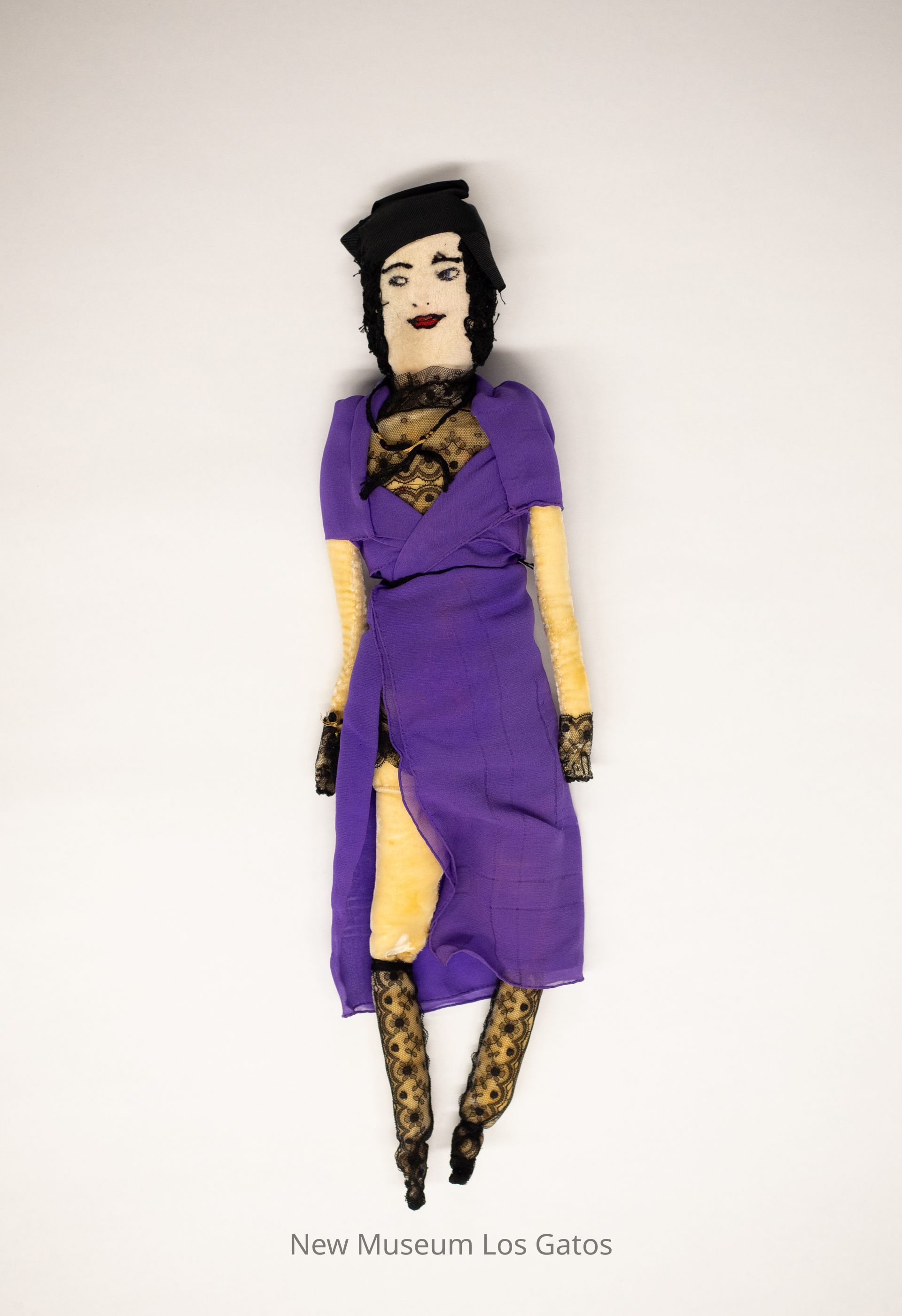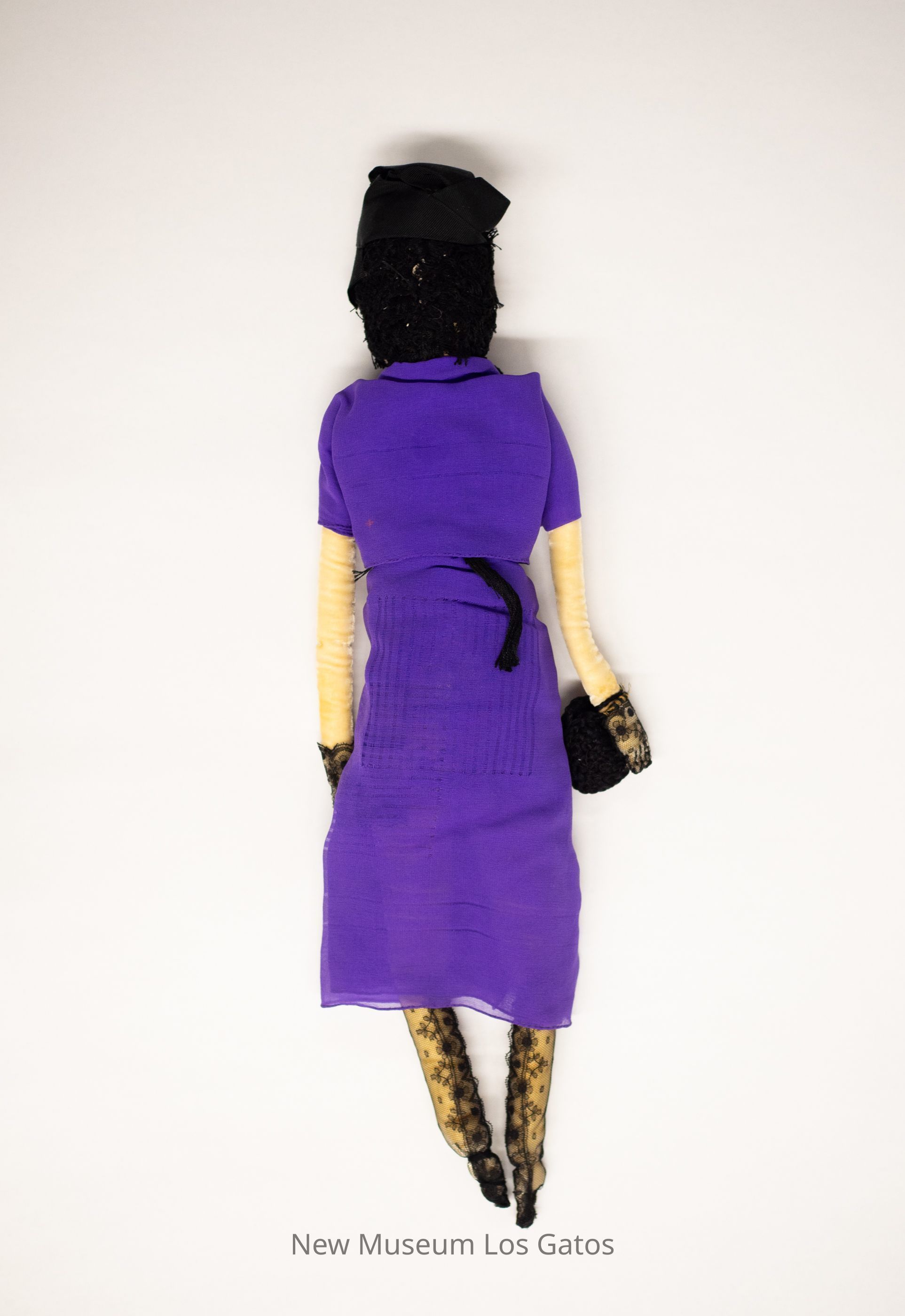 A plush female doll, with a velvet body, fabric dress, and lace accessories. The doll is wearing a purple dress, with black lace stockings, gloves, and undergarments. The doll is holding a black purse in her right hand, and is wearing a black hat over her black fabric hair. Her facial details are sewn on.Collection