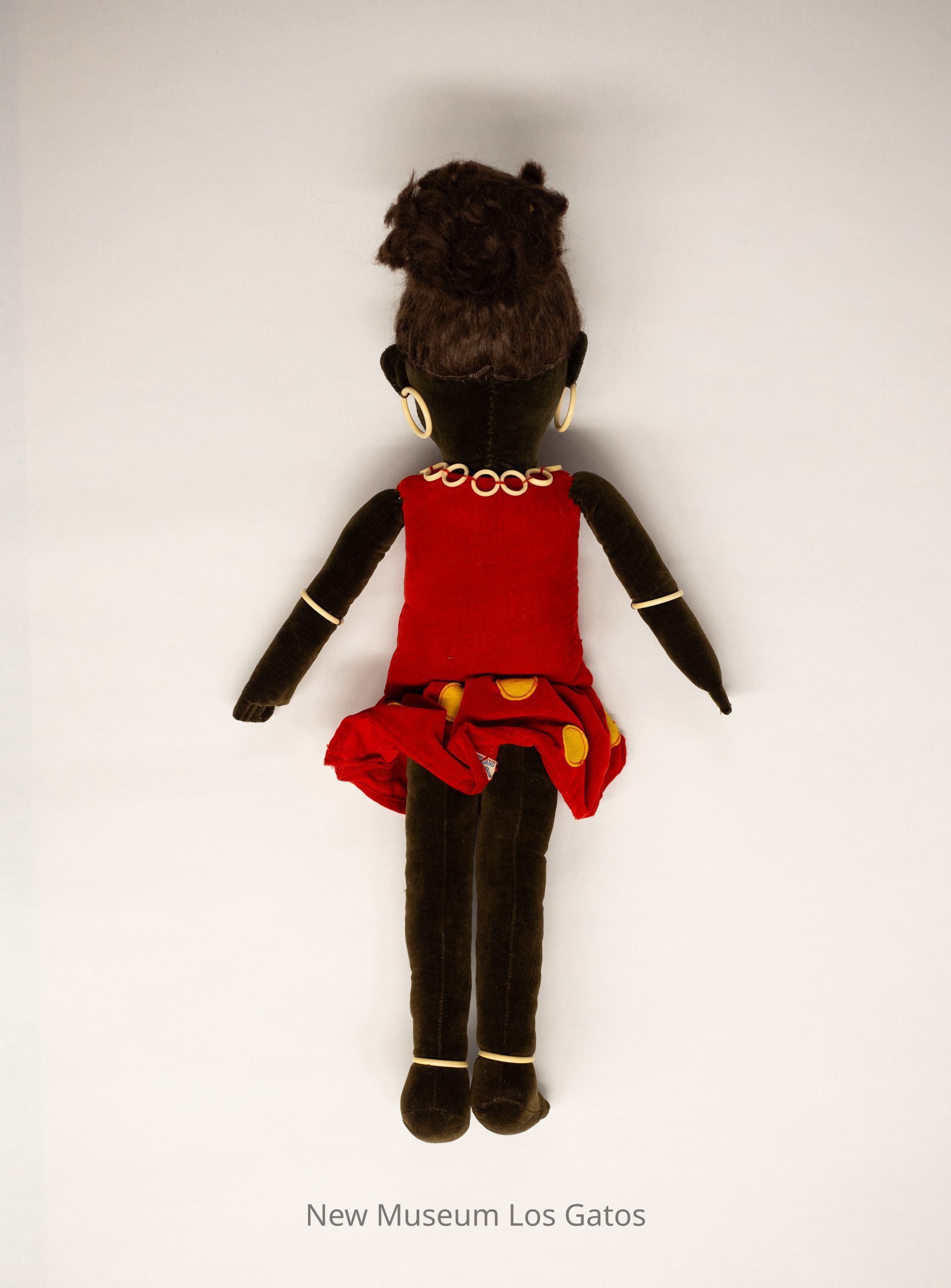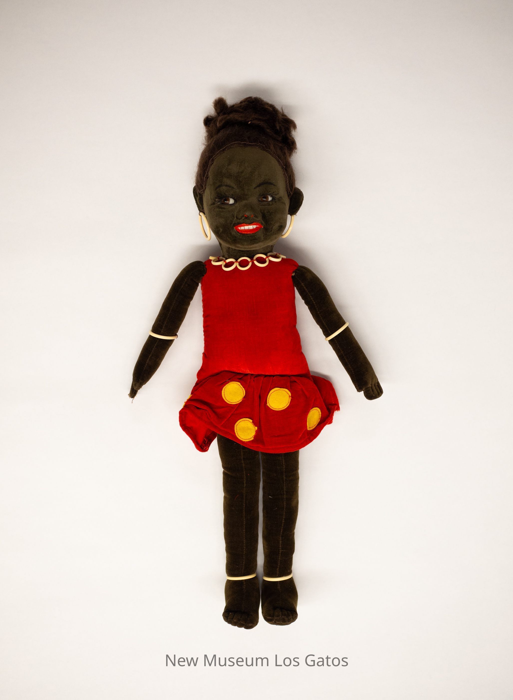 A plush female doll, with a velvet body and dress, and plastic accessories. The doll is wearing a red dress with yellow polka dots along the bottom section of the skirt. The doll is wearing white plastic circles around her ankles, the middle of her arms, around her neck as a necklace, and as hoop earrings. Her brown hair is made of faux hair, and her eyes are plastic while the rest of her facial details are painted on.Collection