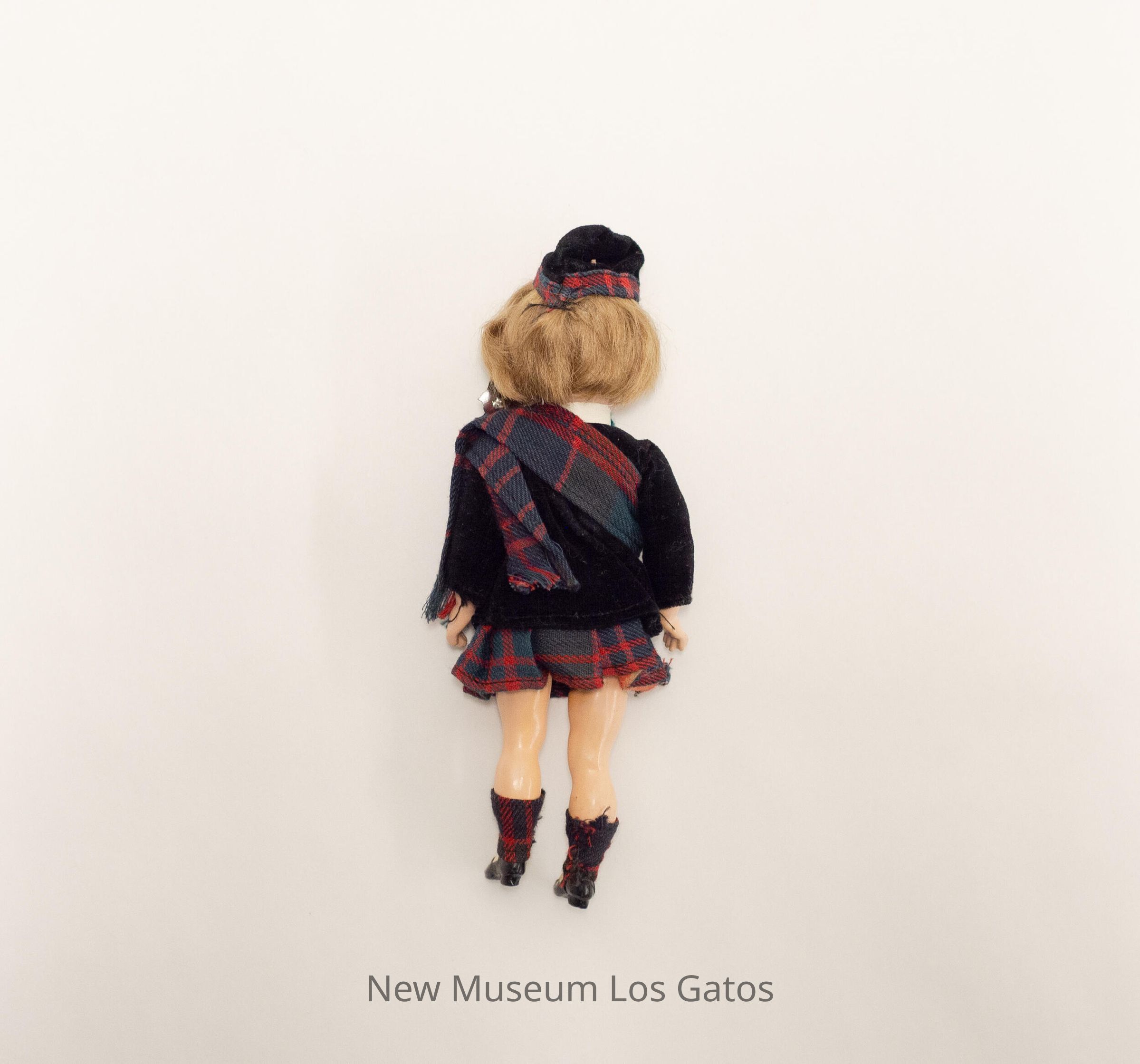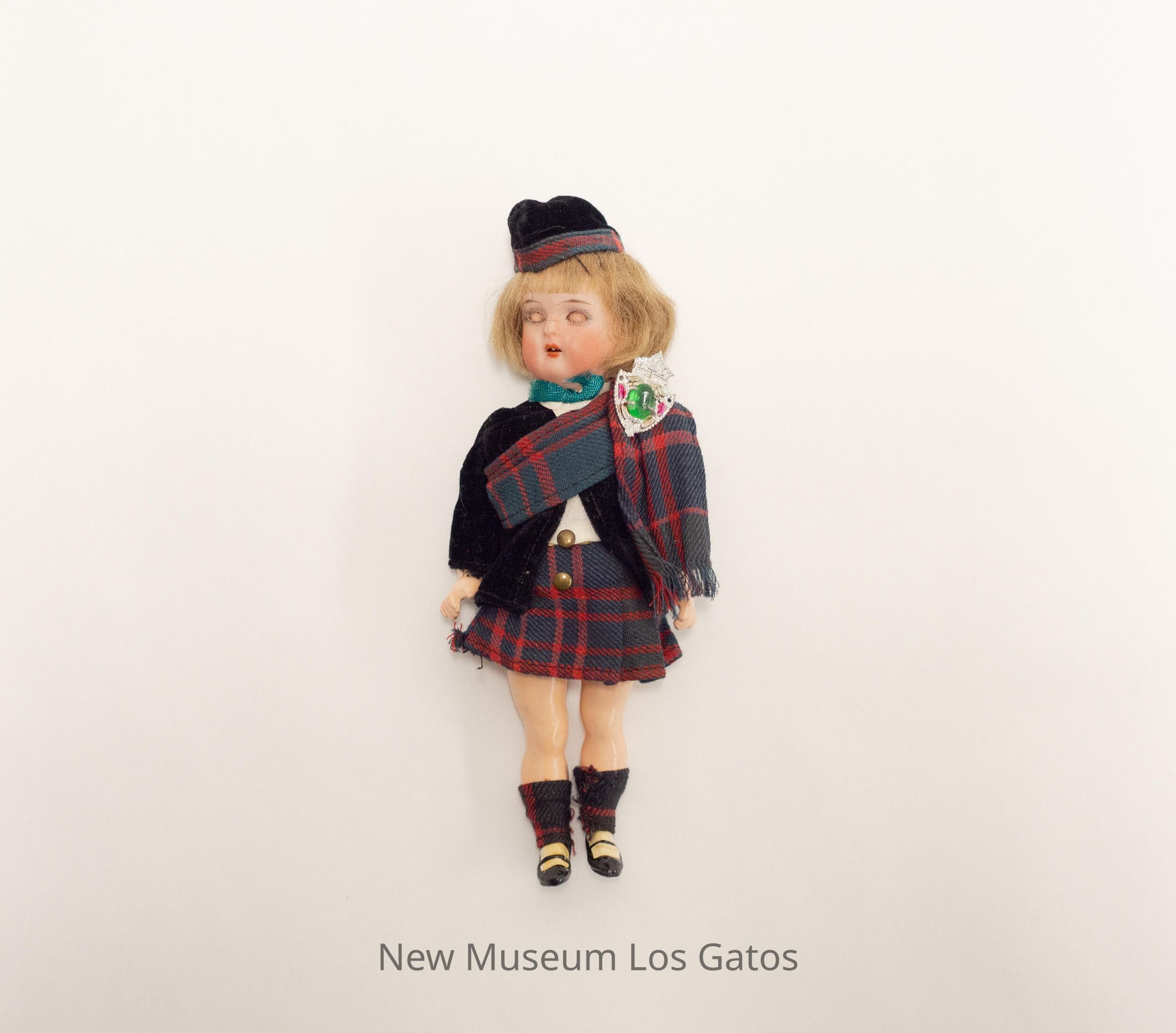 A small, porcelain and composition female doll, wearing Scottish garb. The doll has painted black shoes and green and red plaid fabric stockings, a green and red plaid skirt, a white shirt, black jacket, and a green and red plaid over-the-shoulder sash secured with a silver and green broach. The doll has short, light brown hair, and is wearing a black hat that has green and red plaid trim.Collection