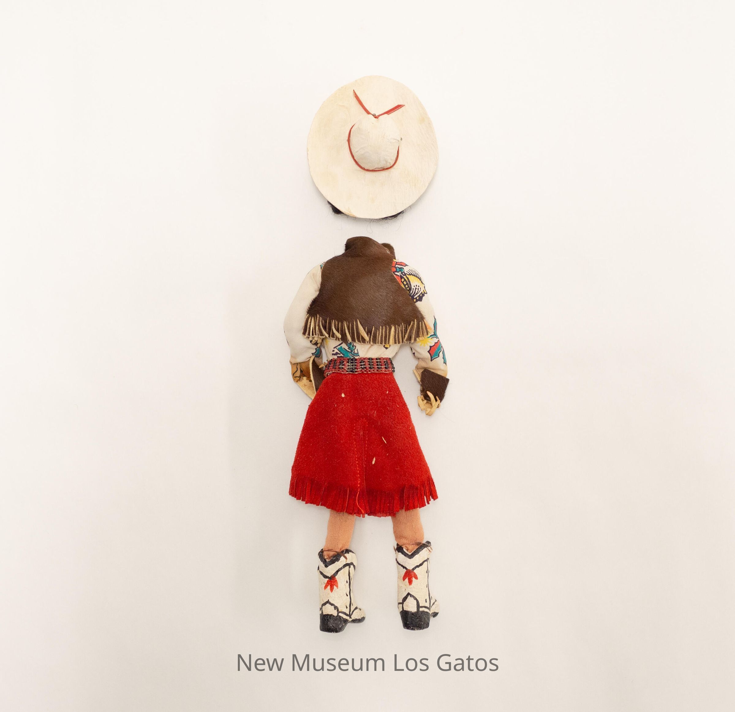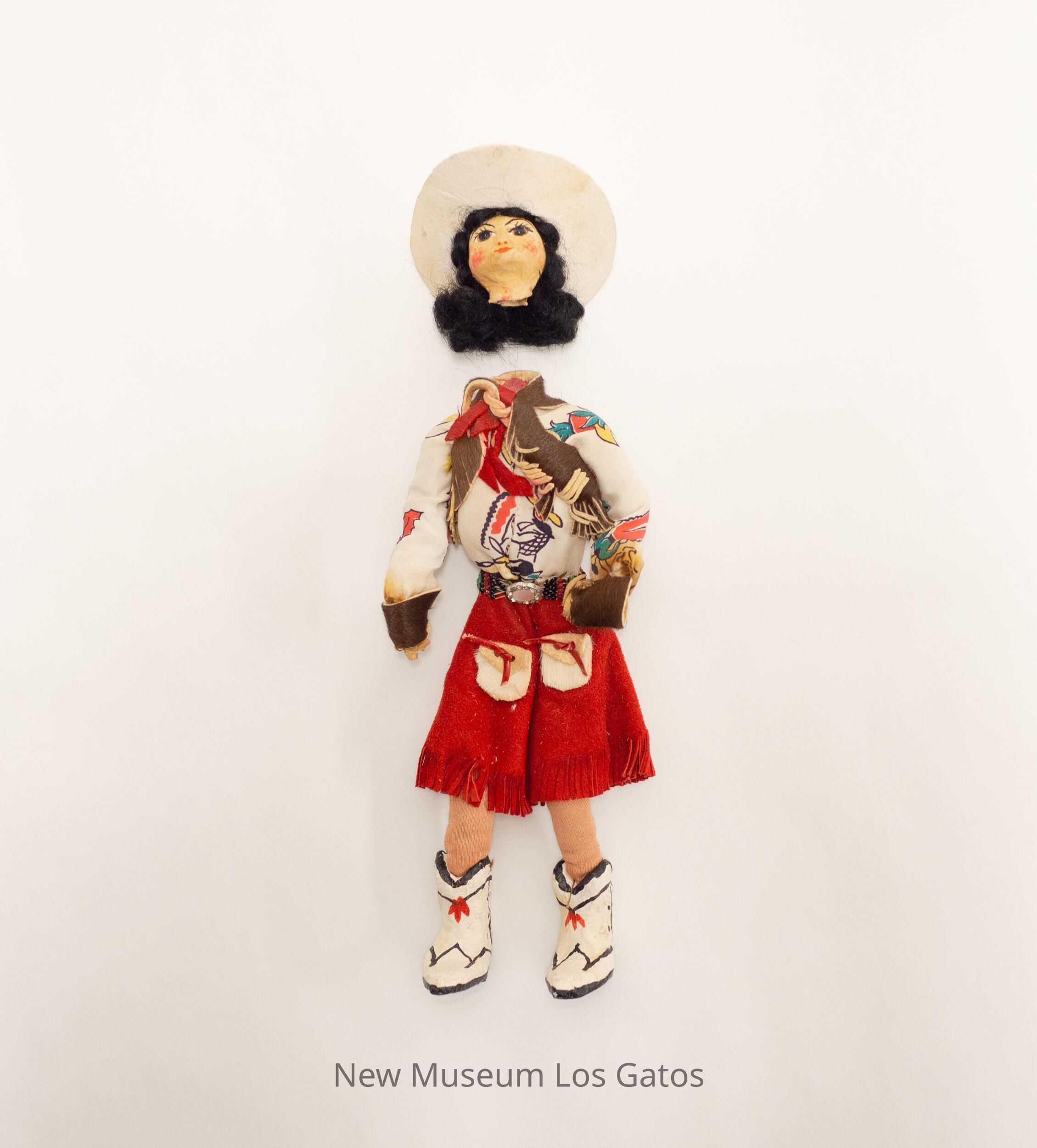 A female cowgirl doll, wearing white and black boots with red detailing, and red pants with fringe at the bottom and two white pockets on the front. The doll's shirt is white with a colorful print and brown cuffs, and the doll is also wearing a brown vest and red scarf. She has black hair, and is wearing a white cowboy hat with red string around it. The doll's head has become completely separated from its body.Collection
