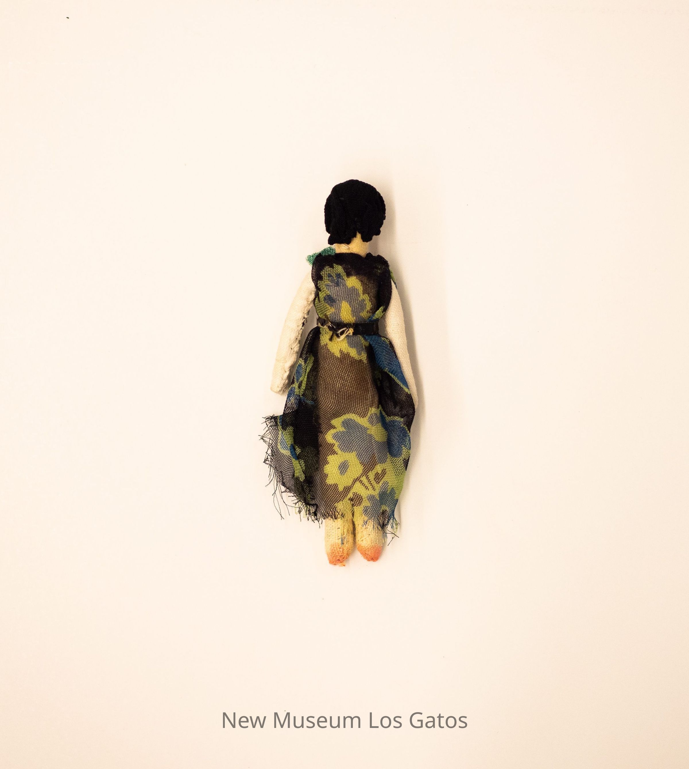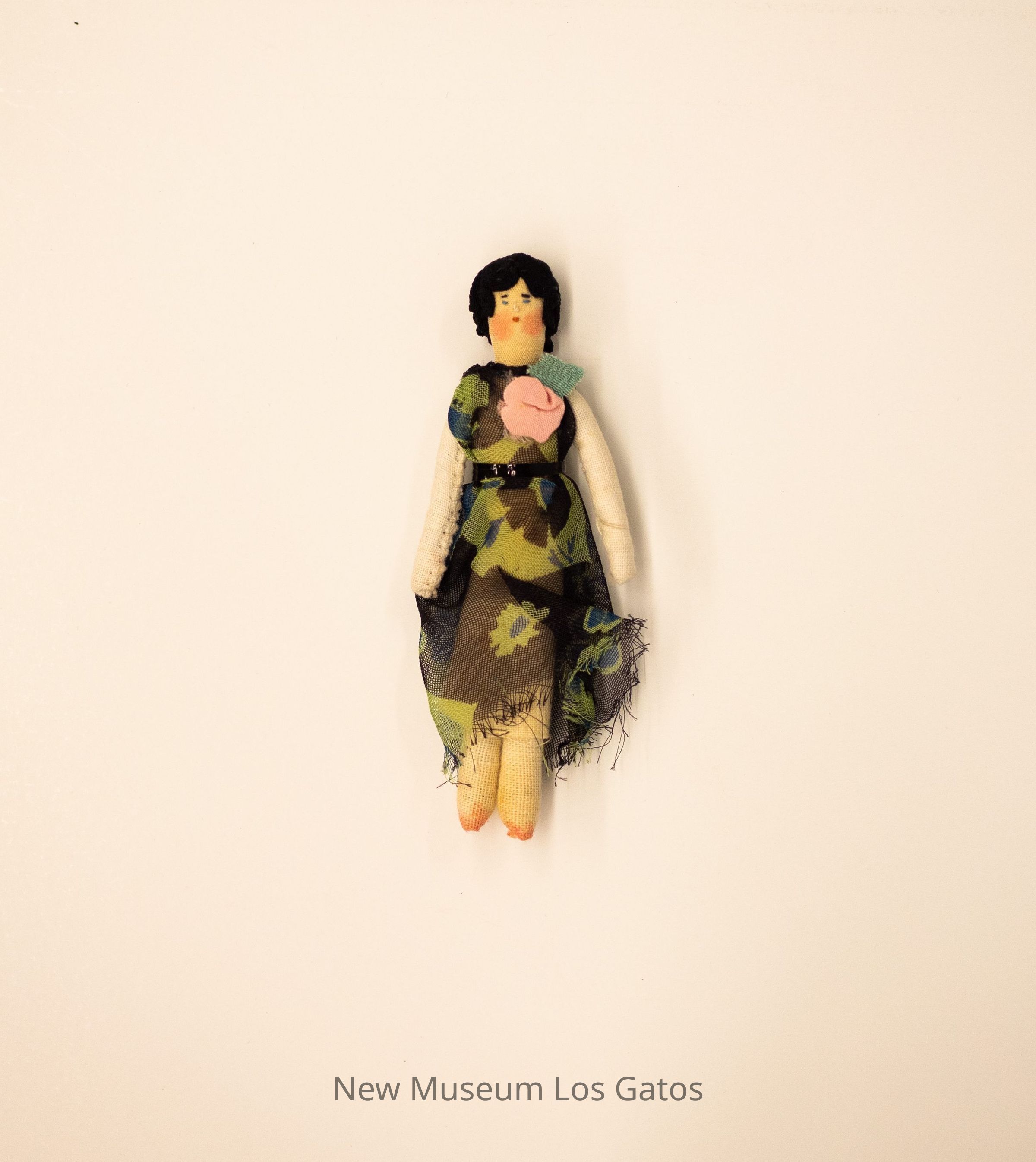 A small fabric doll in a green and black floral sheer dress with a pleather belt and fabric flower decoration on the bodice. The doll has medium length black fabric hair, blue eyes, red lips, and blushed cheeks.Collection