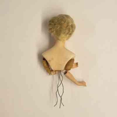 A bisque bust of a female doll. The doll's arms consist of wires, with tan fabric for the upper arms and ceramic forearms and hands. The doll's head is facing left, with its painted eyes closed and its light blonde hair in an up-do. There are three silver metal wires sticking out of the bottom of the bust.Collection