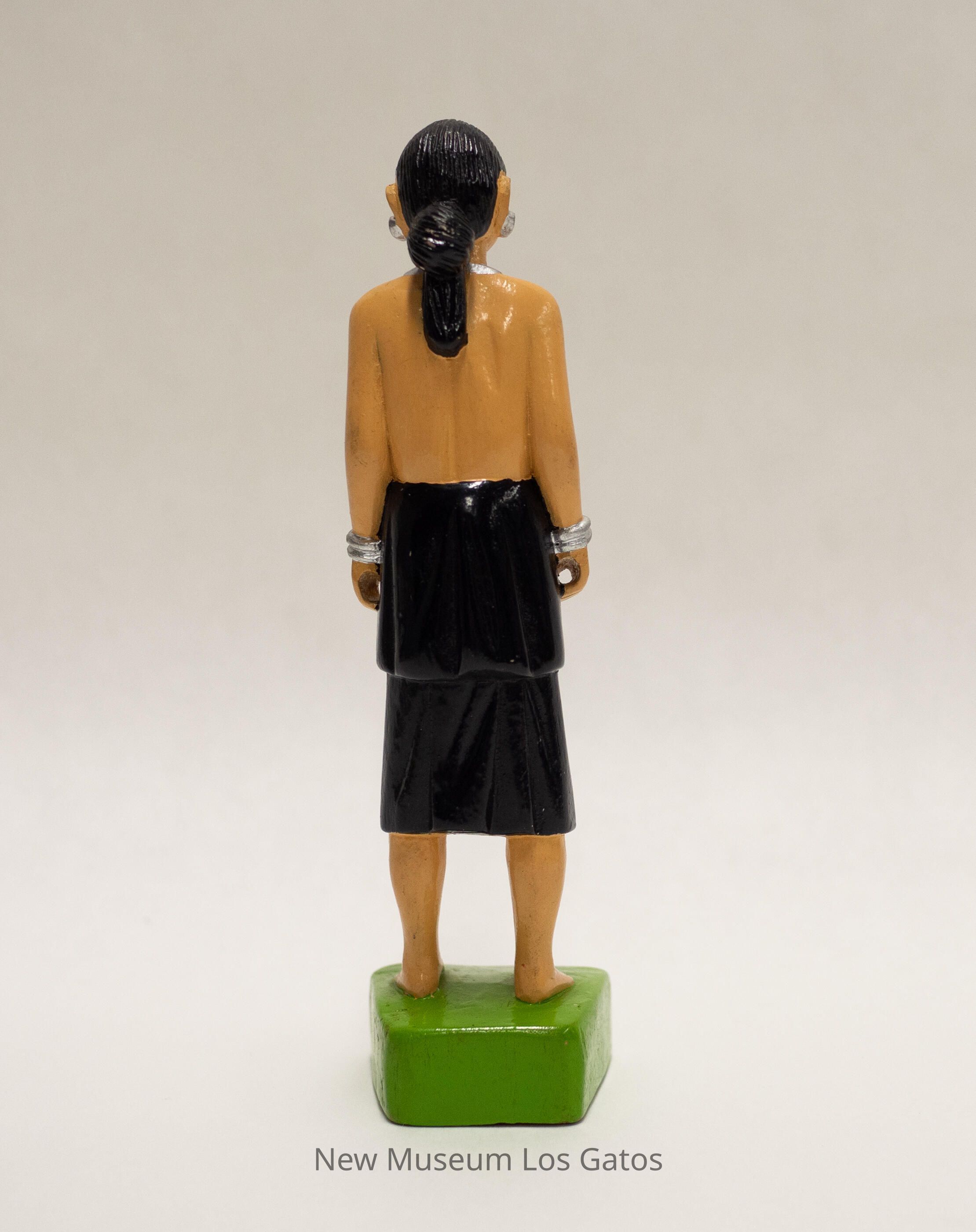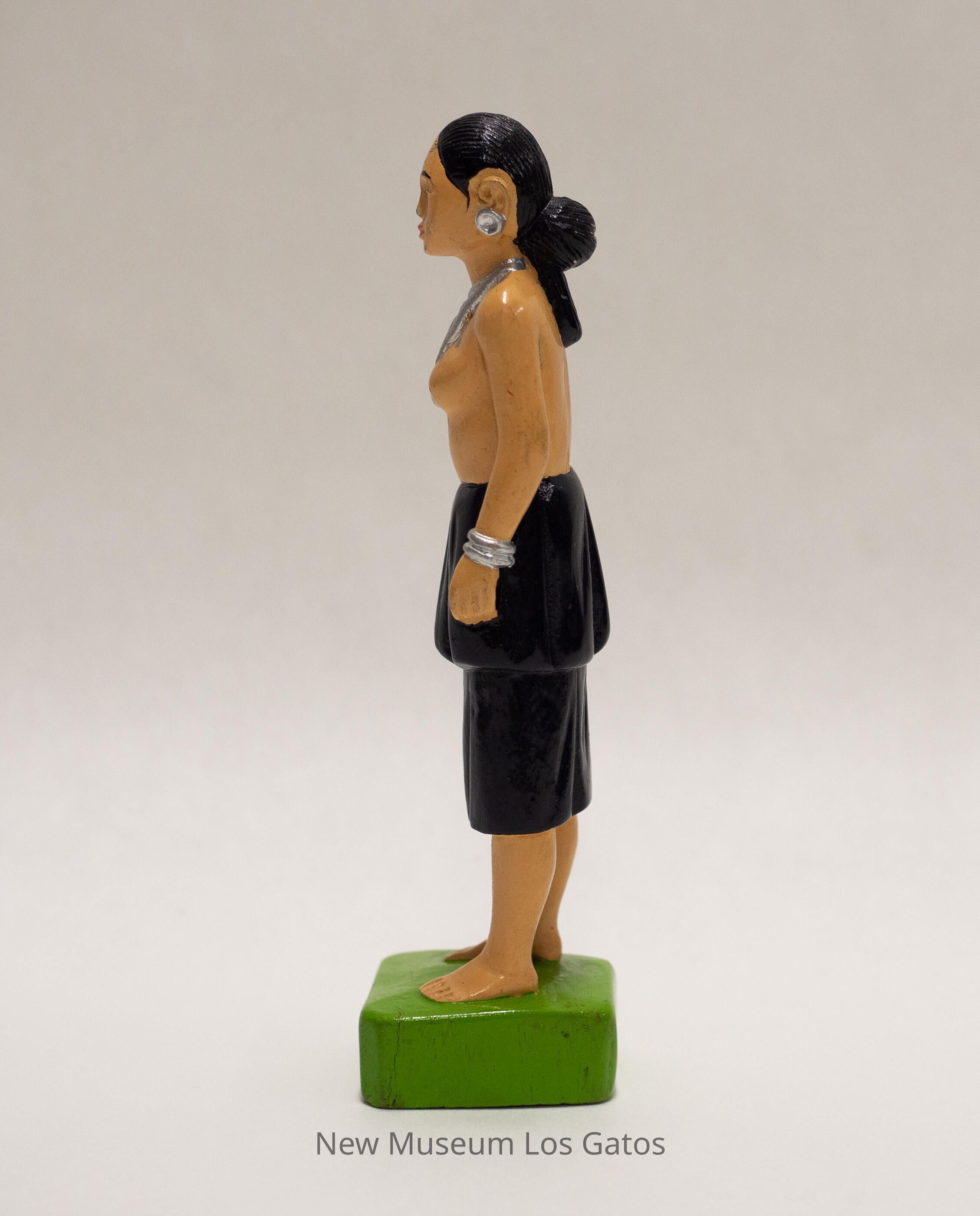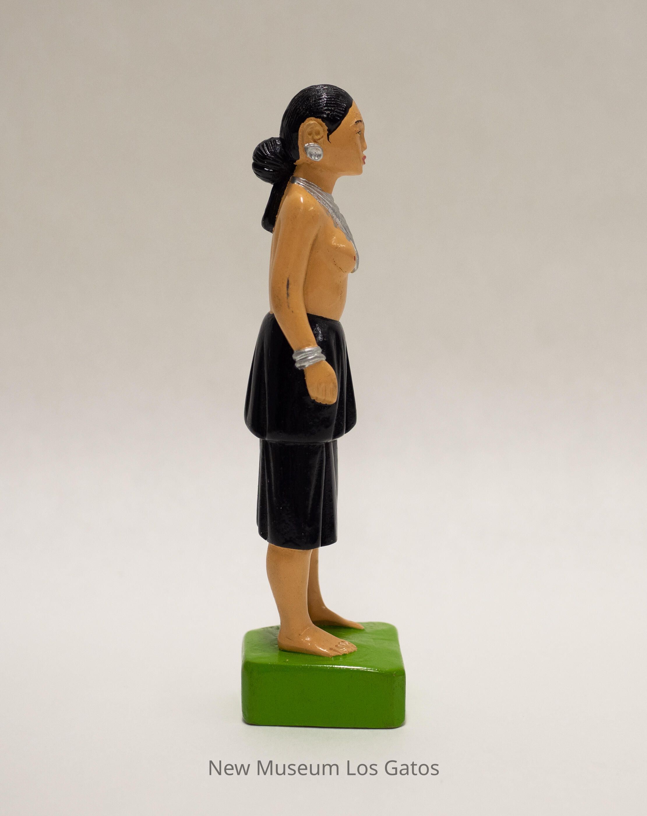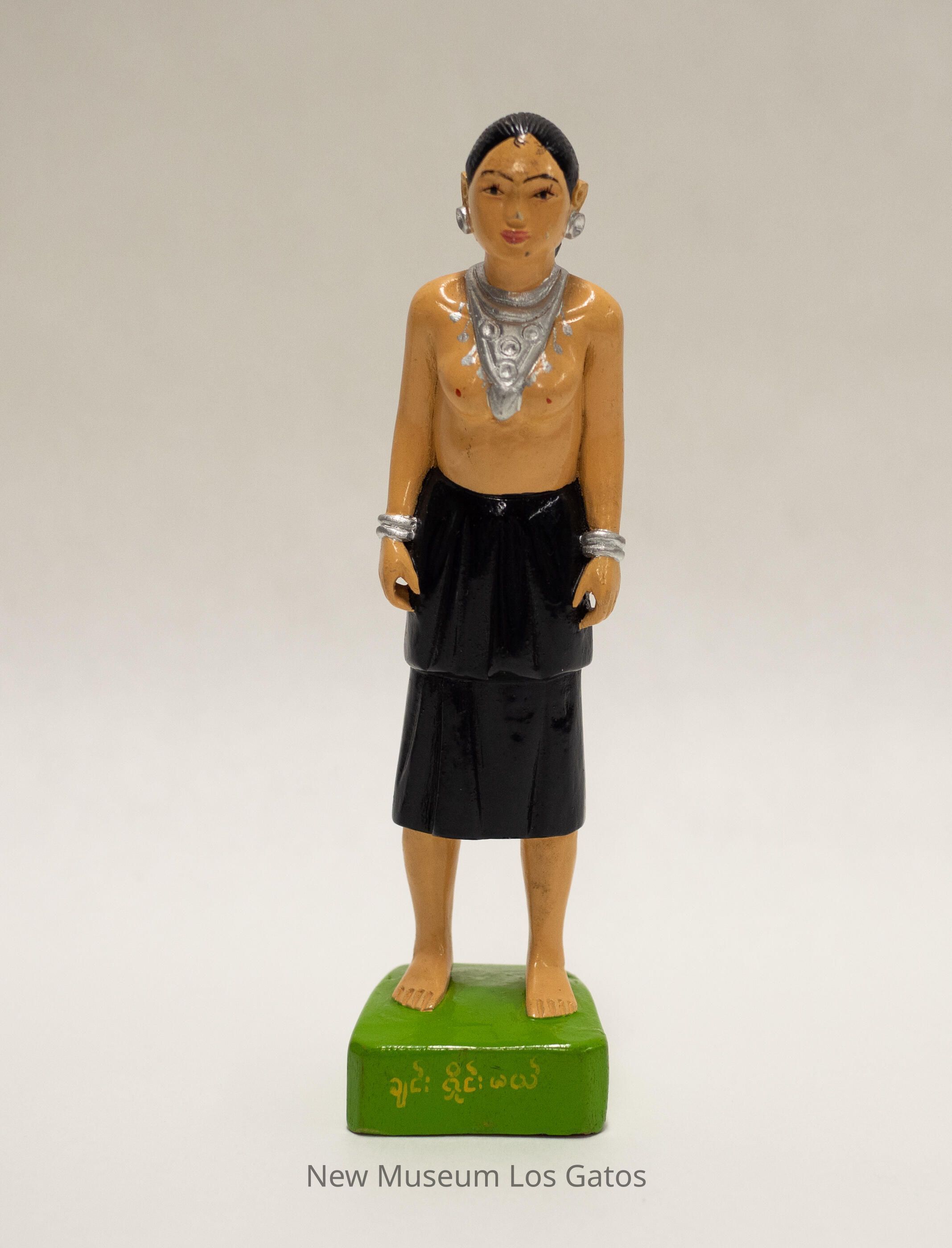 A painted carved wooden figurine depicting a woman standing on a patch of grass. The grass/base is roughly square, and painted lime green with gold Burmese characters. The woman has cream-colored skin, and is wearing a black, two-tiered skirt. Her torso is bare, and she is wearing silver bracelets, silver earrings, and a large triangular silver necklace. Her hair is black, and is pulled back in a low bun.Collection