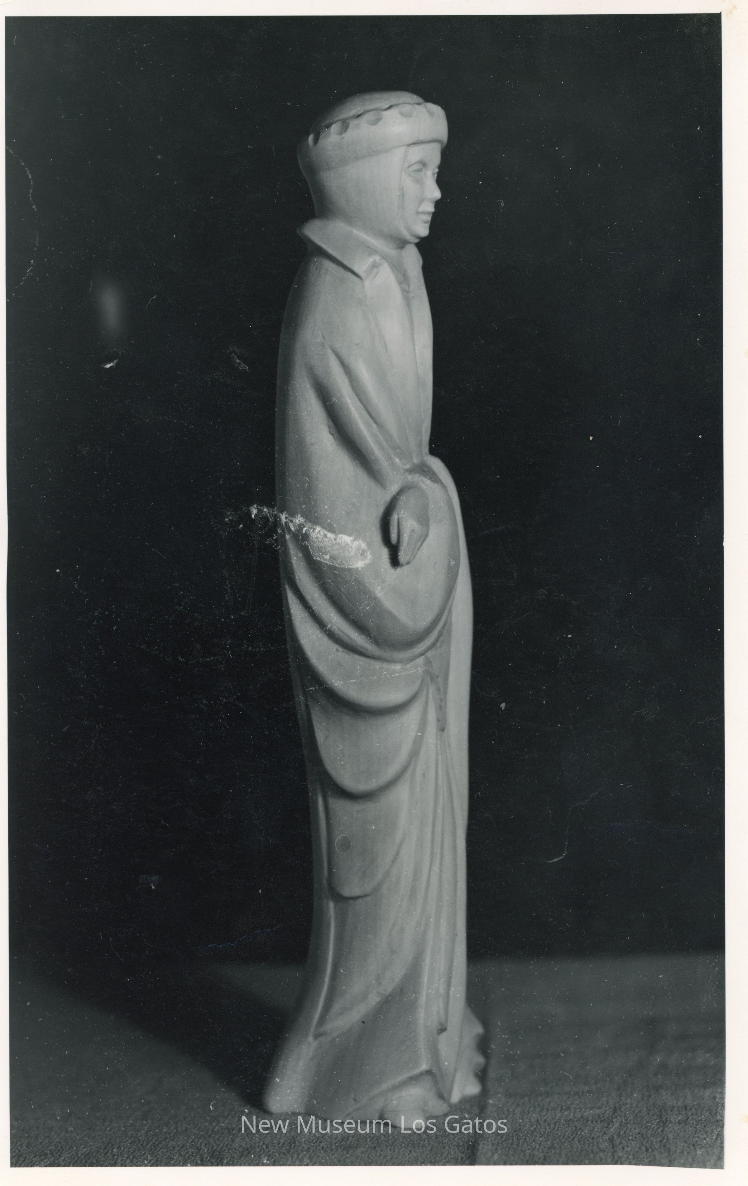 Black and white photograph of a female figurine. The photo is the side profile of the figurine who is wearing a long robe and head covering.Collection