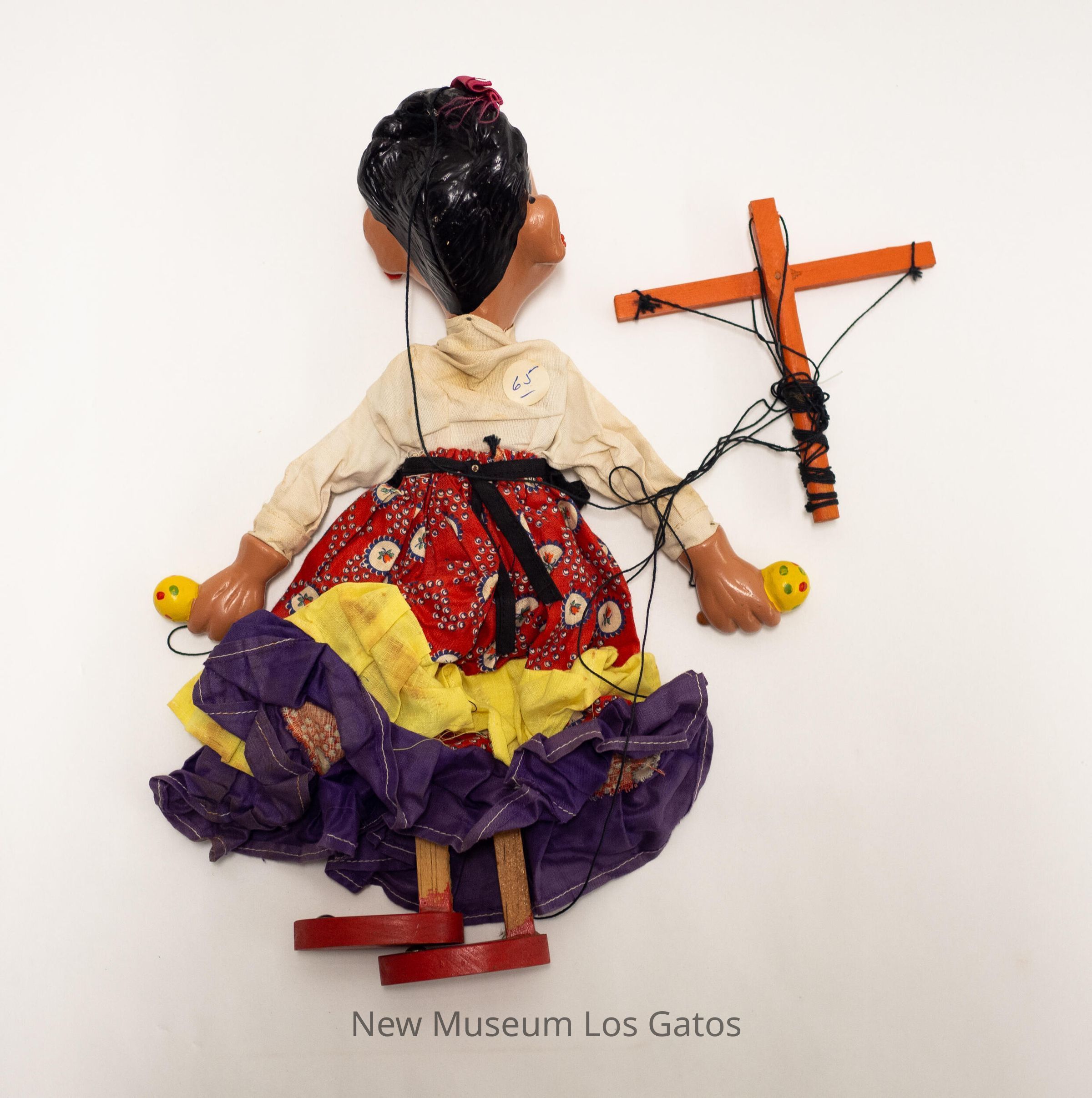 A large, female marionette. The marionette is wearing red wooden shoes, and a multicolored skirt consisting of a purple stripe at the bottom, a yellow stripe in the middle, and a red-and-blue floral patterned stripe at the top. The marionette is also wearing a white shirt and a black, ruffled apron. There are yellow maracas with red and green dots in each hand, and a multicolored beaded necklace around the neck. The marionette's face is painted on, her eyes are nailed on, allowing them to move. The marionette is wearing red floral earrings and has a magenta bow in her hair, which is braided and piled on the back. The marionette's limbs are attached via black string to an orange-ish wooden cross. There is a sticker with the number "65" attached to the back of the marionette.Collection