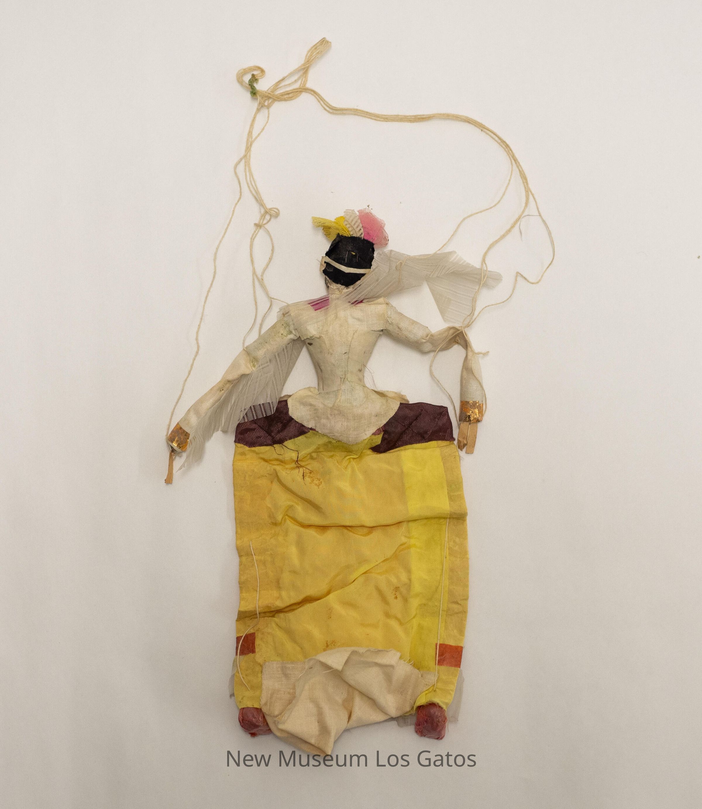A female marionette, with white strings attached to the hands, arms, shoulders, and feet. The doll itself is wearing red/brown shoes and a long yellow skirt with glitter dots throughout the center, a red/brown stripe near the bottom above a sheer ruffle, and a purple/maroon stripe at the top. The shirt is a white long-sleeved shirt with a light pink stripe down the center and a peplum extending over the skirt. The shirt also has a fuschia collar with sheer fabric flowing around the shoulders. The doll is wearing a hat made from sheer, yellow, white, and pink fabric. The doll's hair is black, and the facial features are sewn on; the eyes and eyebrows in black, the nose in white, and the lips in red.Collection