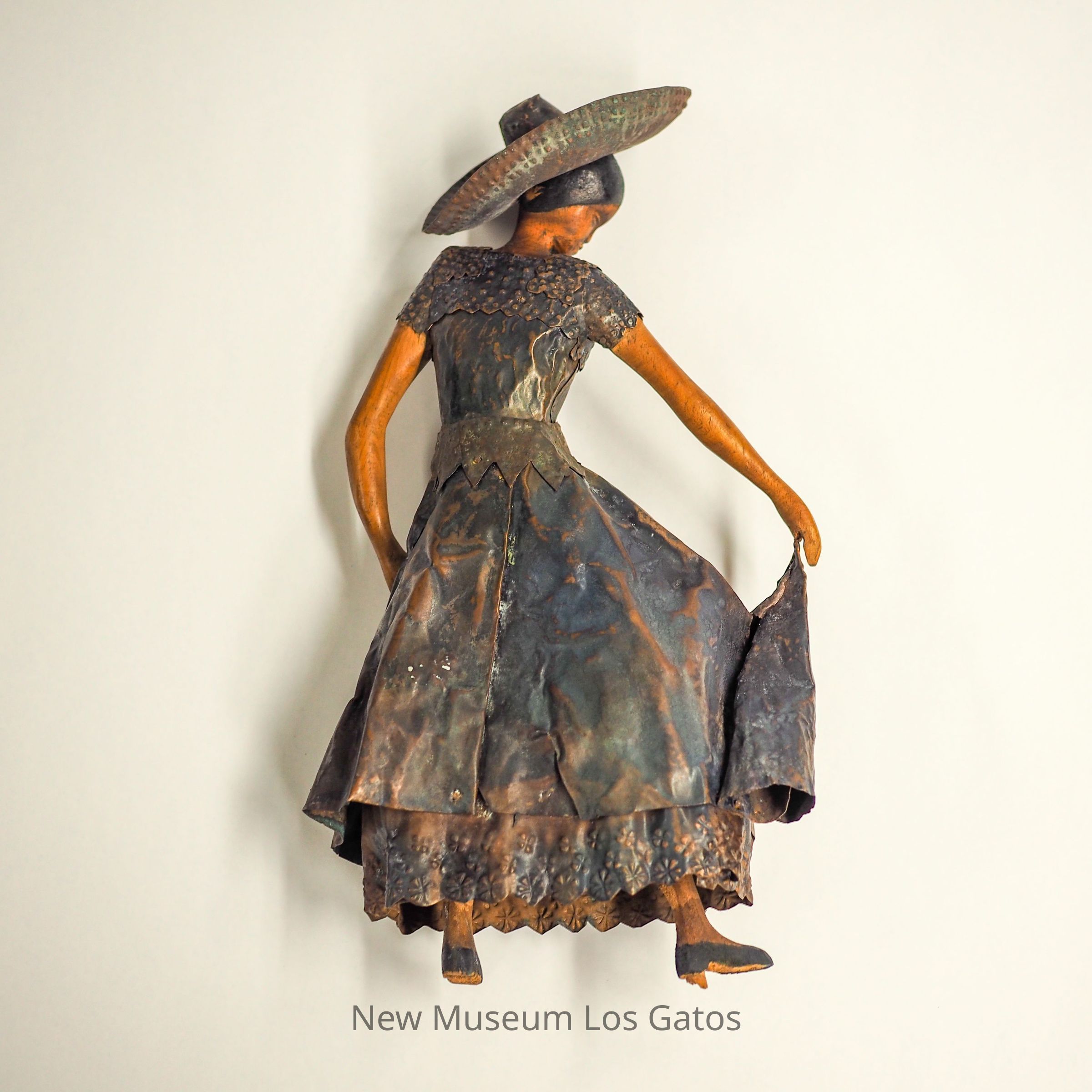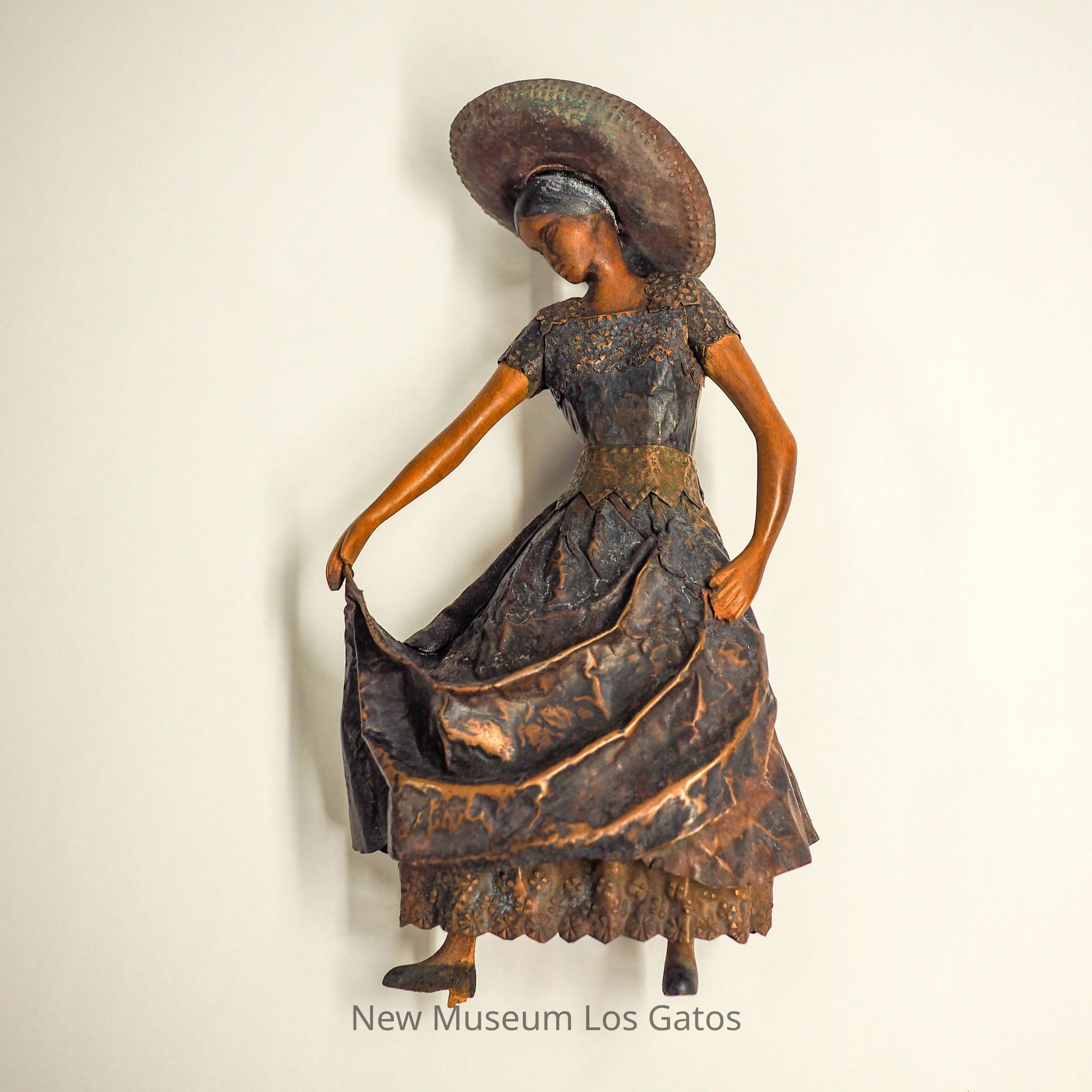 A sculpture of a dancing woman wearing a broad-brimmed hat, possibly a sombrero, and a long flowing dress. The woman is carved from wood and the dress and hat are made from metal.Collection