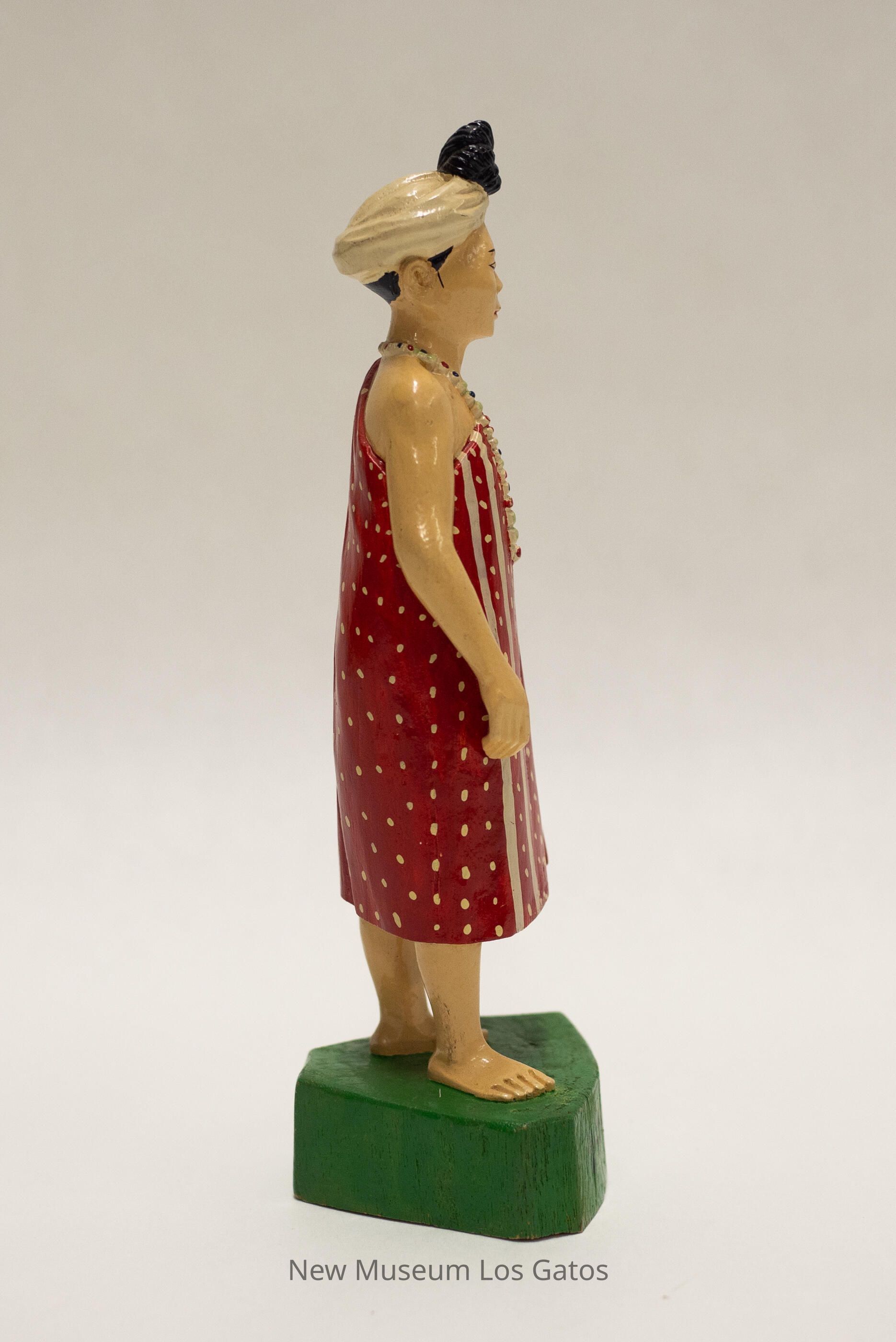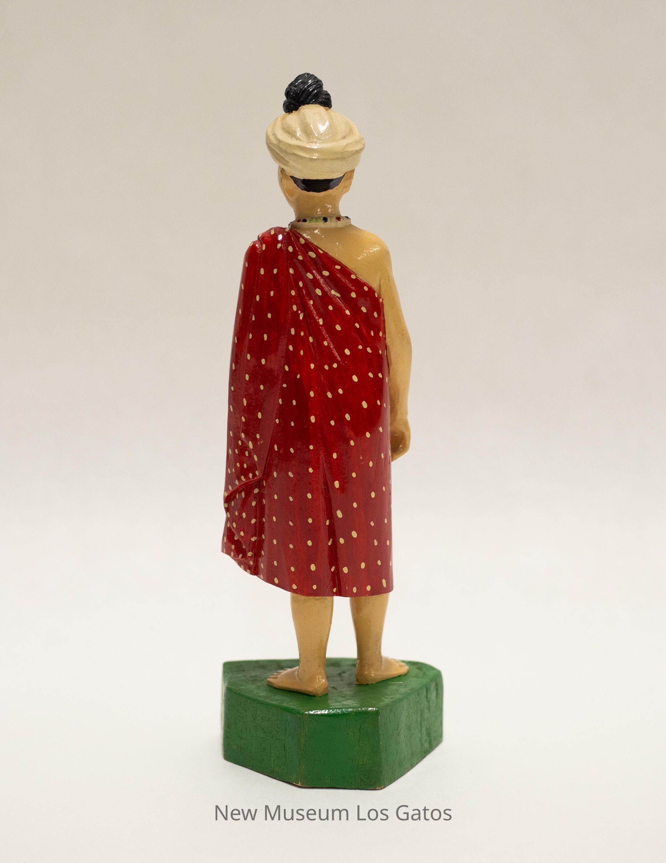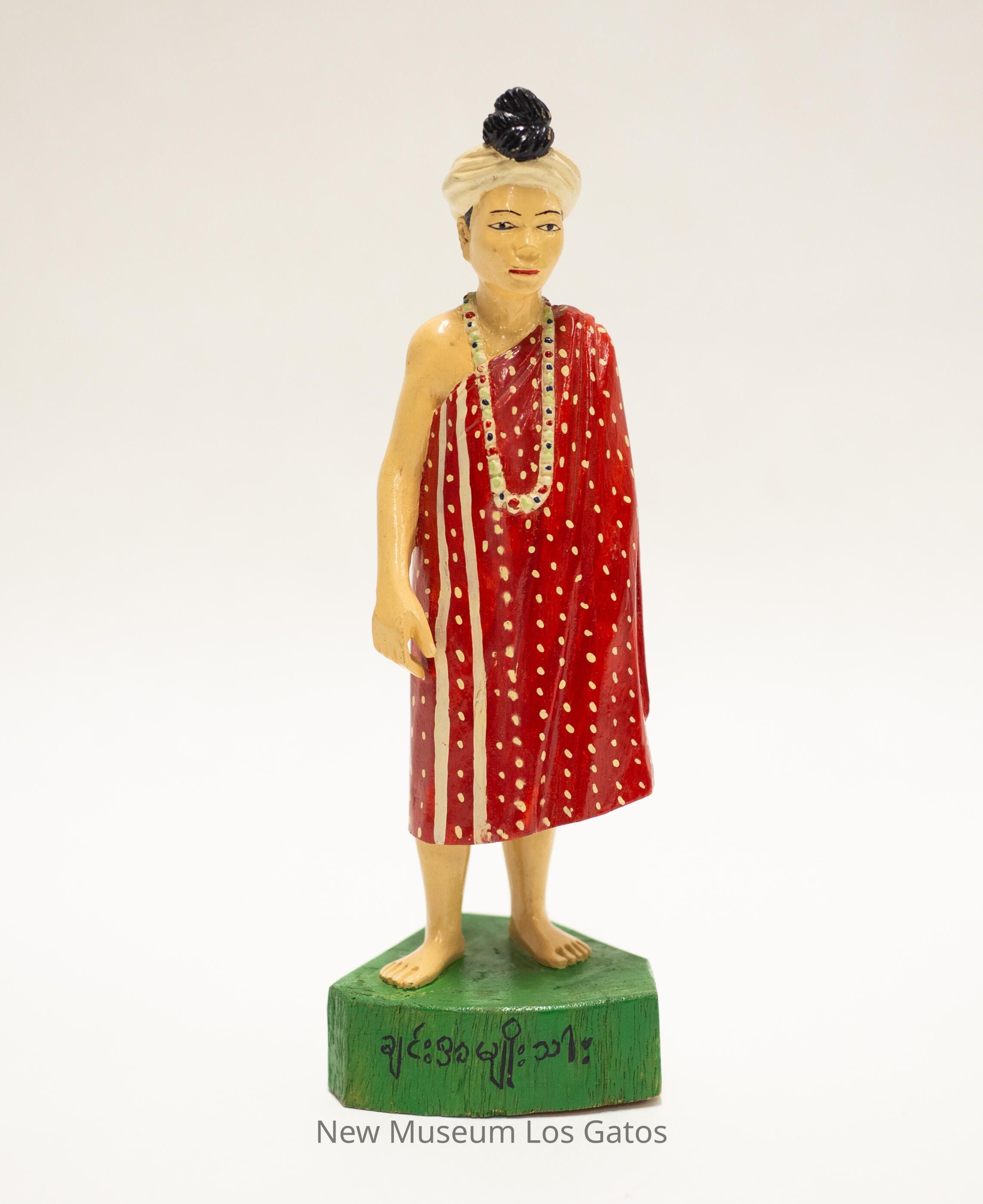 A painted carved wooden figurine depicting a man standing on a patch of grass. The grass/base is roughly triangular, and painted green with black Burmese characters. The man has cream-colored skin, and is wearing a red over-the-shoulder wrap, exposing the right arm. The wrap has tan polka dots throughout, with two vertical stripes on the right side. The man is wearing a black, red, and green beaded necklace as well as a white turban with a black knot towards the front.Collection