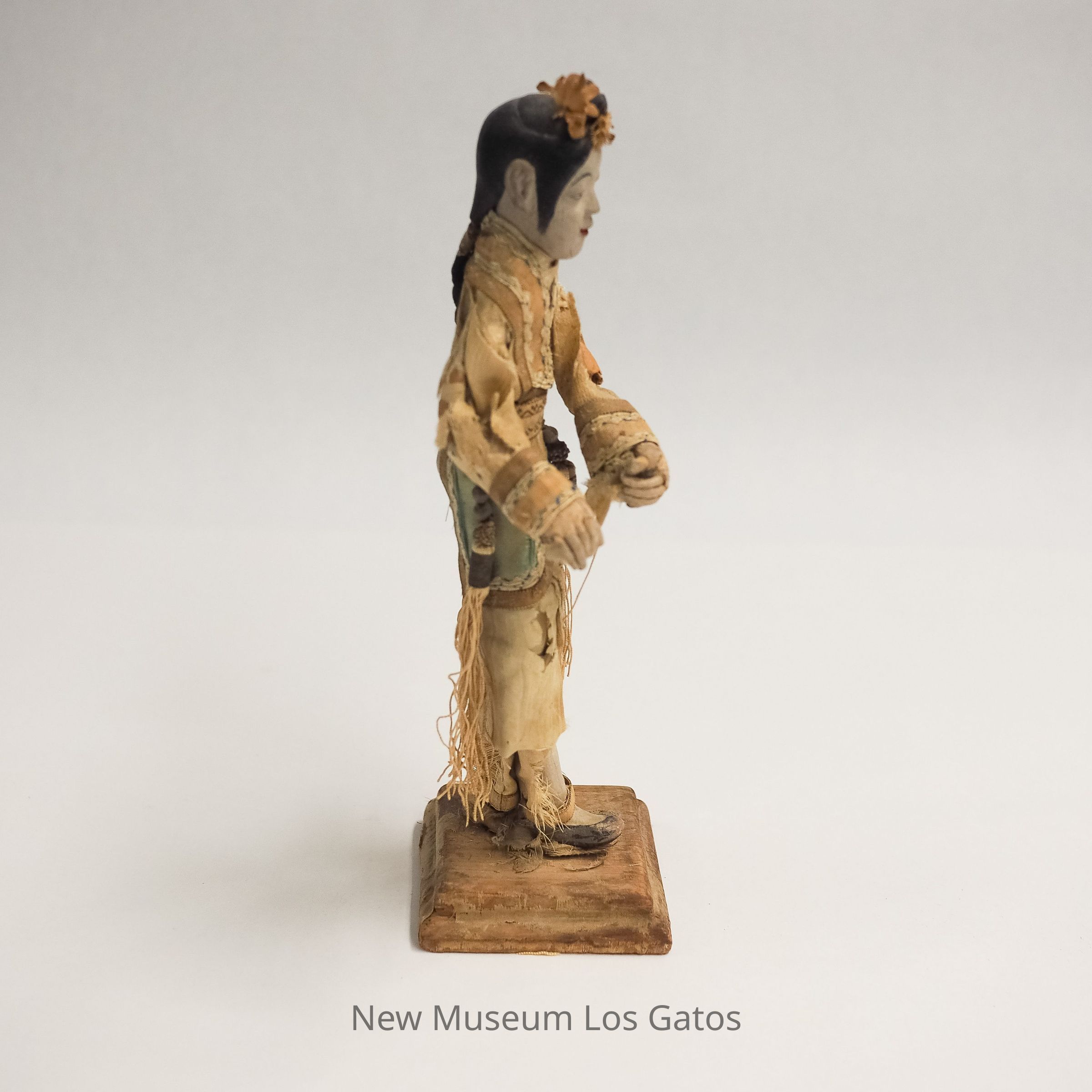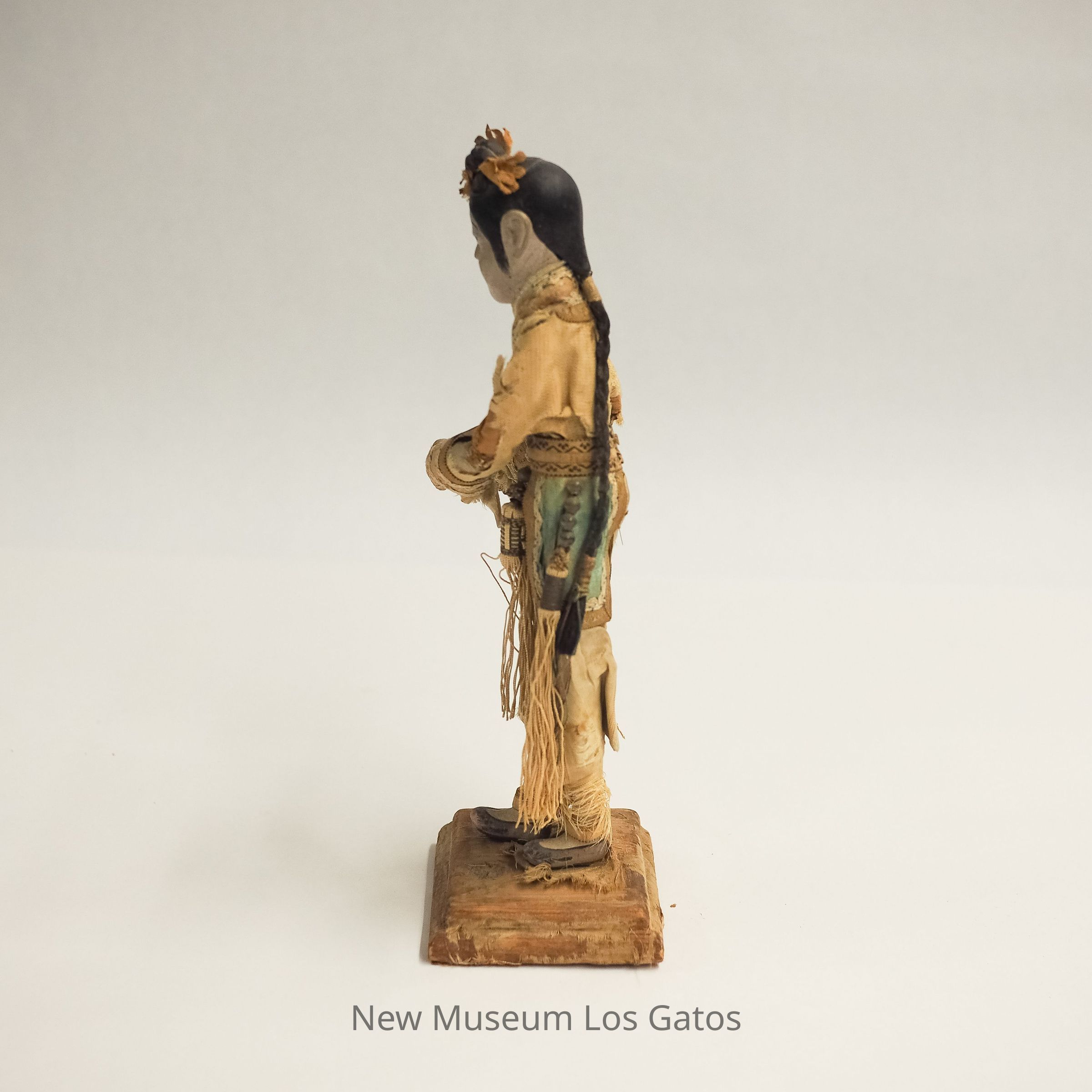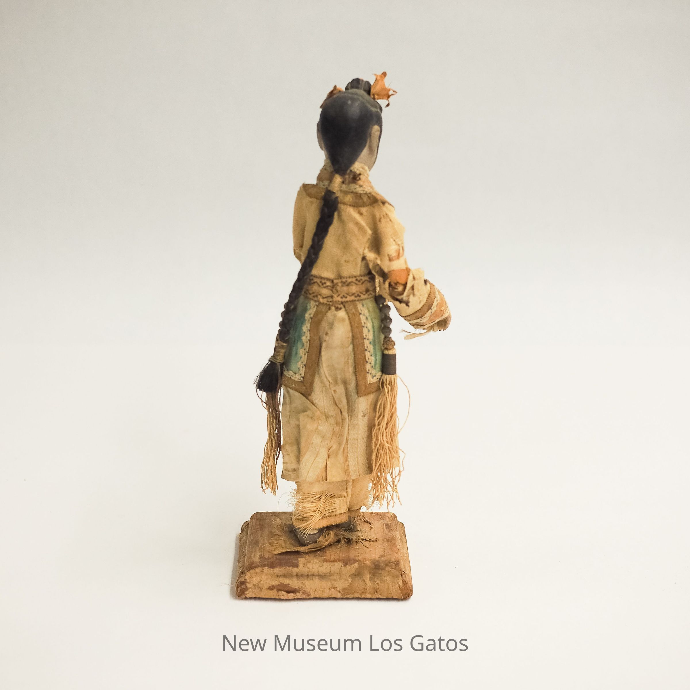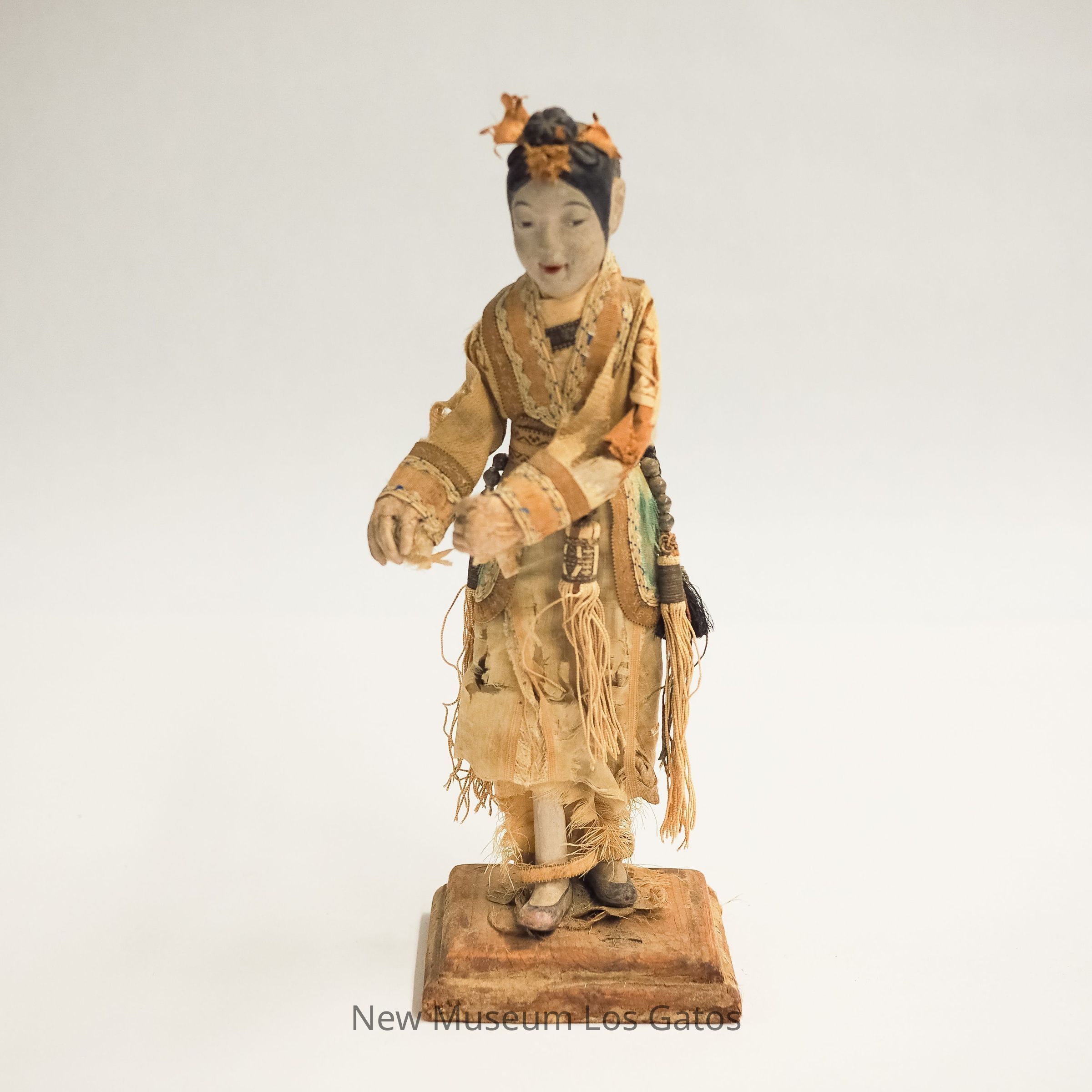 A ceramic or wood, paper, and fabric figurine in an intricately embroidered tan dress, dark slippers, and long black braided hair.Collection