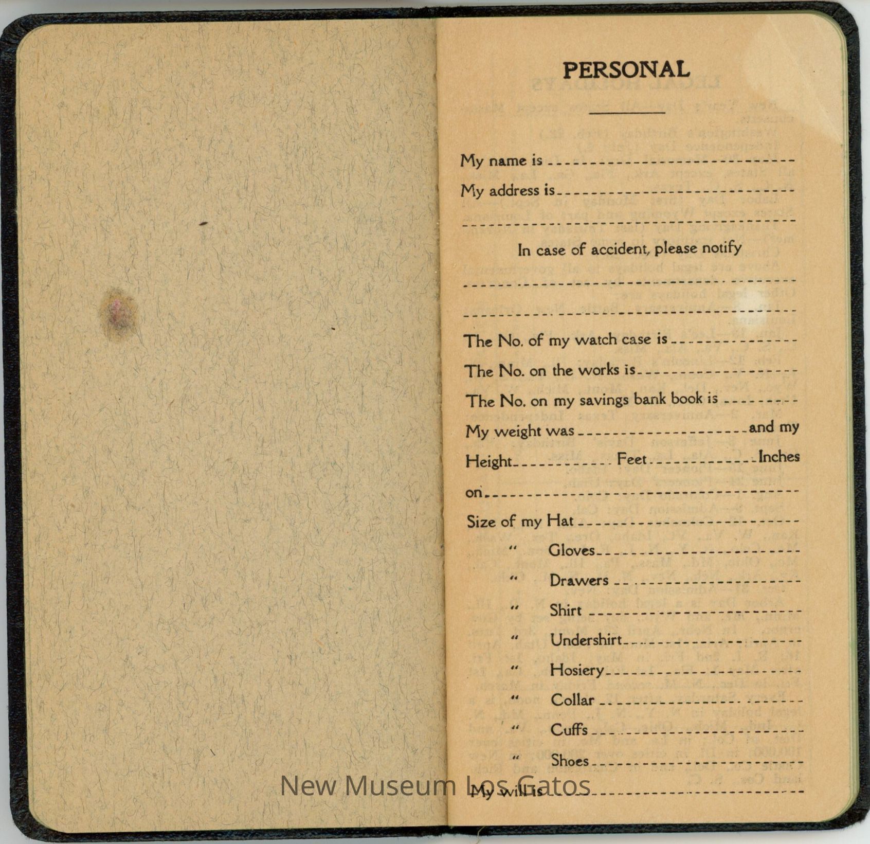 A small, black leather-bound notebook. There is a gold, gilded inscription on the front. The interior includes a page for a list of personal details, a guide to the legal holidays, a weights and measures guide, as well as builder's information. The notebook finishes with numerous blank pages.Collection