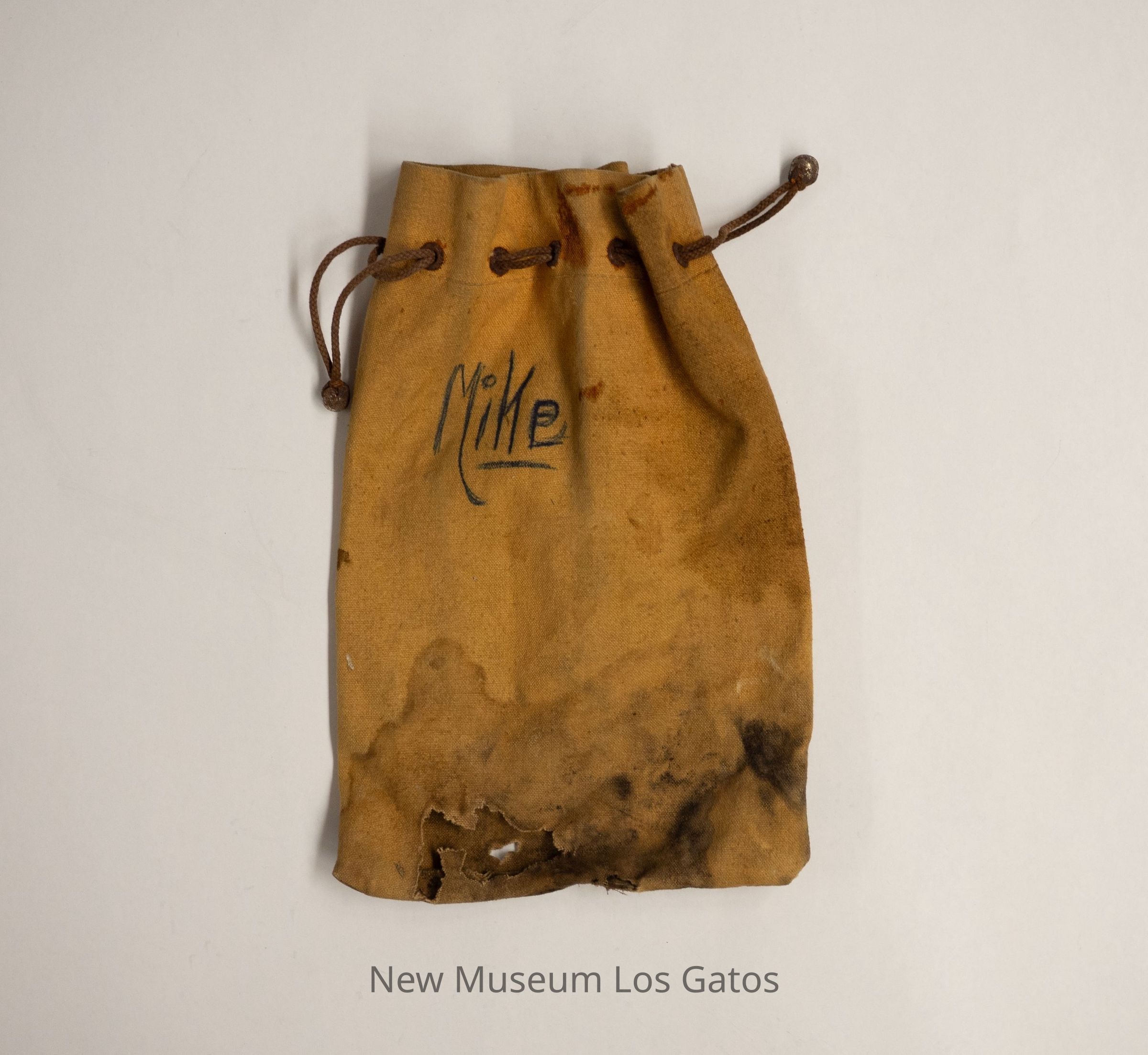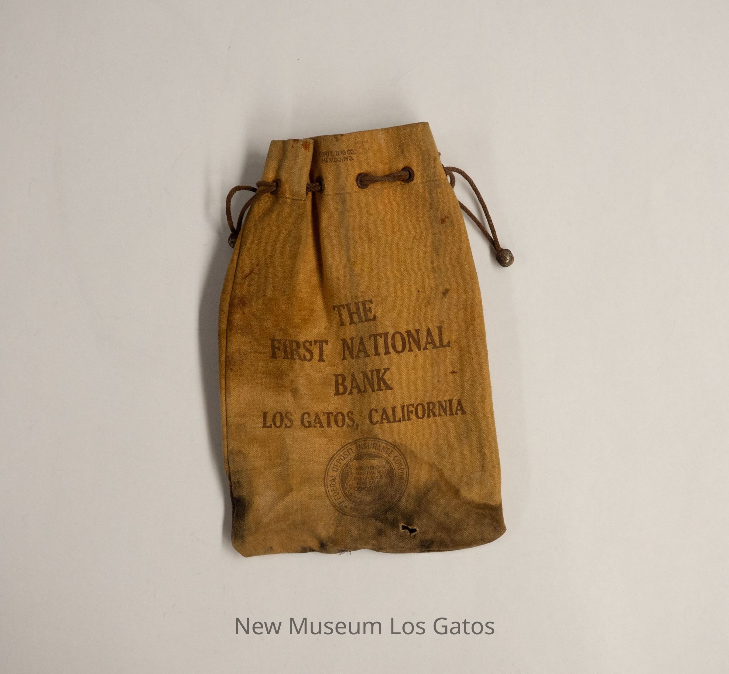 A brown canvas drawstring bag, with a brown woven string through metal grommets at the top. The bag is stamped with the bank's identifying information on one side.