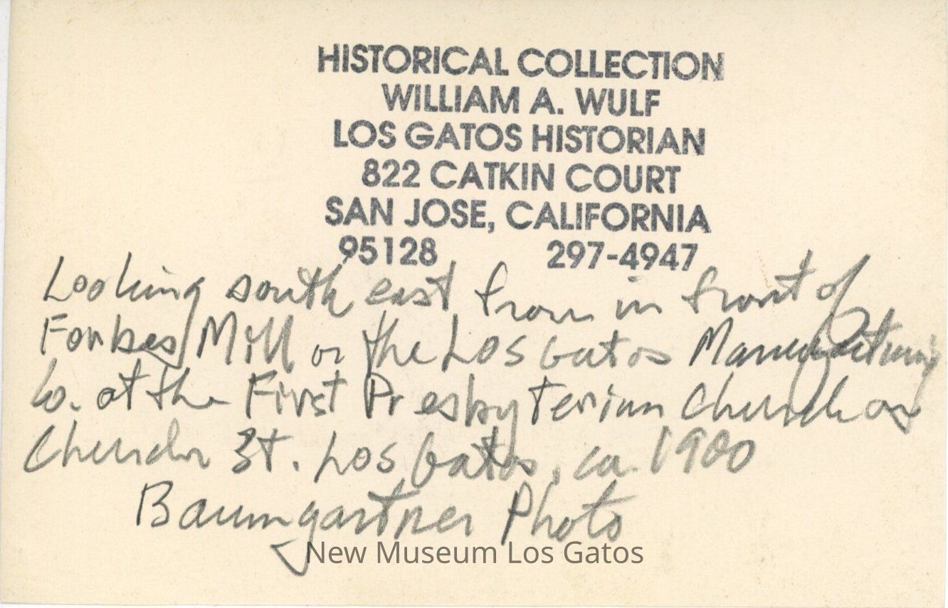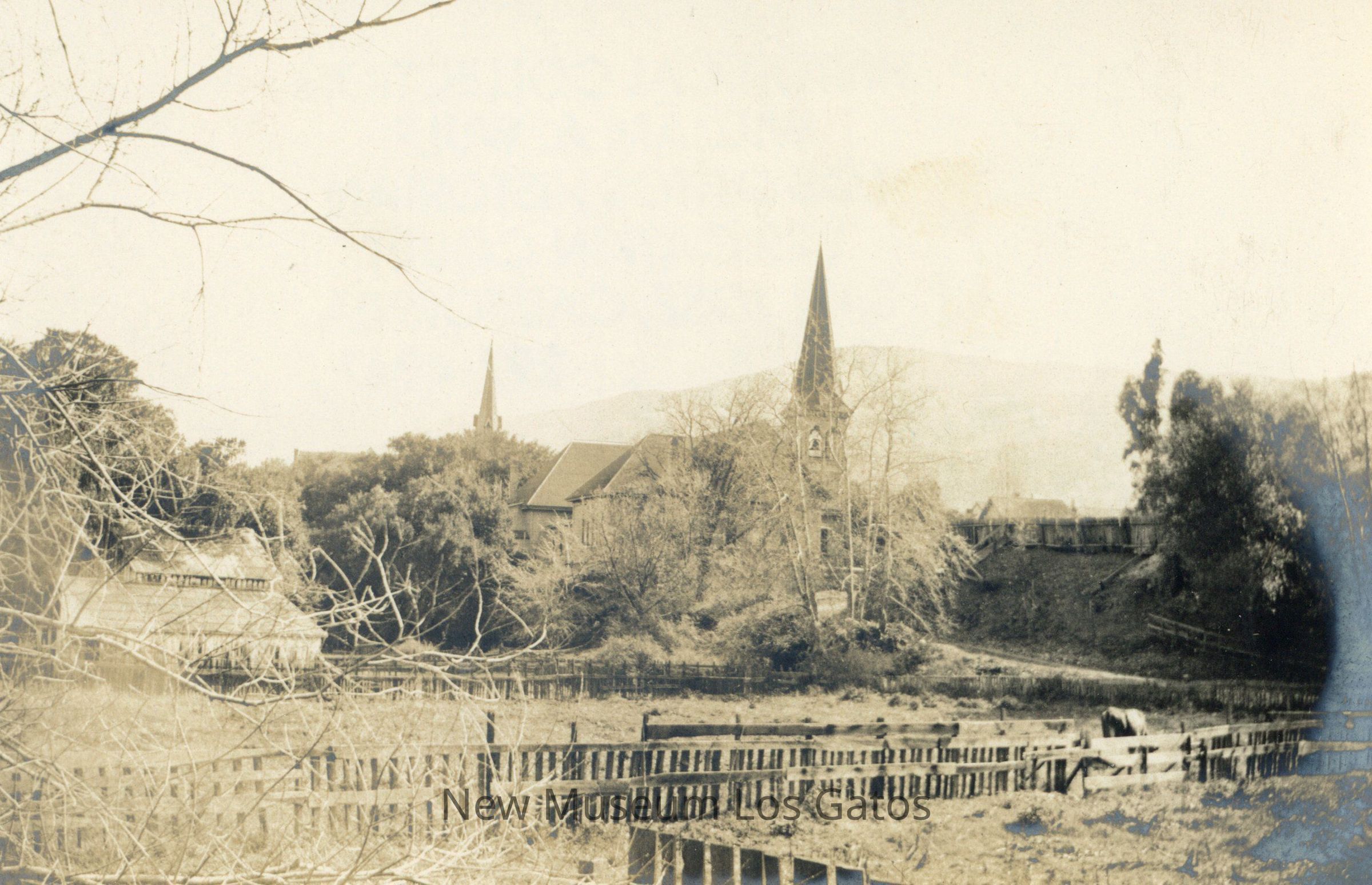 Looking south east from in front of Forbes Mill or the Los Gatos Manufacturing Co. at the First Presbyterian Church on Church St. Los Gatos, ca. 1900