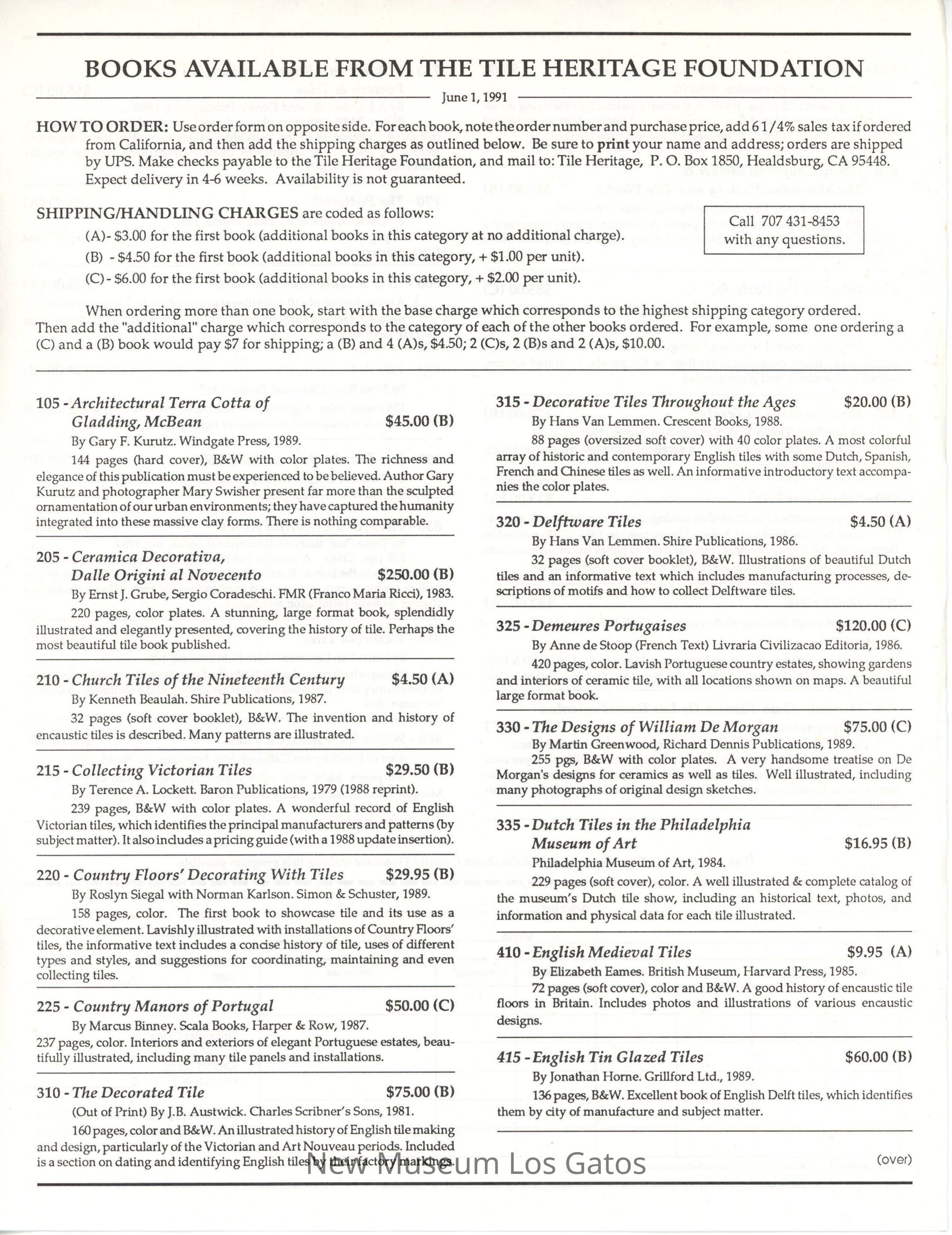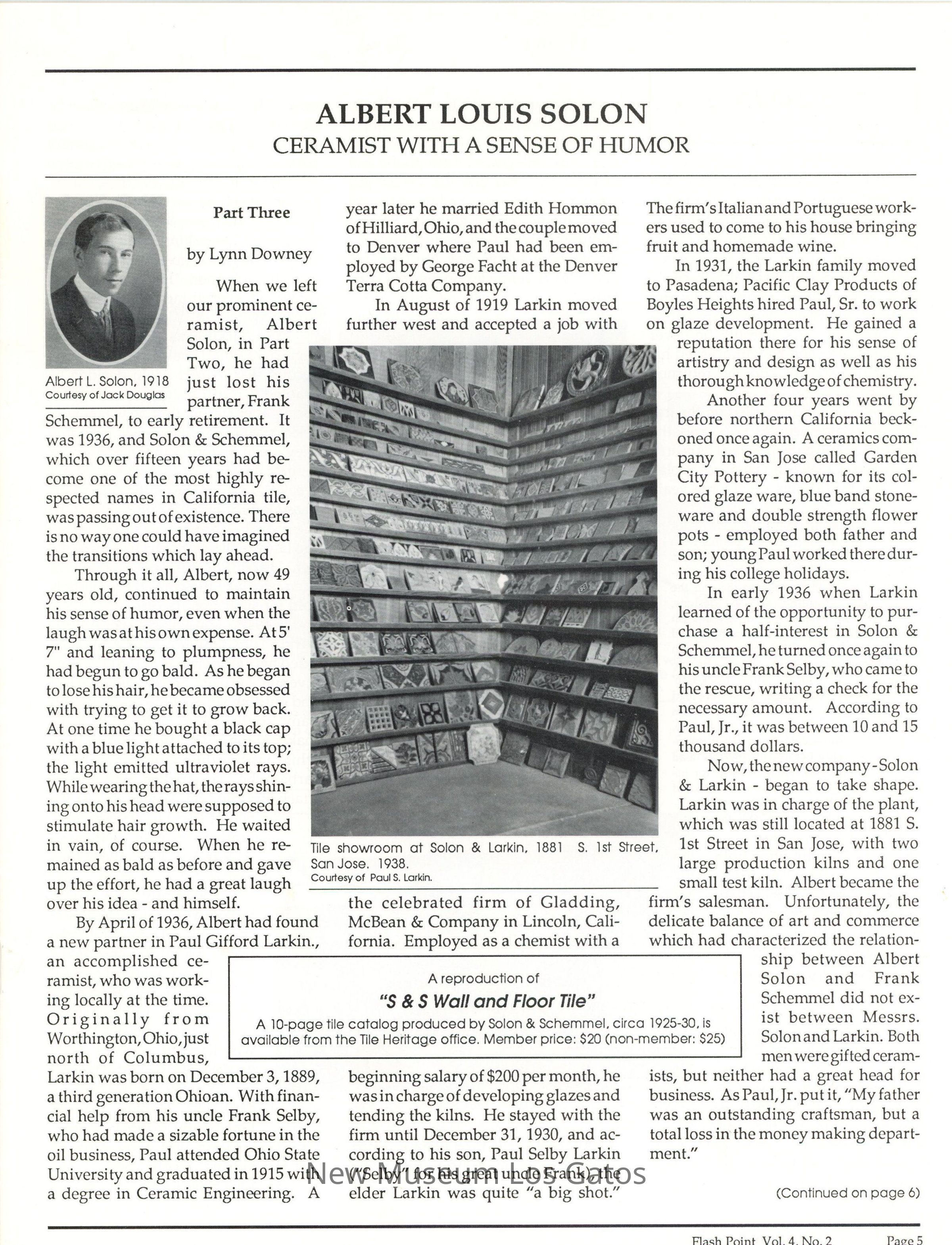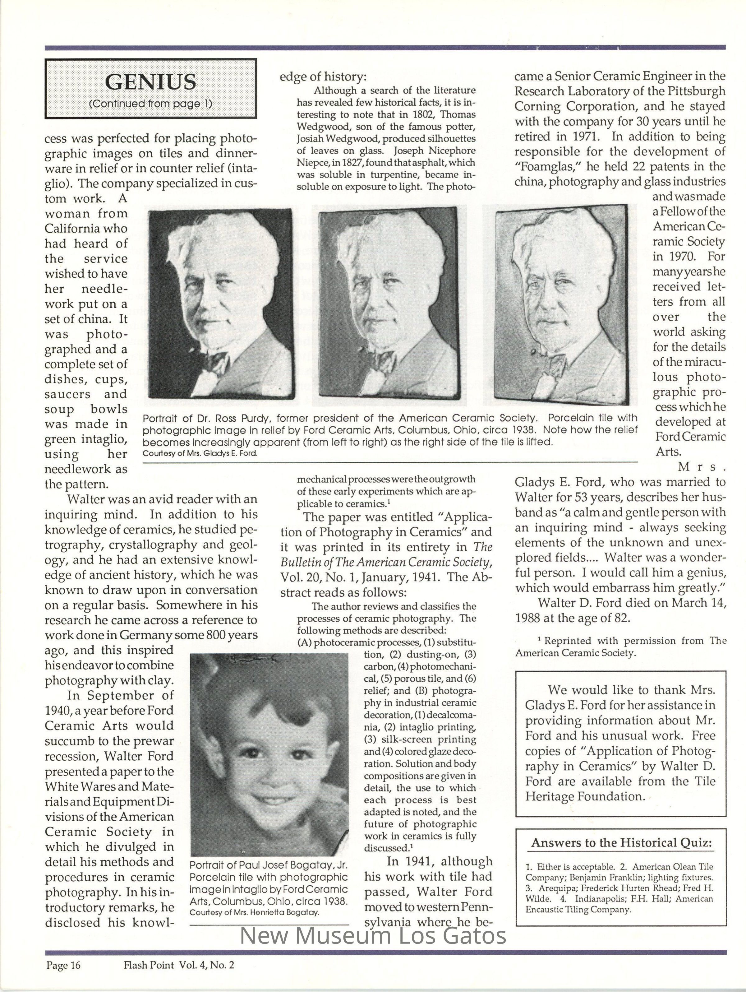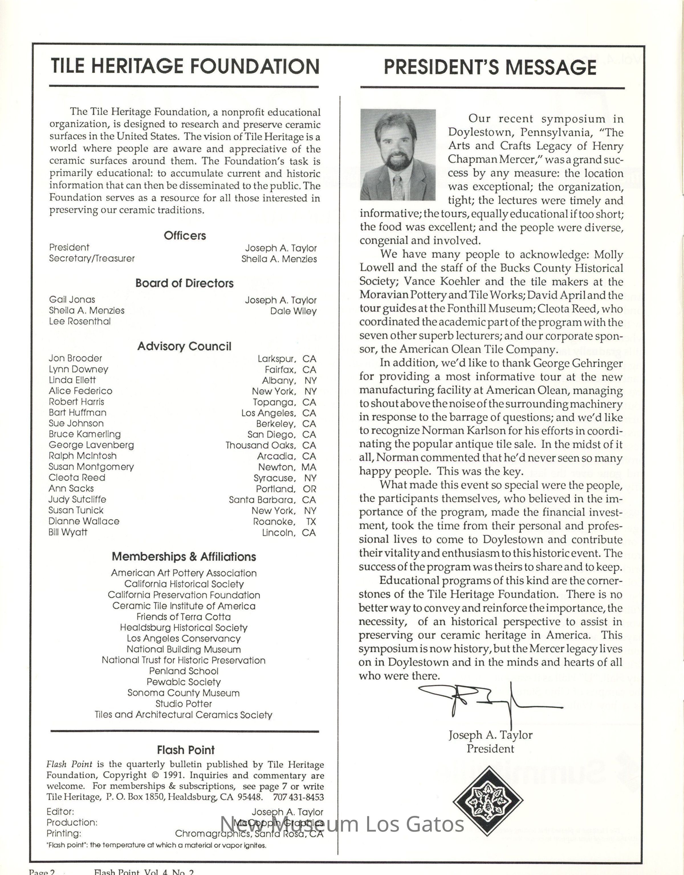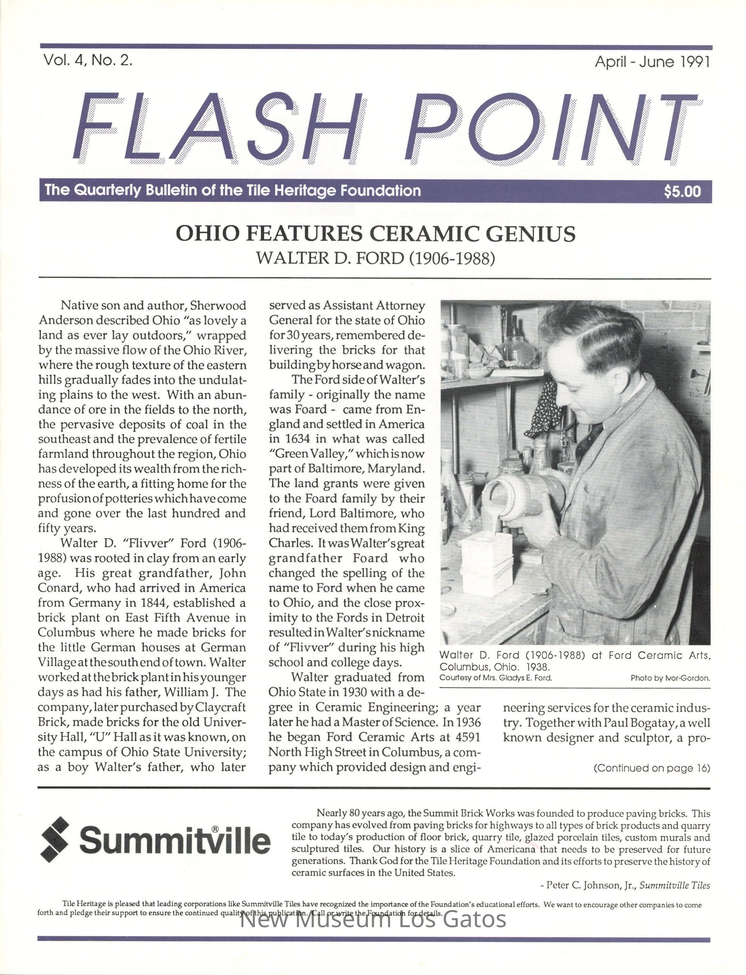Flashpoint newsletter, published by the Tile Heritage Foundation, April-June 1991. The newsletter contains articles, advertisements, photographs, subscription forms, trivia games, and other organization-related news. The newsletter is 16 pages, with an included mail-order form tucked between the pages.Collection