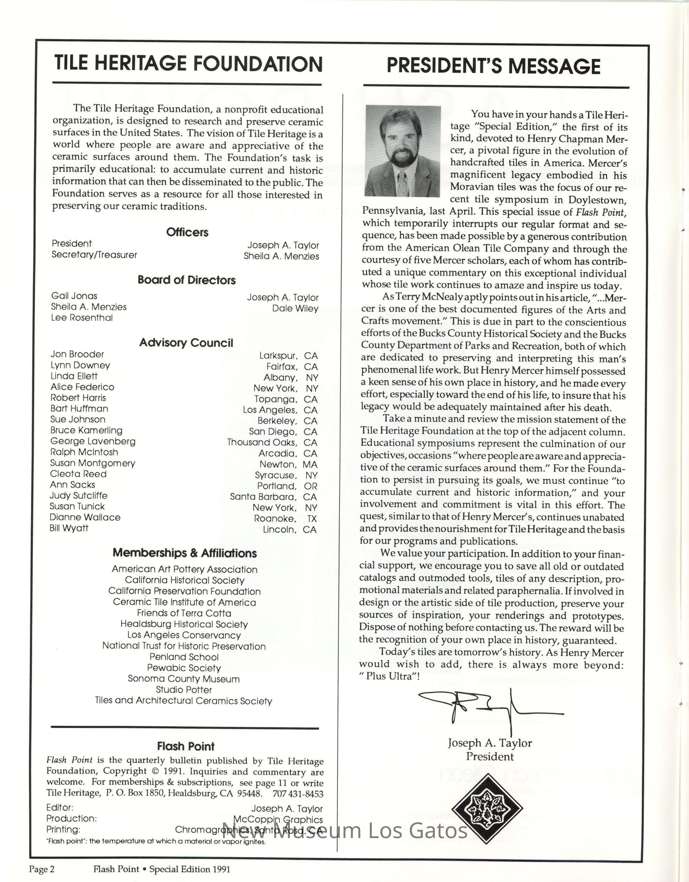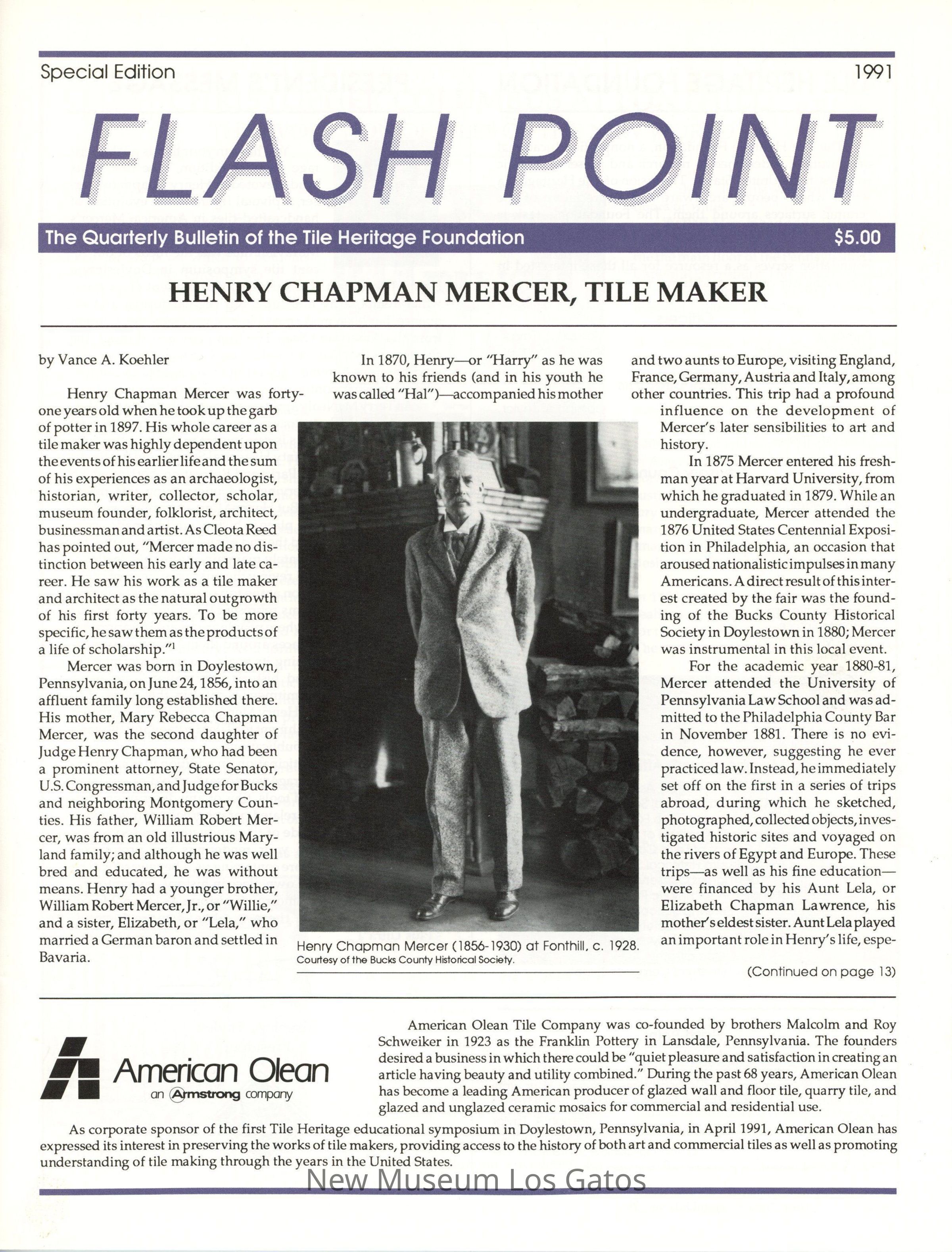 Flashpoint newsletter, published by the Tile Heritage Foundation, a special edition from 1991. The special edition contains a complete profile on artist Henry Chapman Mercer, as well as