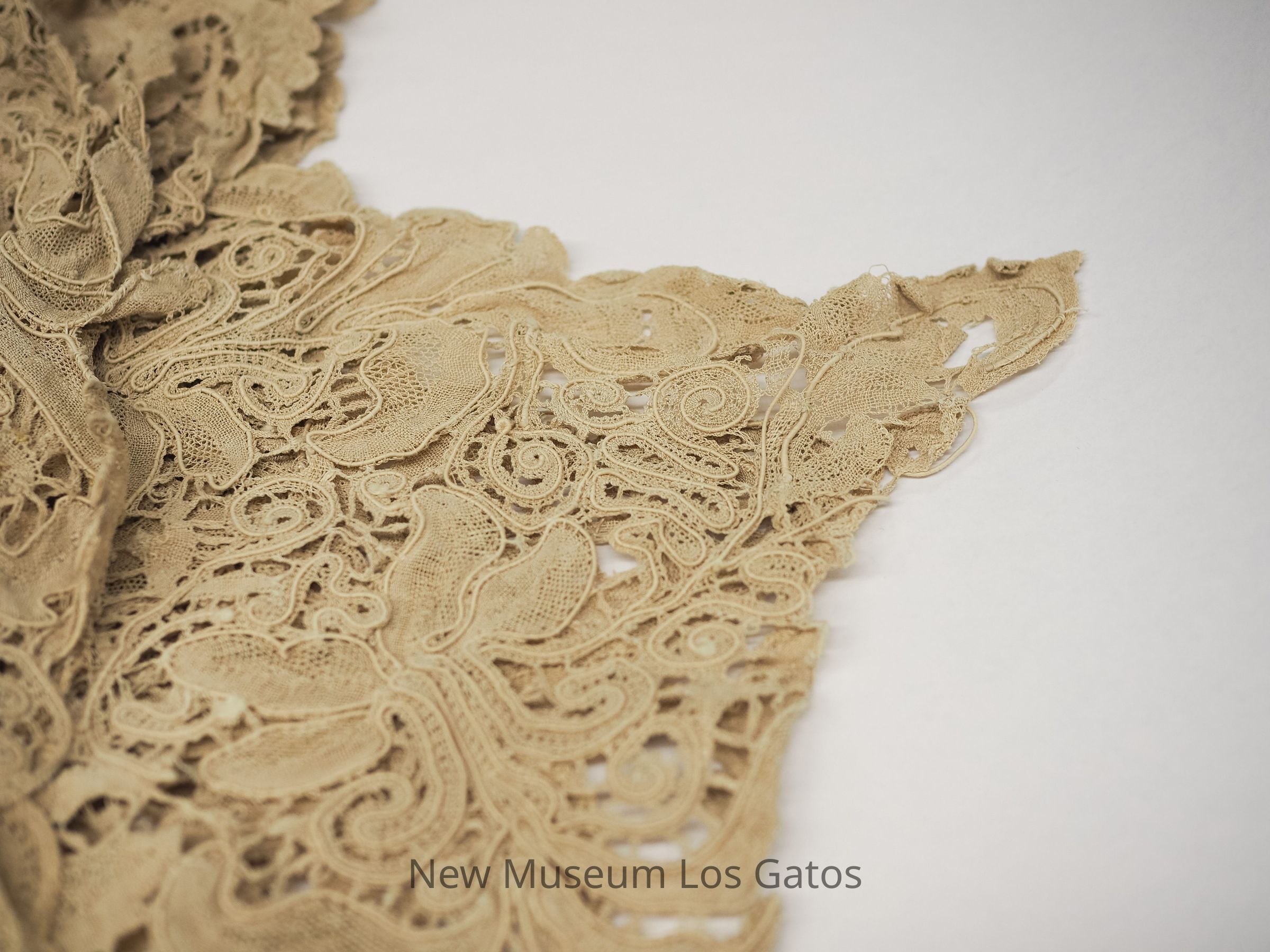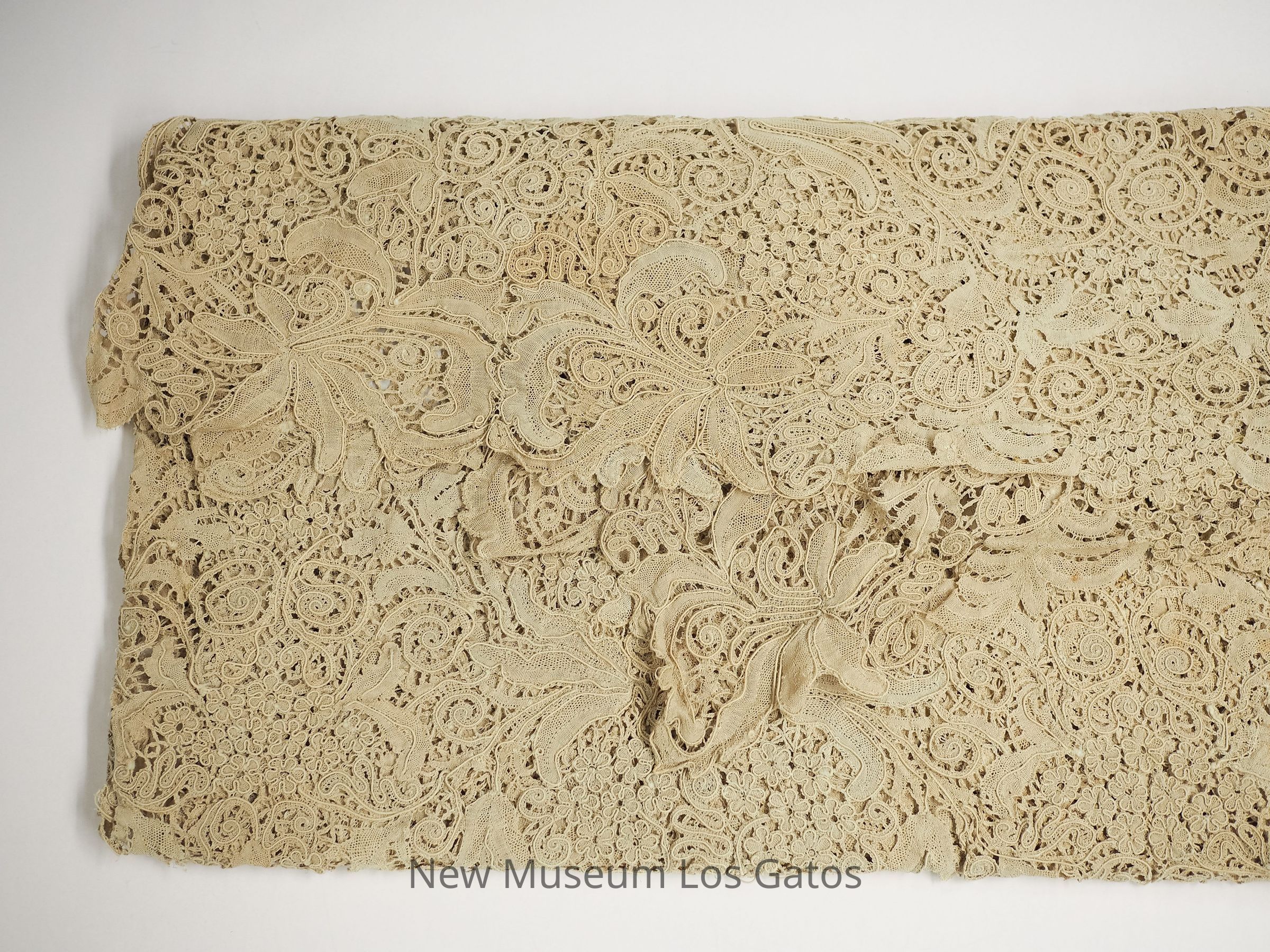 A large, lace ecru-colored tablecloth with an intricate floral design.