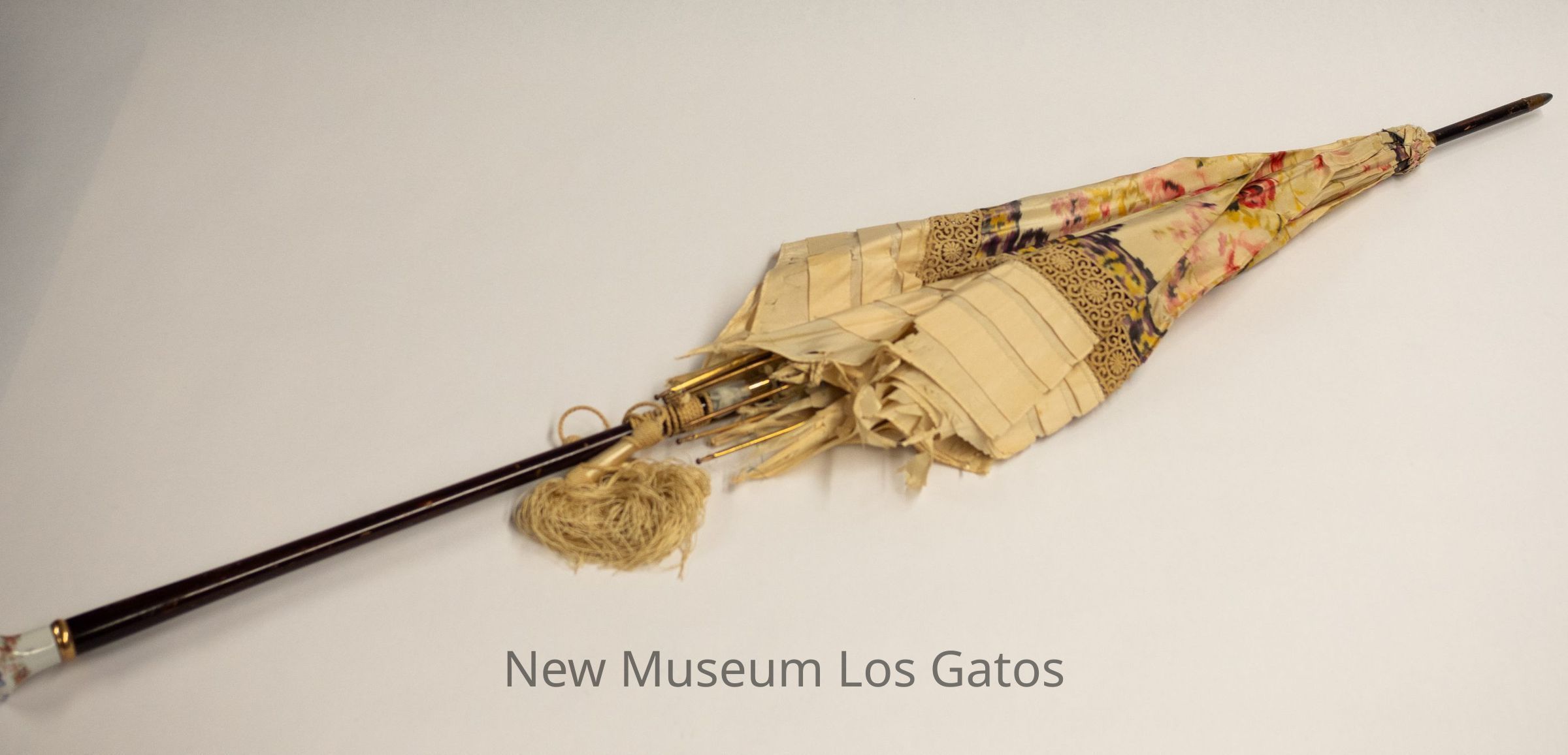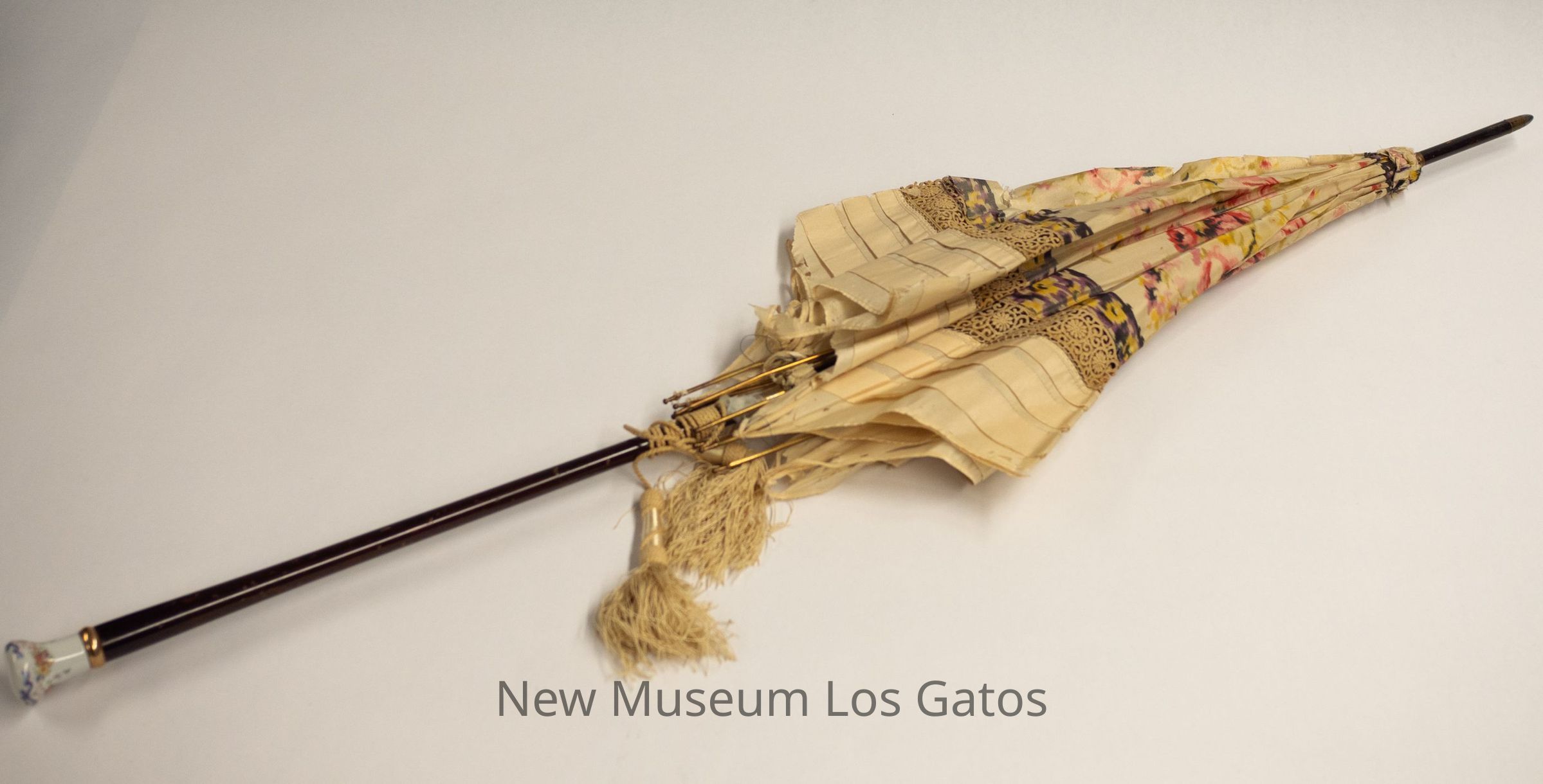 A large parasol with beige tassels, and a handle that is dark brown wood with a porcelain end. The tip has a long fine point, and is also a dark brown wood with gold and silver metal at the end. The umbrella portion is beige, with beige crocheted lace inset, and a warp-painted, multi-color floral pattern on the interior.Collection