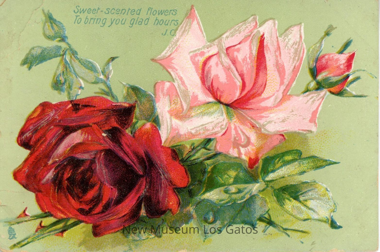 A postcard featuring an illustrated red and pink roses, with a green background.Collection
