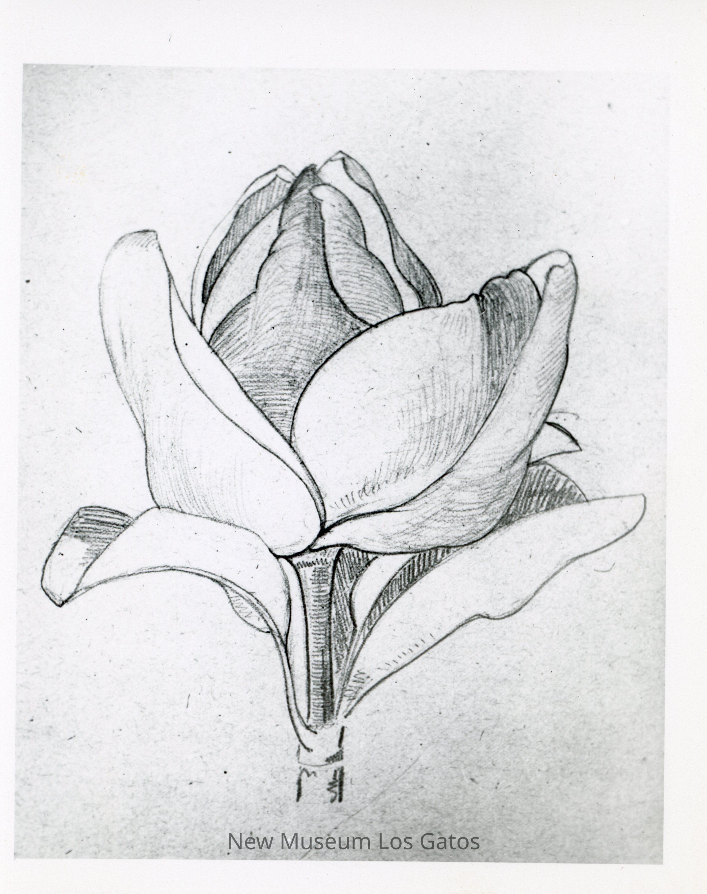 Black and white photograph of an artwork depicting a flower, most likely a drawing.