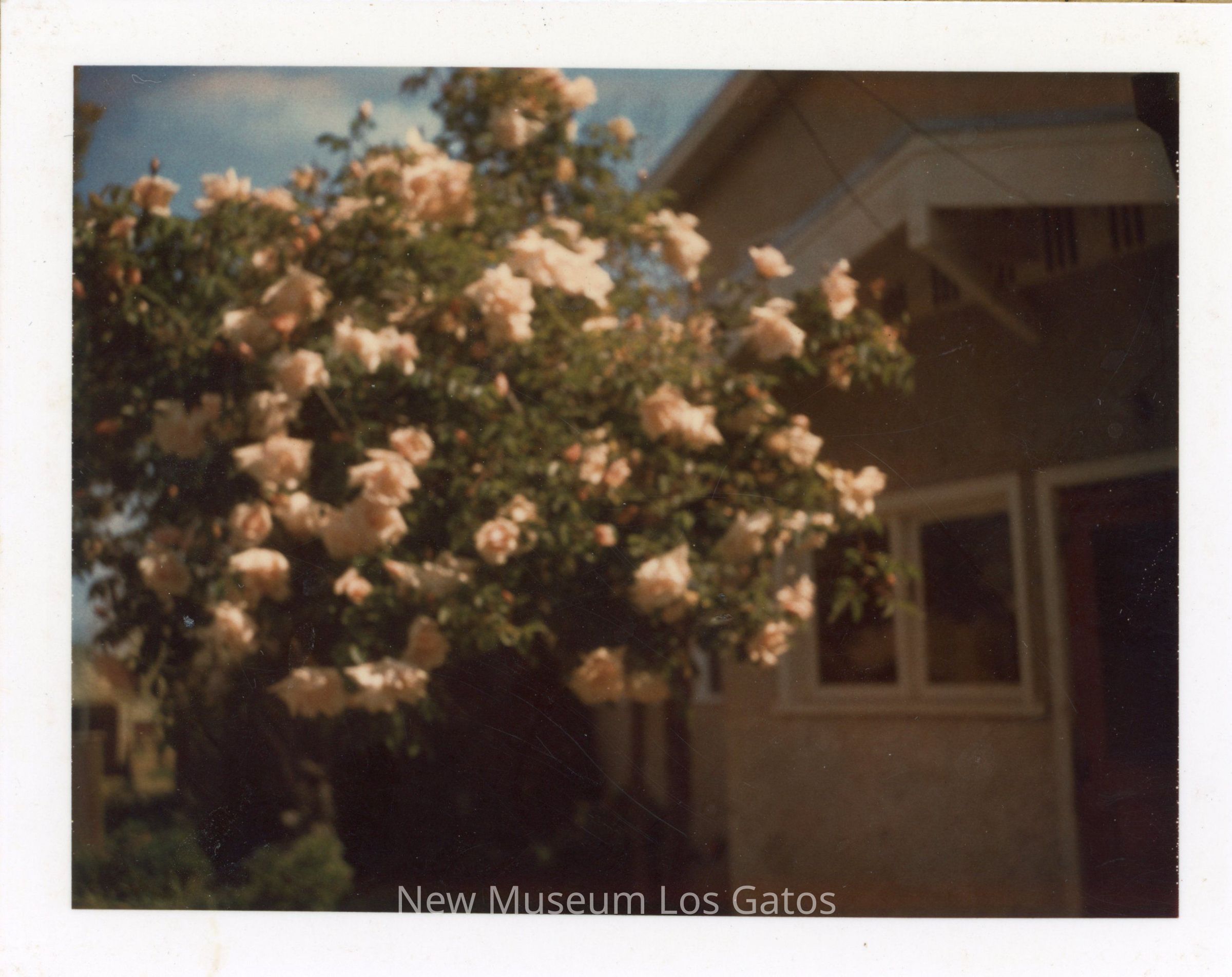 A color photograph featuring a flower bush. The bush is in the center of the image, and has numerous white/cream colored flowers throughout. There is a tan colored house in the background. The image is blurry, surrounded by a white border, and mounted onto a sturdy piece of paper/cardboard.Collection