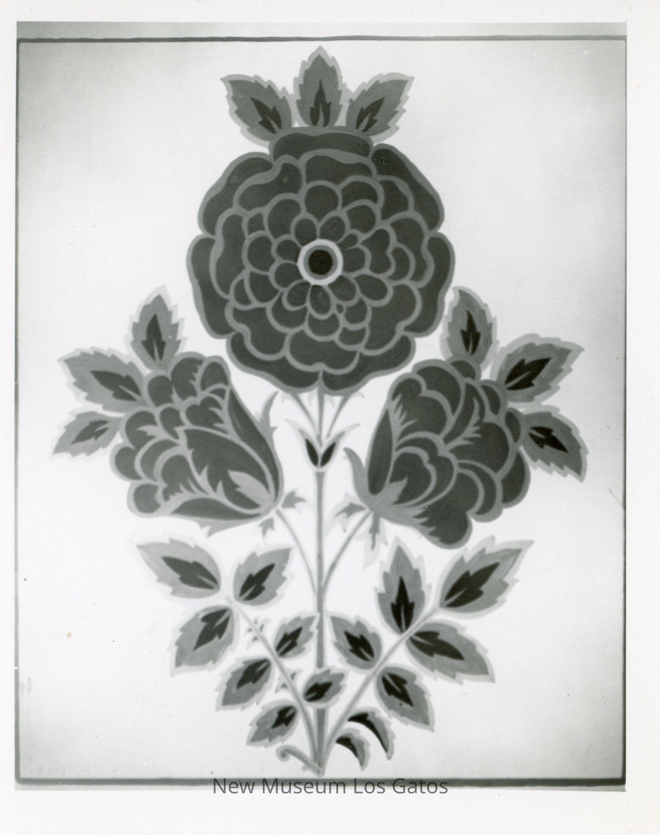 A black and white photograph of an artwork depicting flowers.