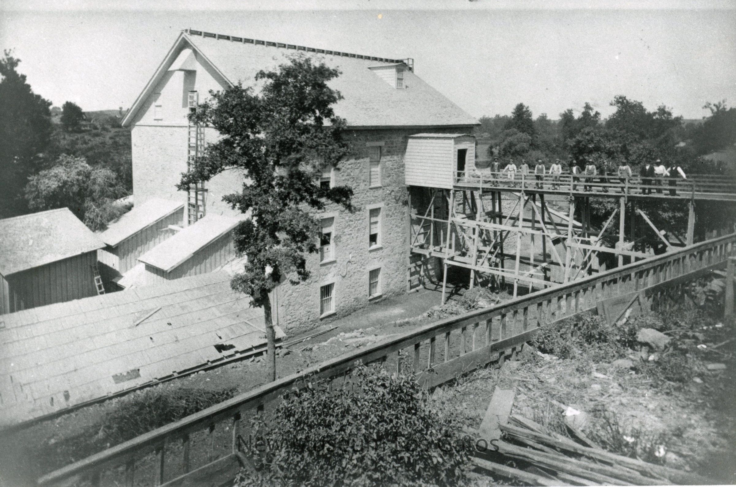 A black and white photograph of Forbes Mill, as it looked in the 1870s when it was operated as the Los Gatos Manufacturing Company. The mill and associated buildings is in the left portion of the image, with a bridge extending out of the mill towards the right of the image. There are eleven men standing on the bridge facing the camera.
