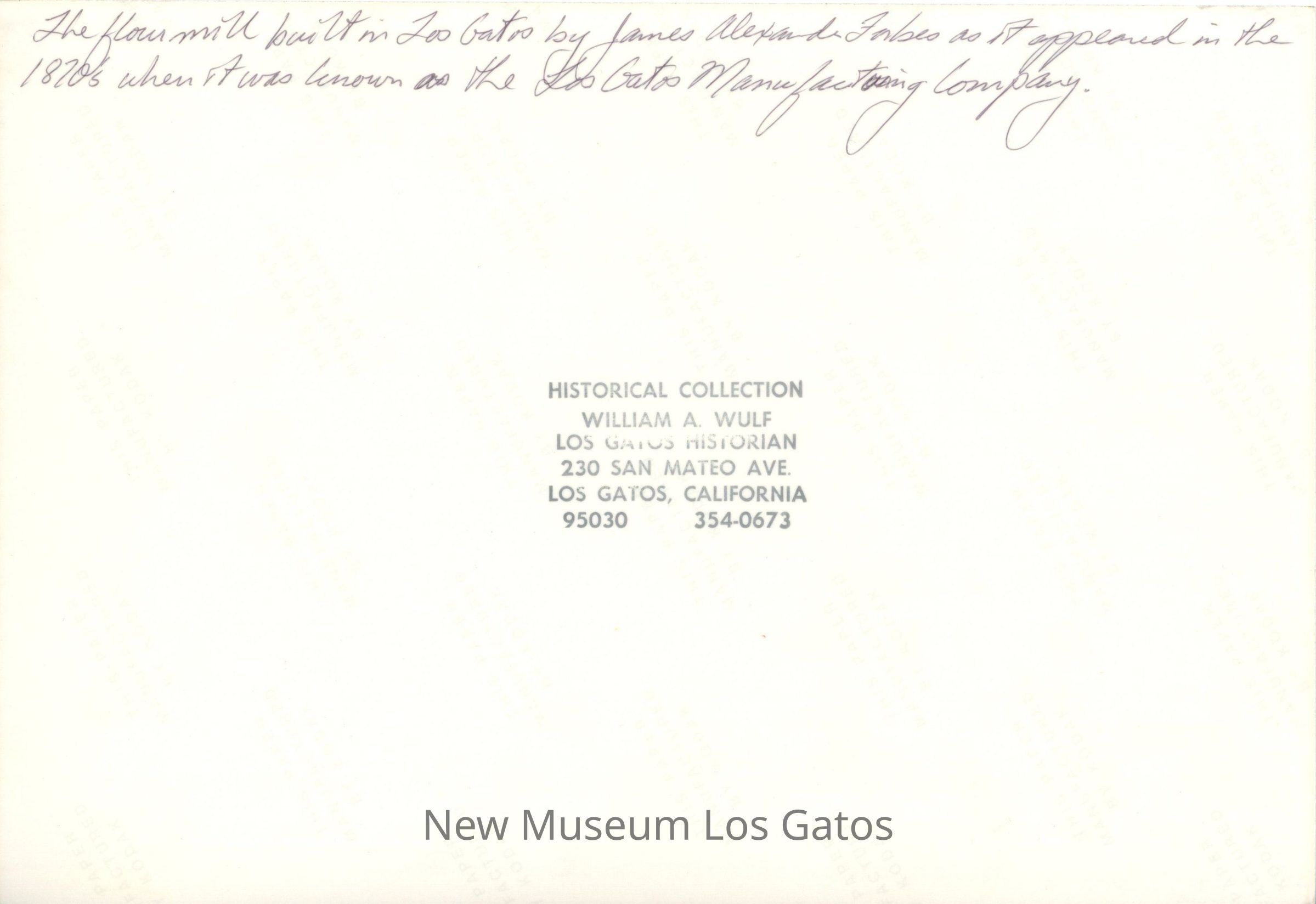 The flour mill built in Los Gatos by James Alexander Forbes as it appeared in the 1870s when it was known as the Los Gatos Manufacturing Company.