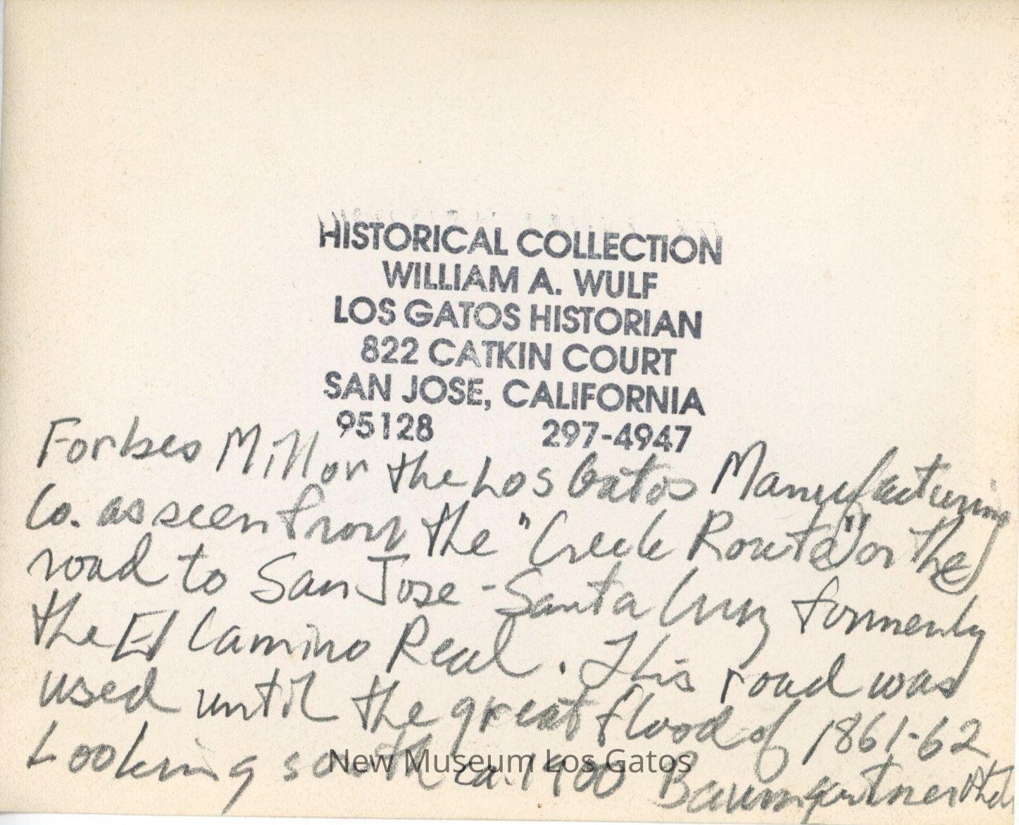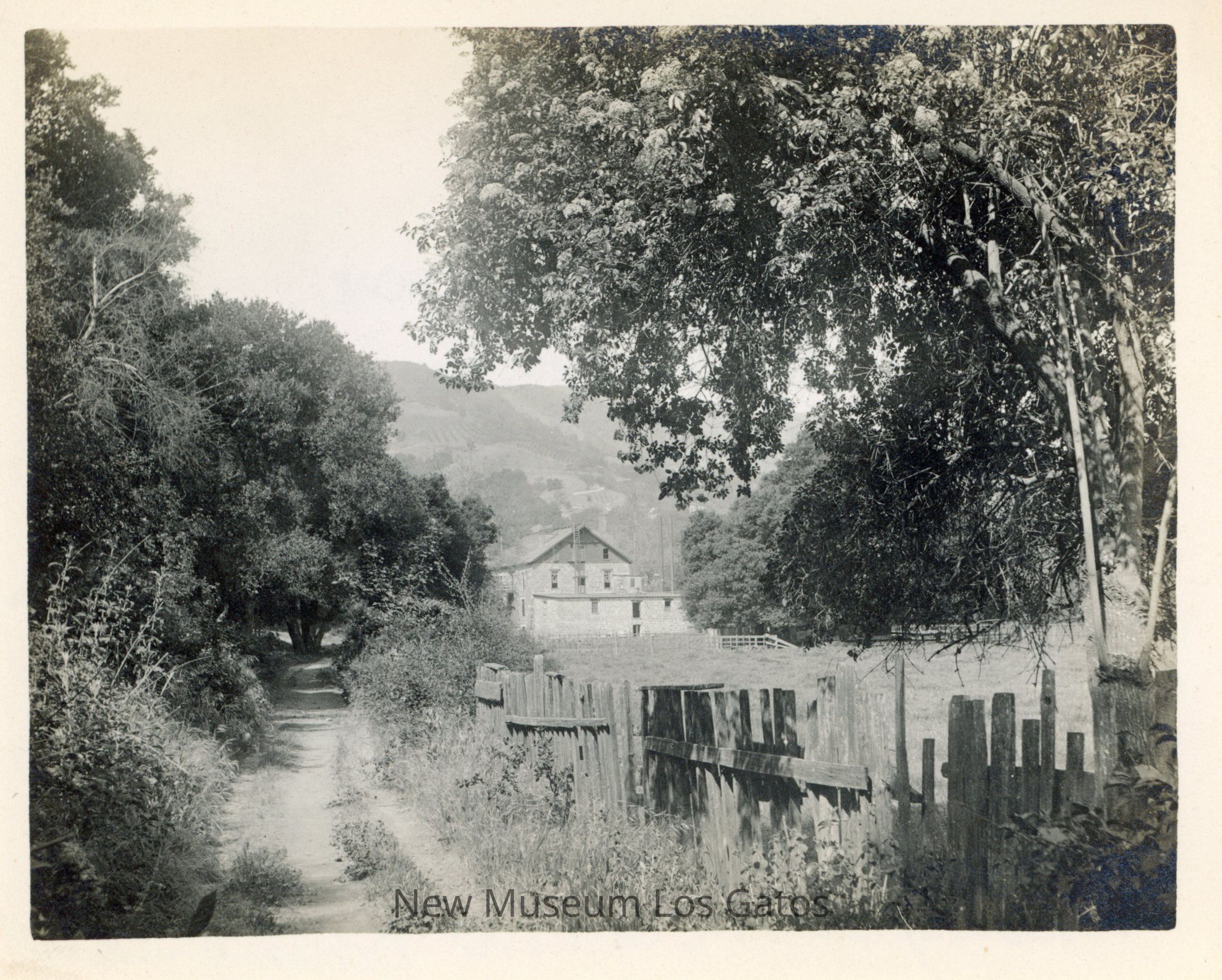 Forbes Mill or the Los Gatos Manufacturing Co. as seen from the "Creek Route" or the road to San Jose - Santa Cruz, formerly the El Camino Real. This road was used until the great flood of 1861-1862. Looking south ca. 1900 Baumgartner PhotoLanguage