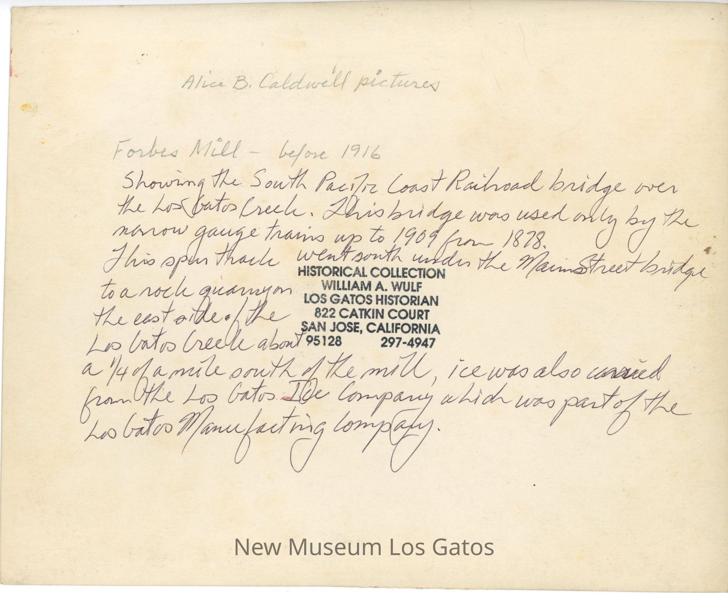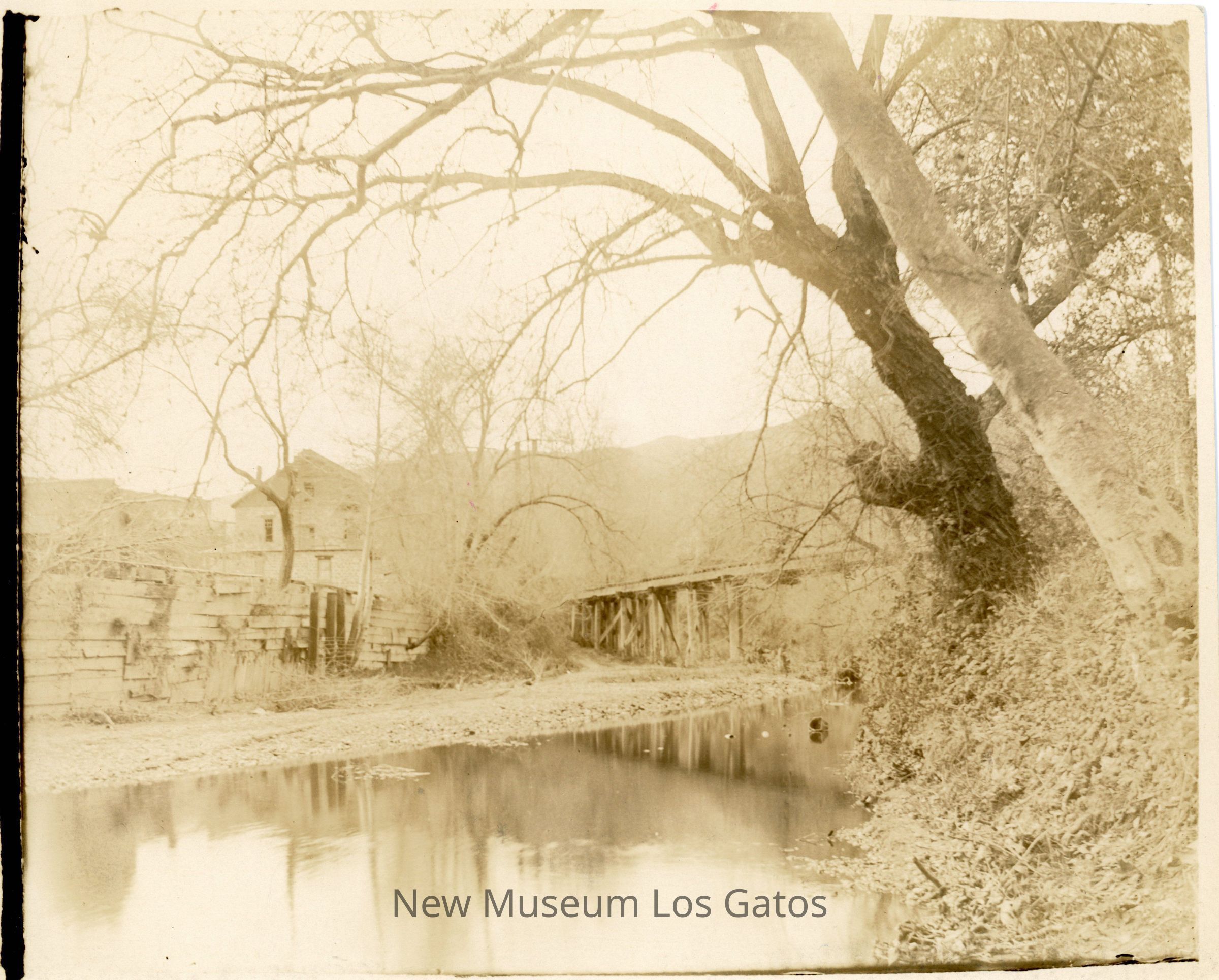 Showing the South Pacific Coast Railroad bridge over the Los Gatos Creek. This bridge was used only by the narrow gauge trains up to 1909 from 1878. This spur track went south under the Main Street bridge to a rock quarry on the east side of the Los Gatos Creek about a 1/4 of a mile south of the mill, ice was also carried from the Los Gatos Ice Company which was part of the Los Gatos Manufacturing Company.Language