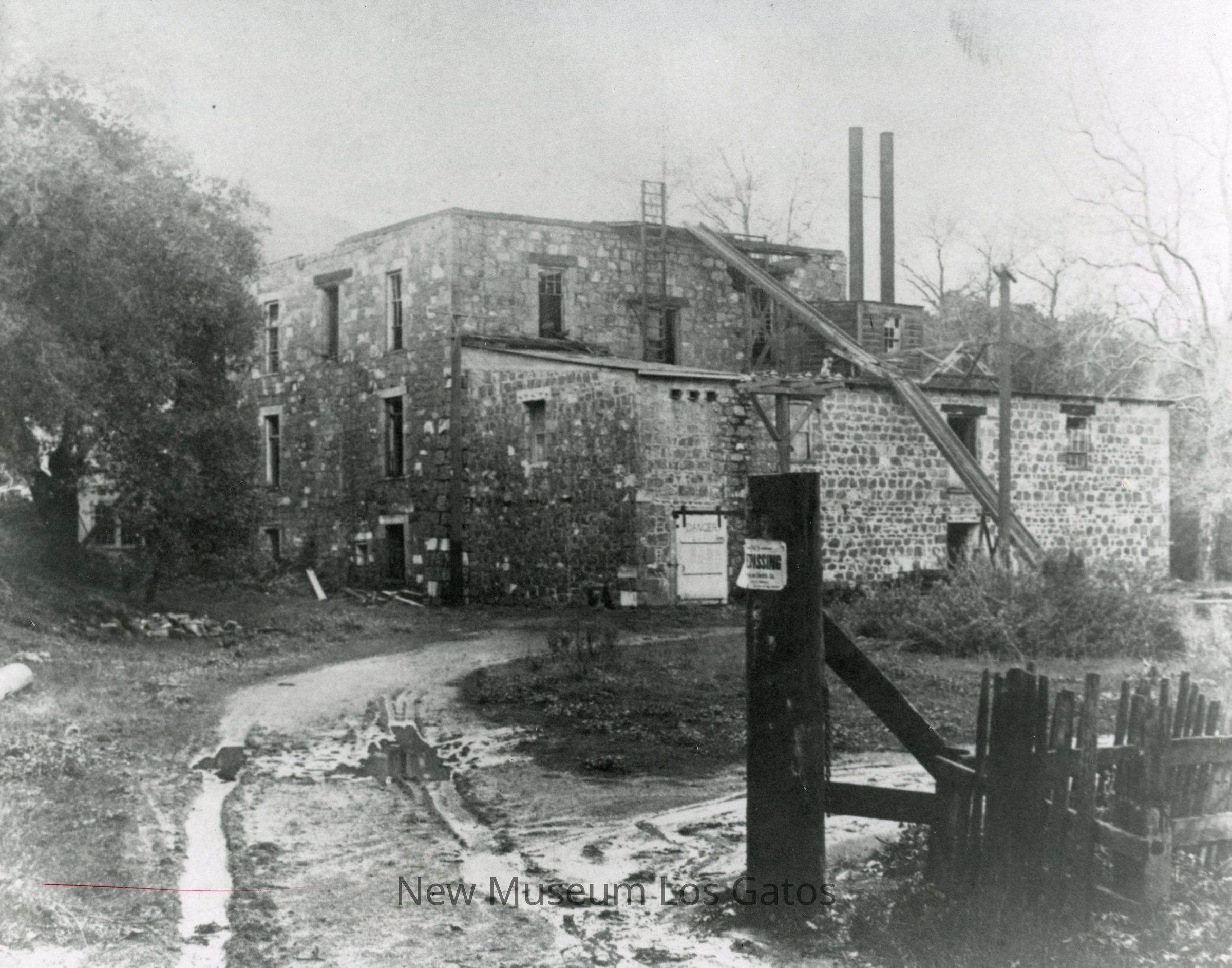 A black and white photograph of Forbes Mill. The photograph is taken from the perspective of the left corner of the mill and annex, and features the mill and annex in the background, with a tree off to the left. There is a muddy dirt path leading up to the mill, with a wooden post and wooden fence in the foreground, to the right. The mill is missing its roof. The photograph is most likely an enlargement, and has a white border around the left, bottom, and right edges.Photograph Details