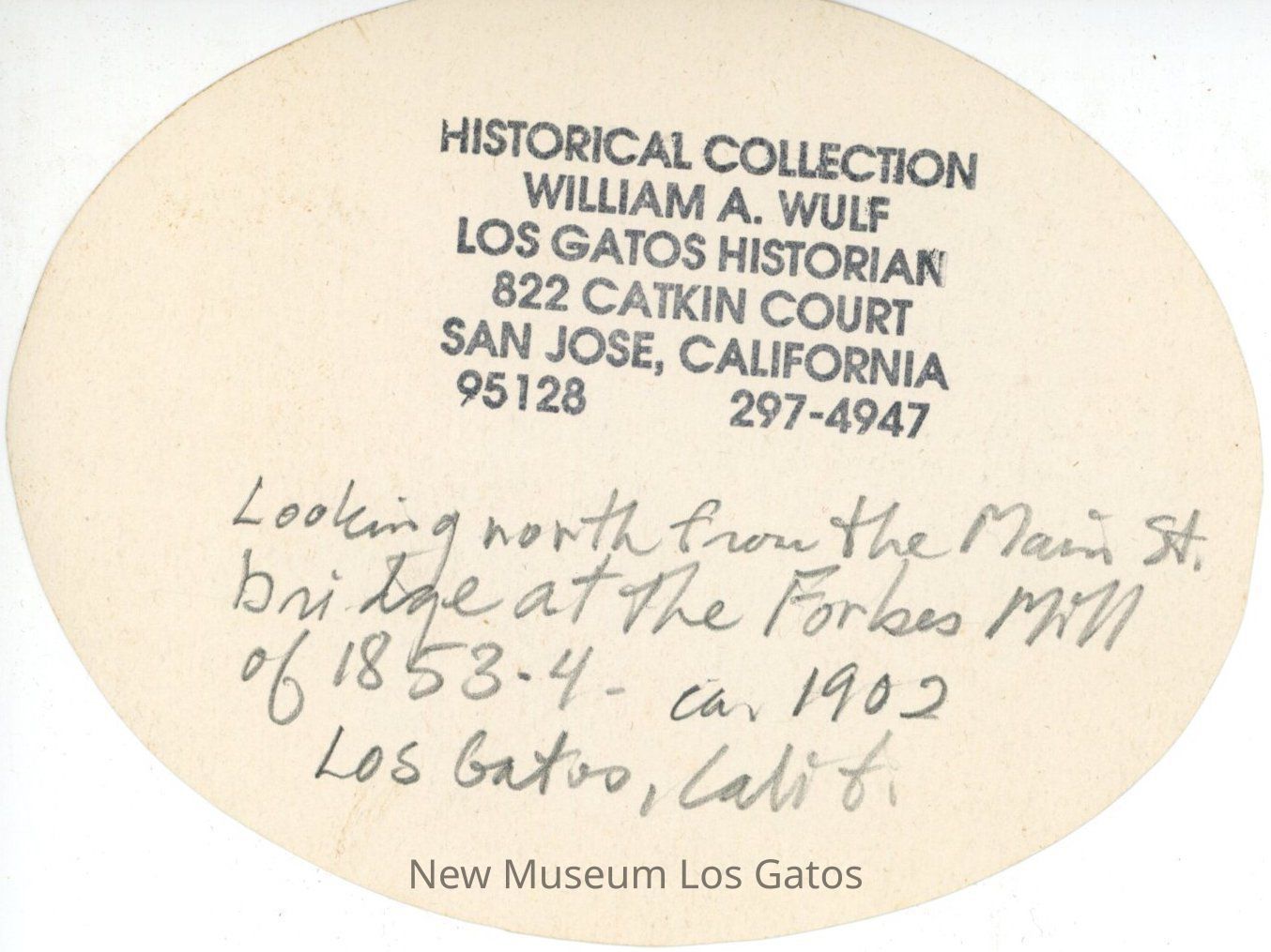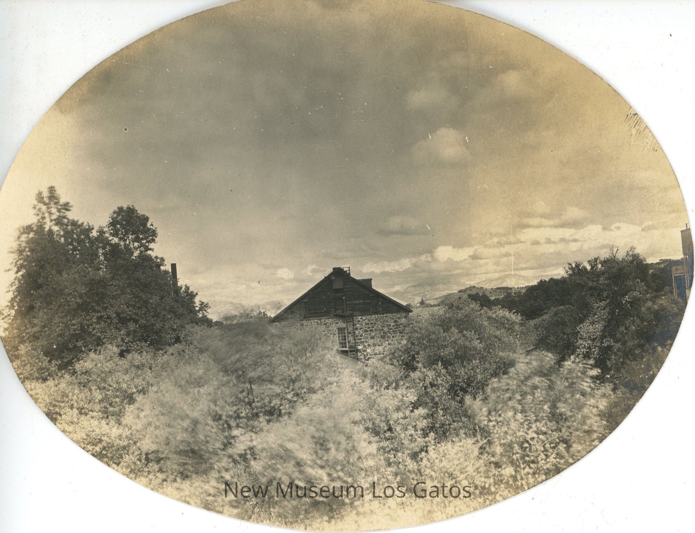 A black and white photograph of Forbes Mill, as it looked in the late 1880s when it was operated as the Los Gatos Manufacturing Company. Only the top of the mill from the south side is visible through the leaves of numerous trees. There is part of another structure visible along the right edge of the image. The photograph is cut into an oval shape.