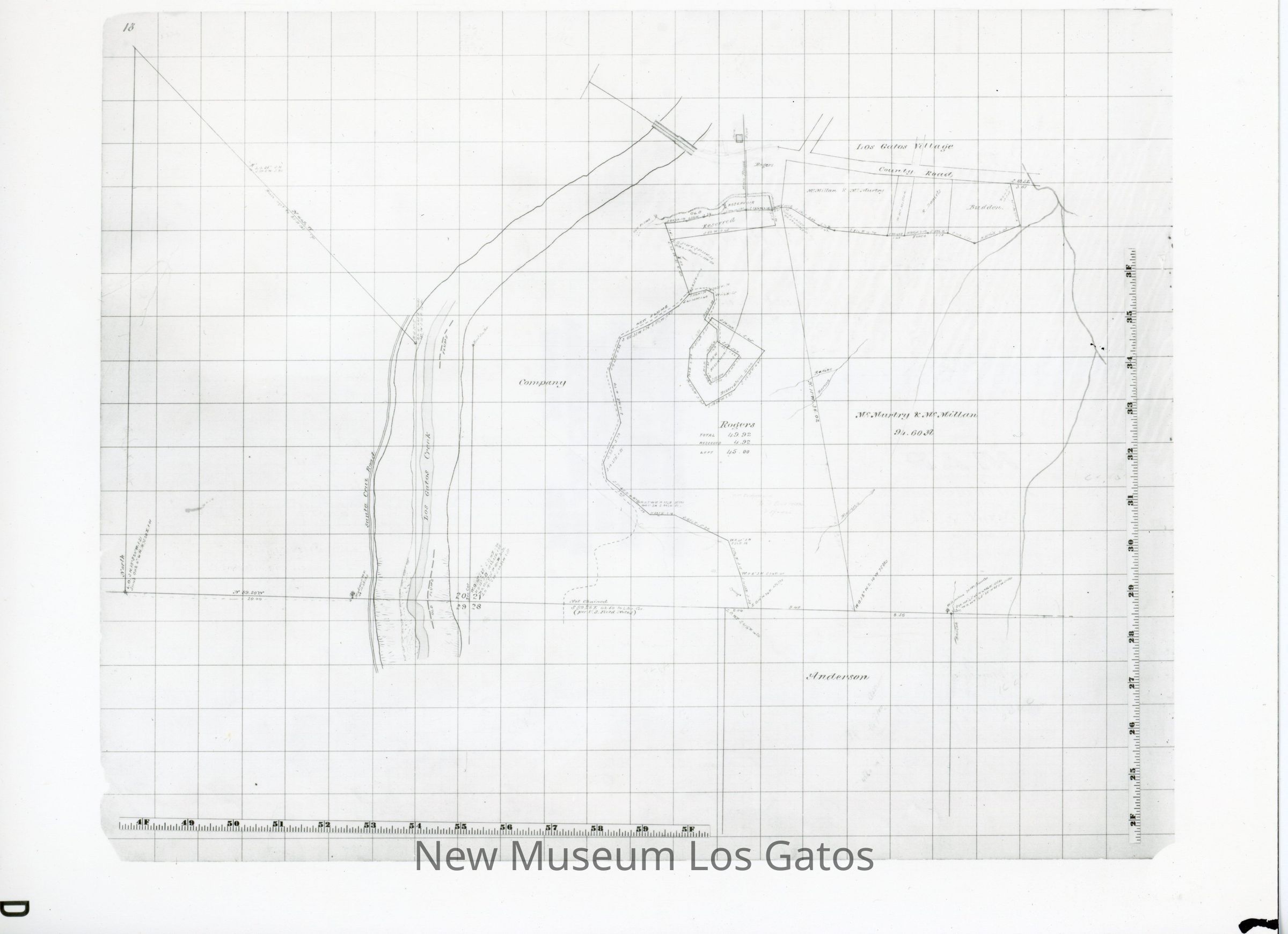 A glossy, black and white photograph of a map of the area surrounding the Santa Rosa Flour Mill and the Los Gatos Creek.
