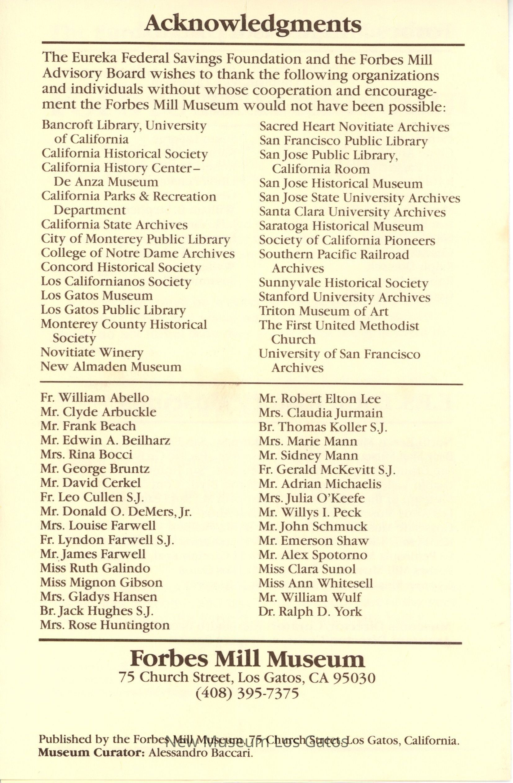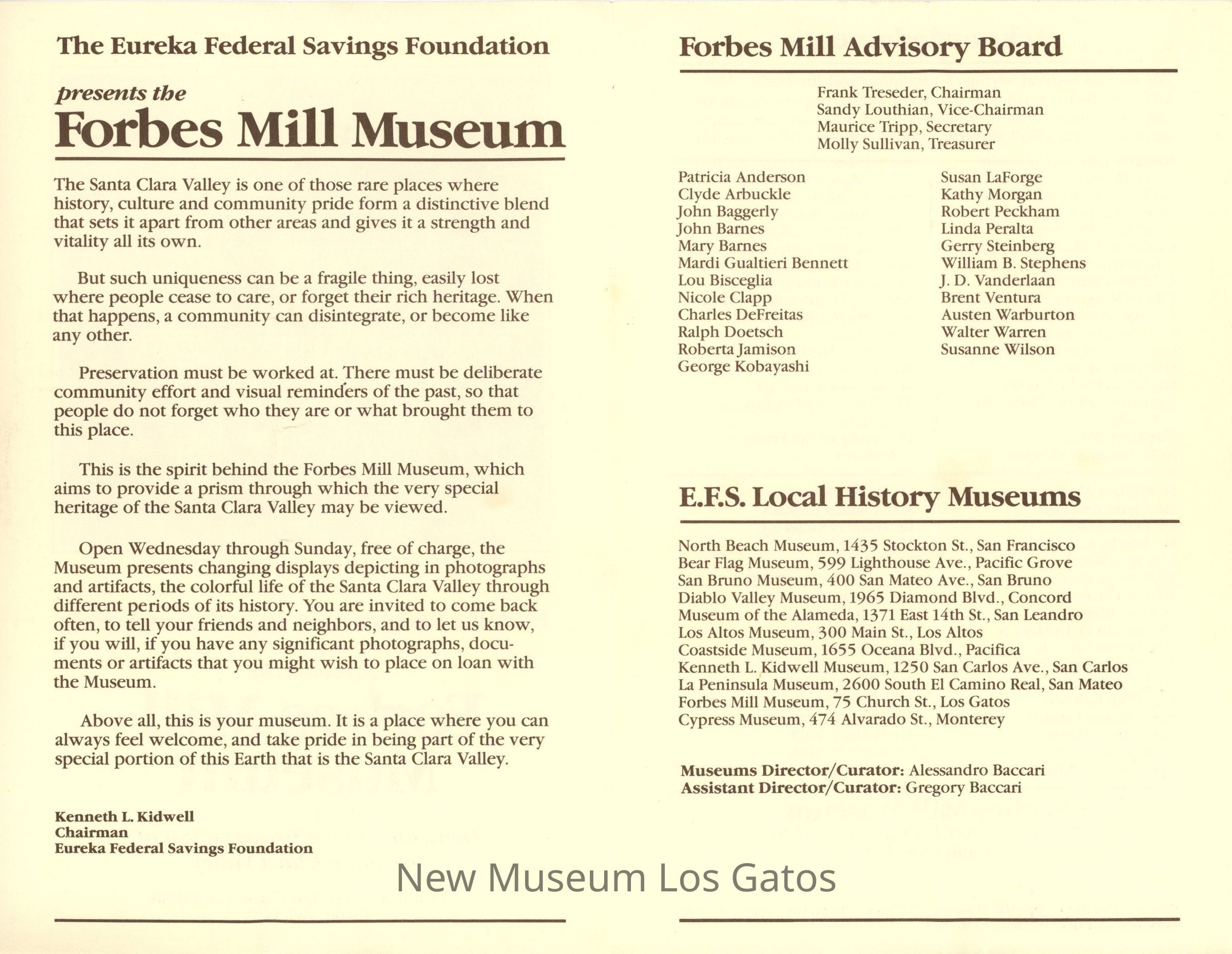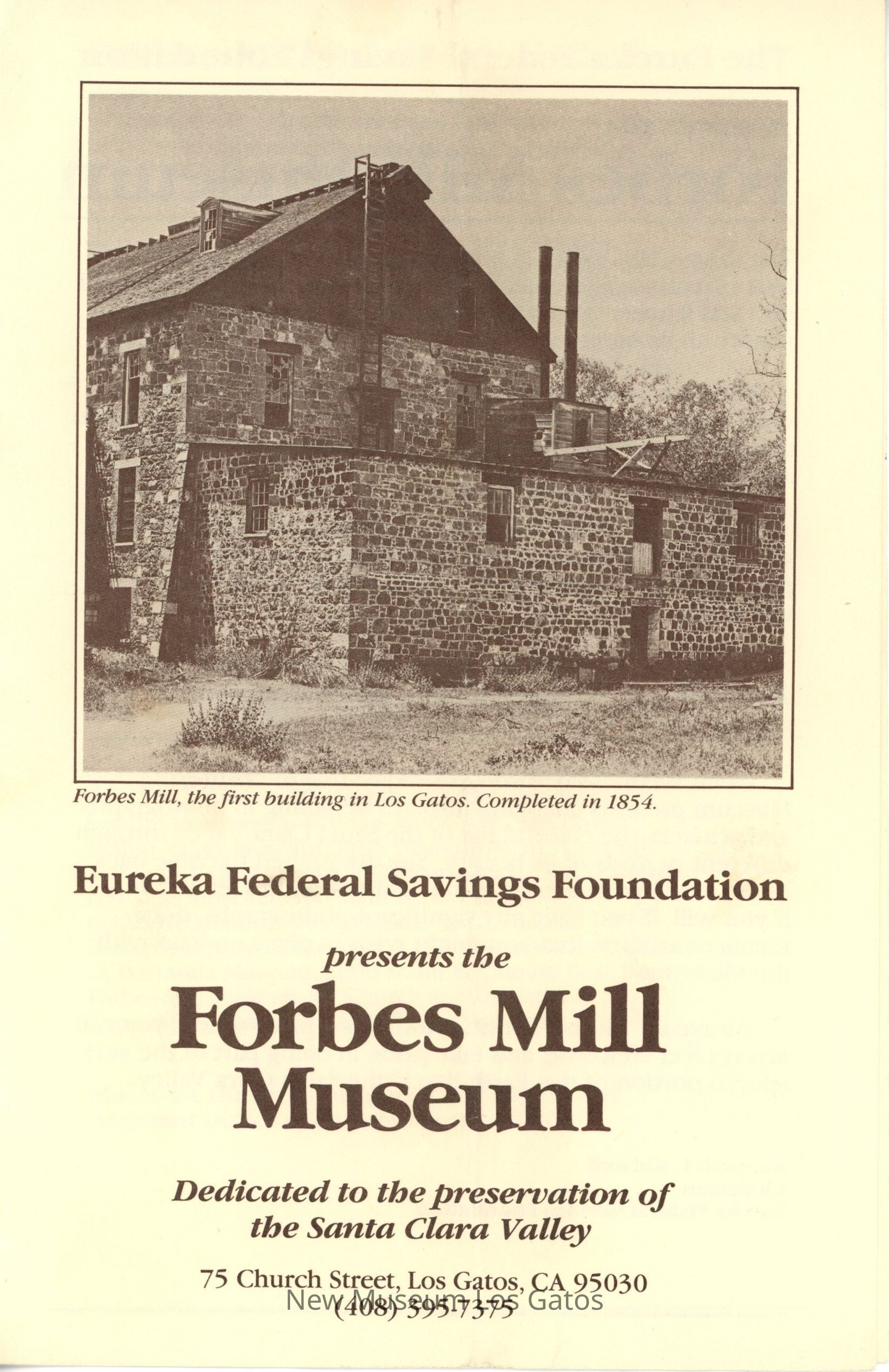 A bi-folded pamphlet about the Forbes Mill Museum, with a note from the Eureka Federal Savings Foundation, as well as a list of the Board, and a list of other E.F.S. local history museums. The front cover features an image of Forbes Mill.Collection