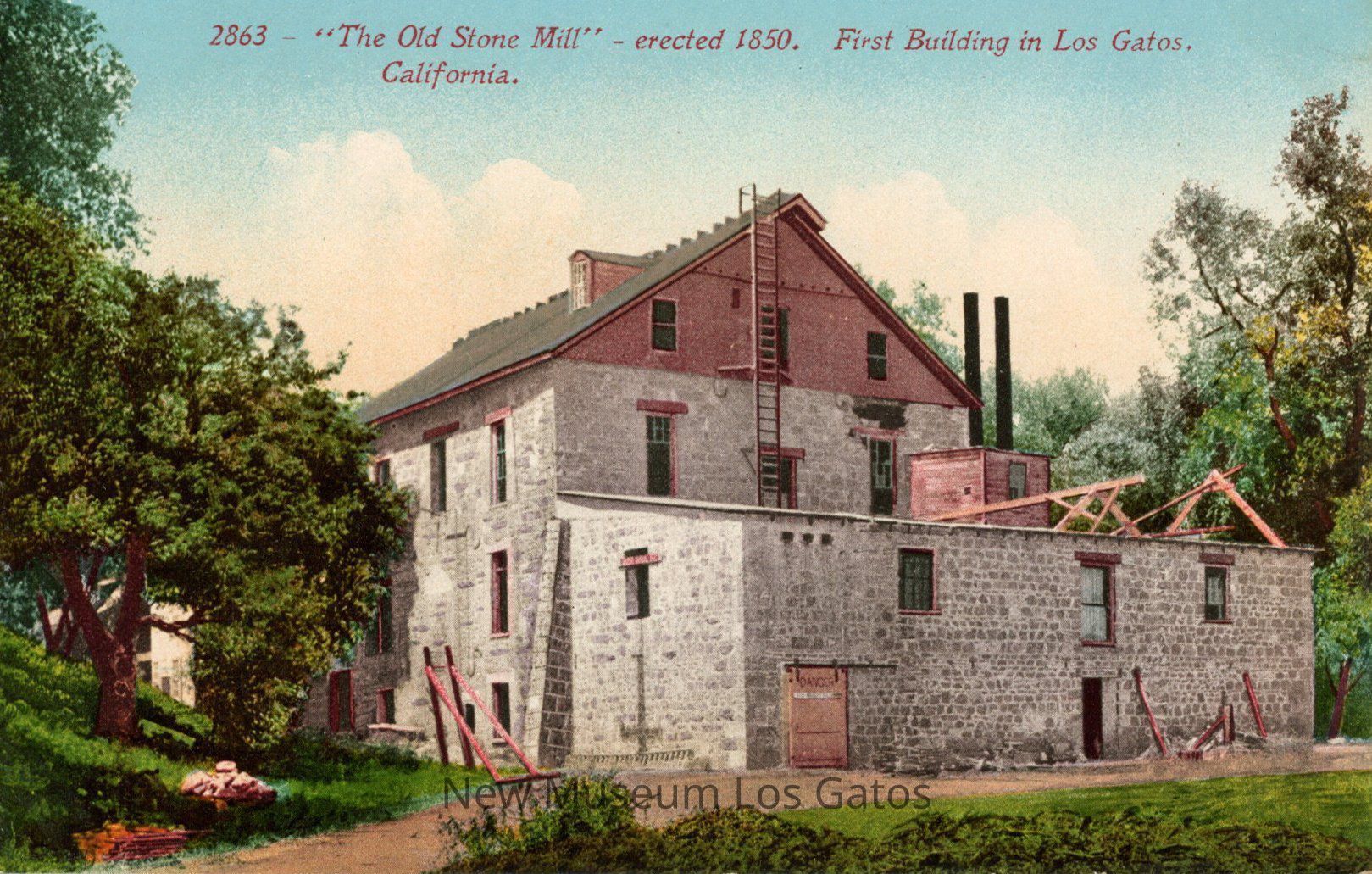 Four postcards featuring a color illustration of Forbes Mill. In the illustration, Forbes Mill is centered, with trees off to the left of the mill. Three of the postcards feature an inscription along the top, with a mill that has red/brown tones. The fourth postcard does not have the inscription, and the mill has brown/gray tones. None of the postcards have been mailed.Subject Place