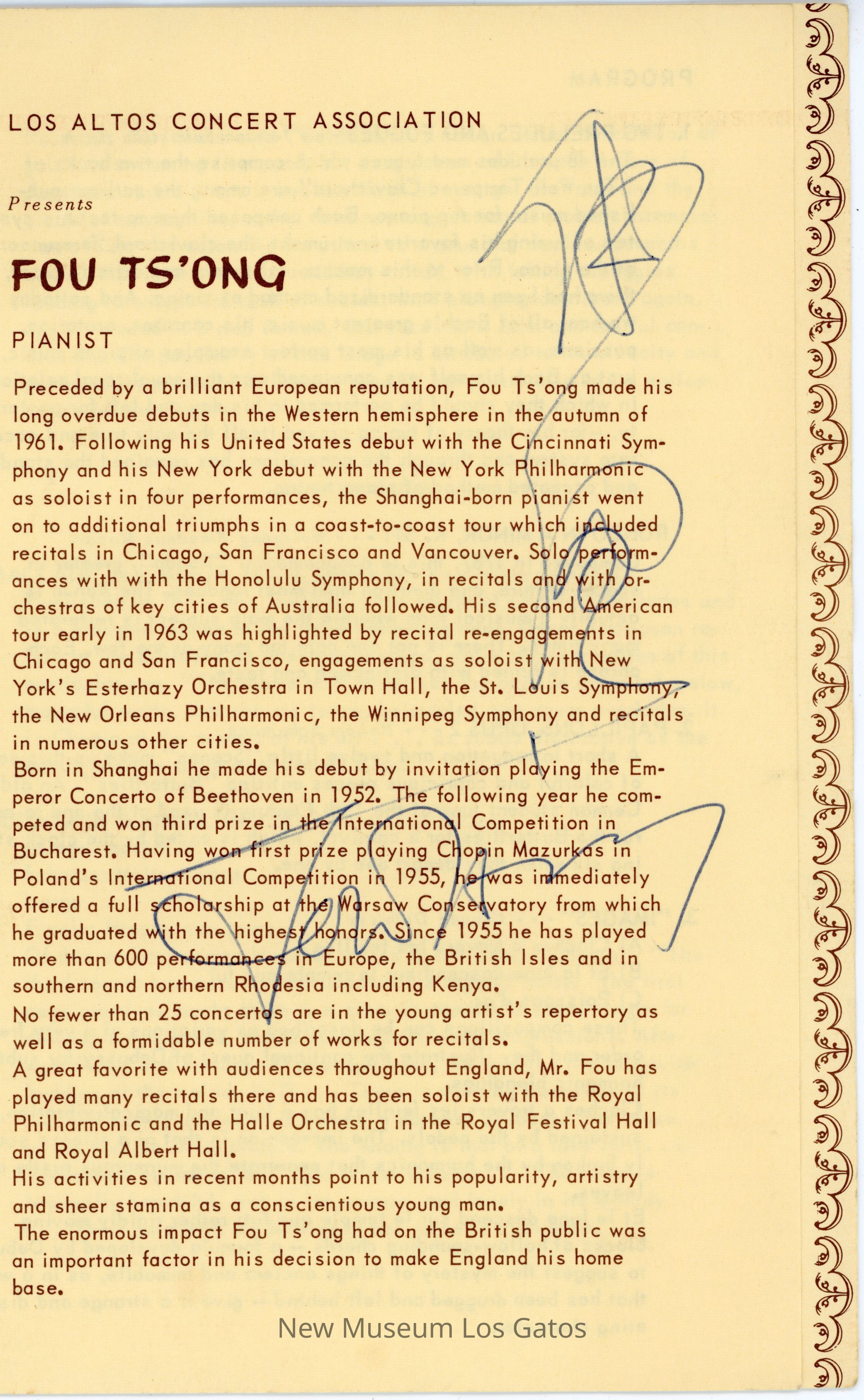 A program for pianist, Fou Ts'ong, with the Los Altos Concert Association.Collection