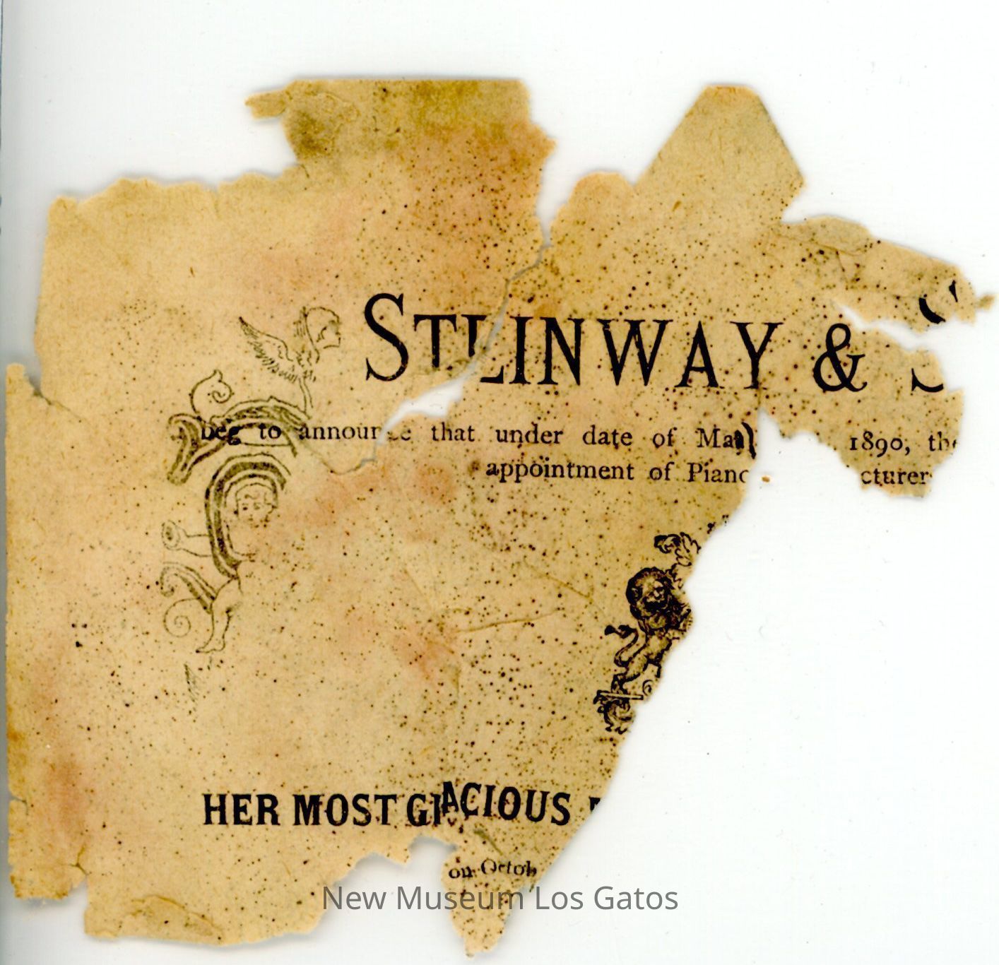 A fragment of an advertisement. The front side reads "Parlors" and is an advertisement for Singer Manufacturing Company home sewing machines. The back side is an advertisement for Steinway and Sons company.Collection