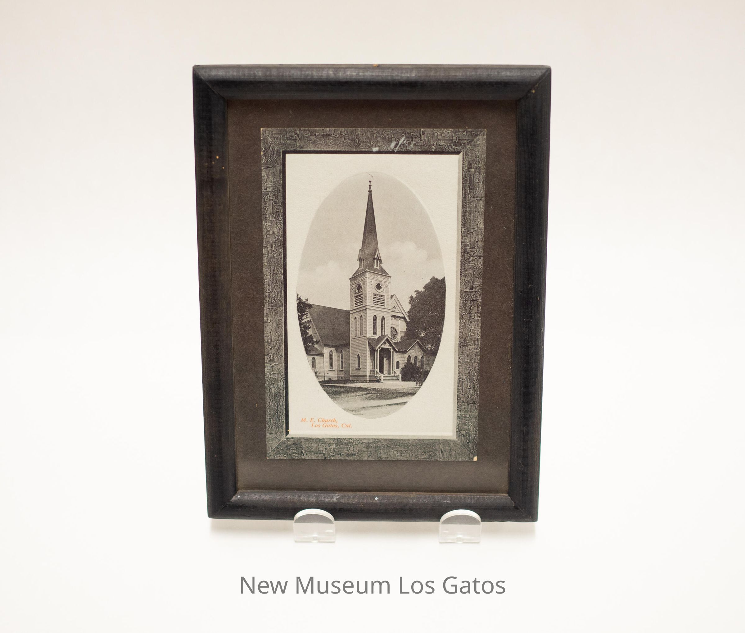 A black and white vignetted photograph of the Los Gatos Methodist Episcopal Church inside of a black wooden frame. The photograph is labeled in the lower left corner in red. The matte is dark gray, with a lighter, patterned gray strip directly bordering the photograph.Photograph Details