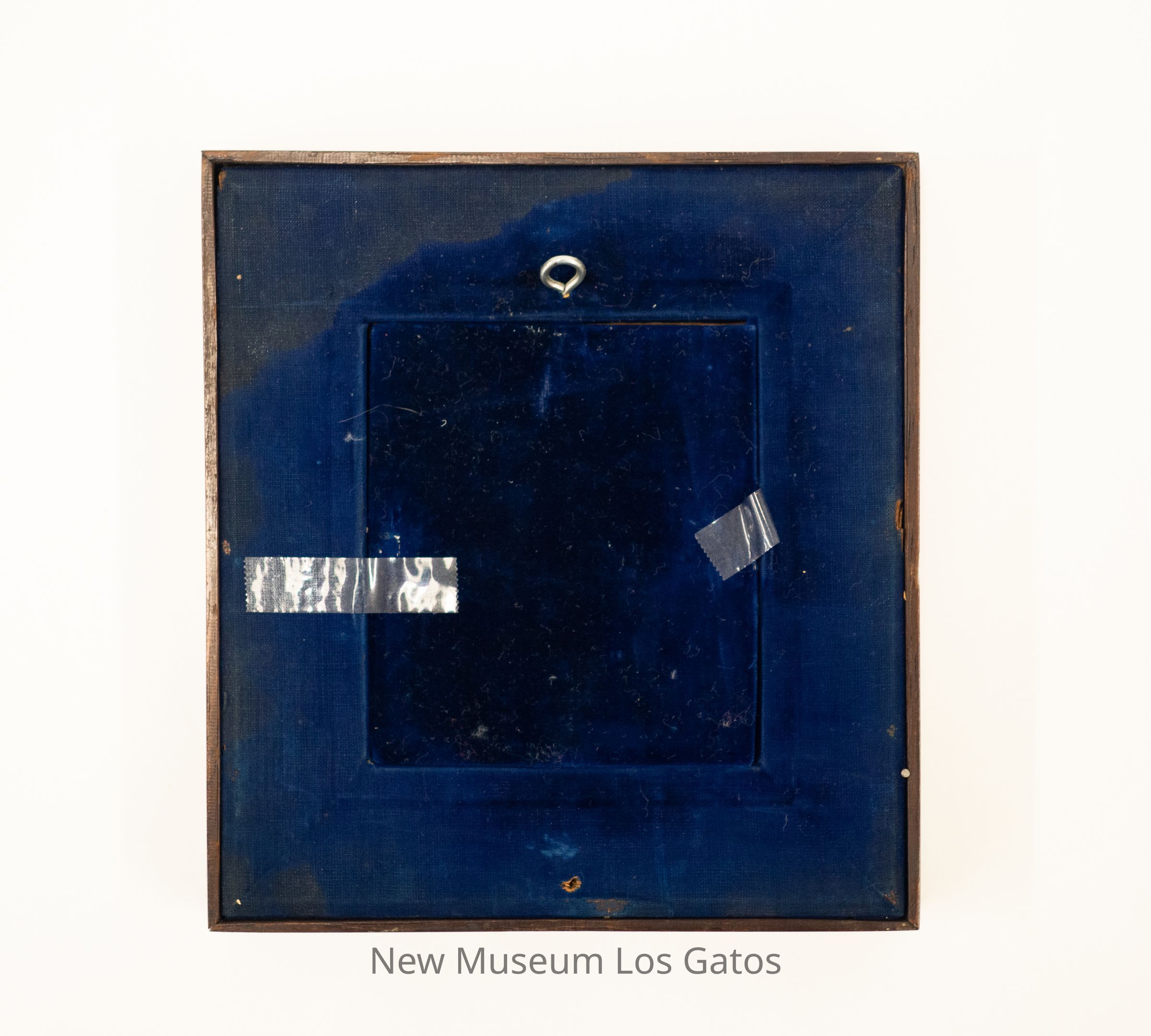 A black and white portrait of a boy, wearing a button-down jacket and holding a hat in his hands. The photograph is inside a small gilded frame, which itself is inside a wooden frame with a navy blue velvet matte. The back of the frame has a small silver hook, for hanging.